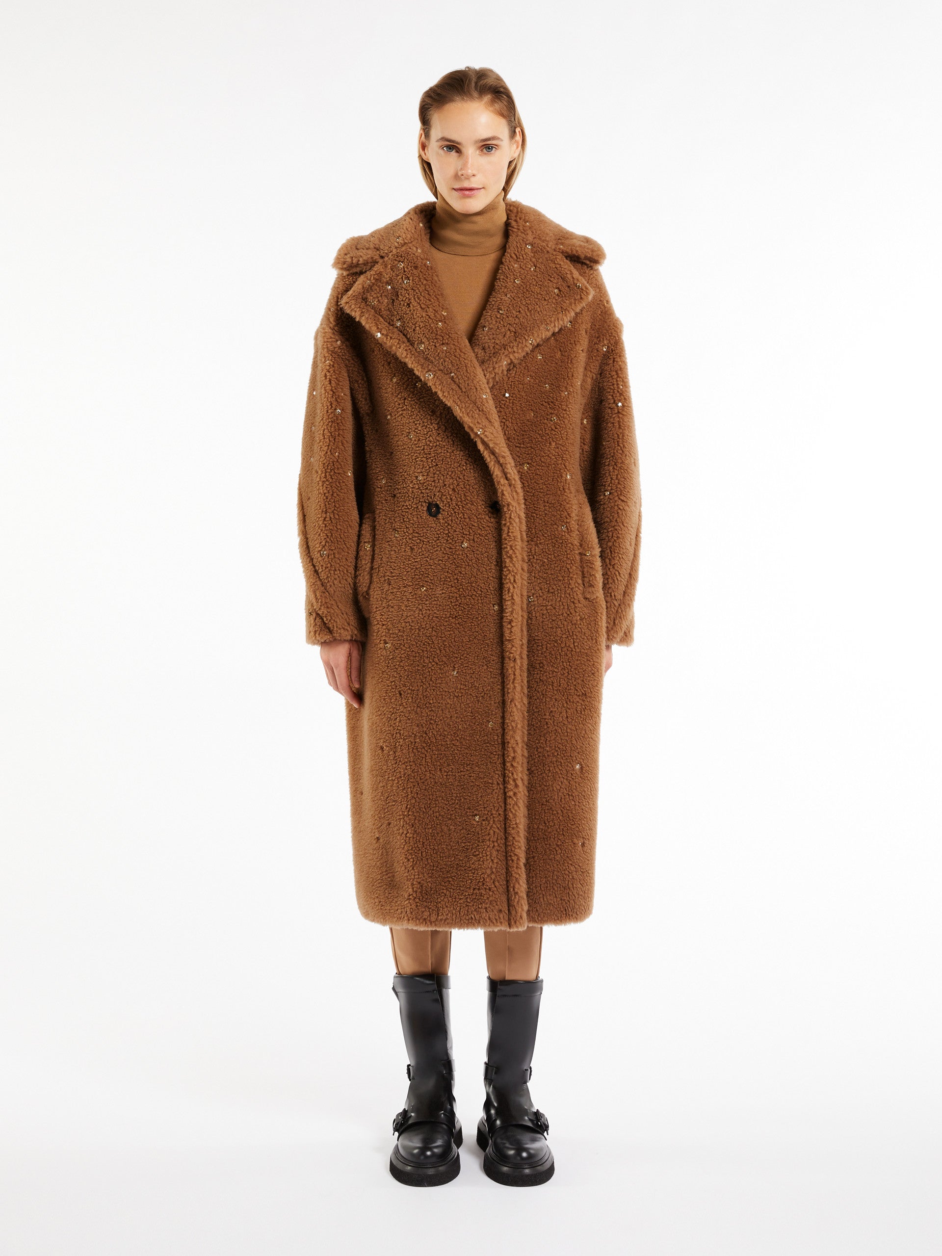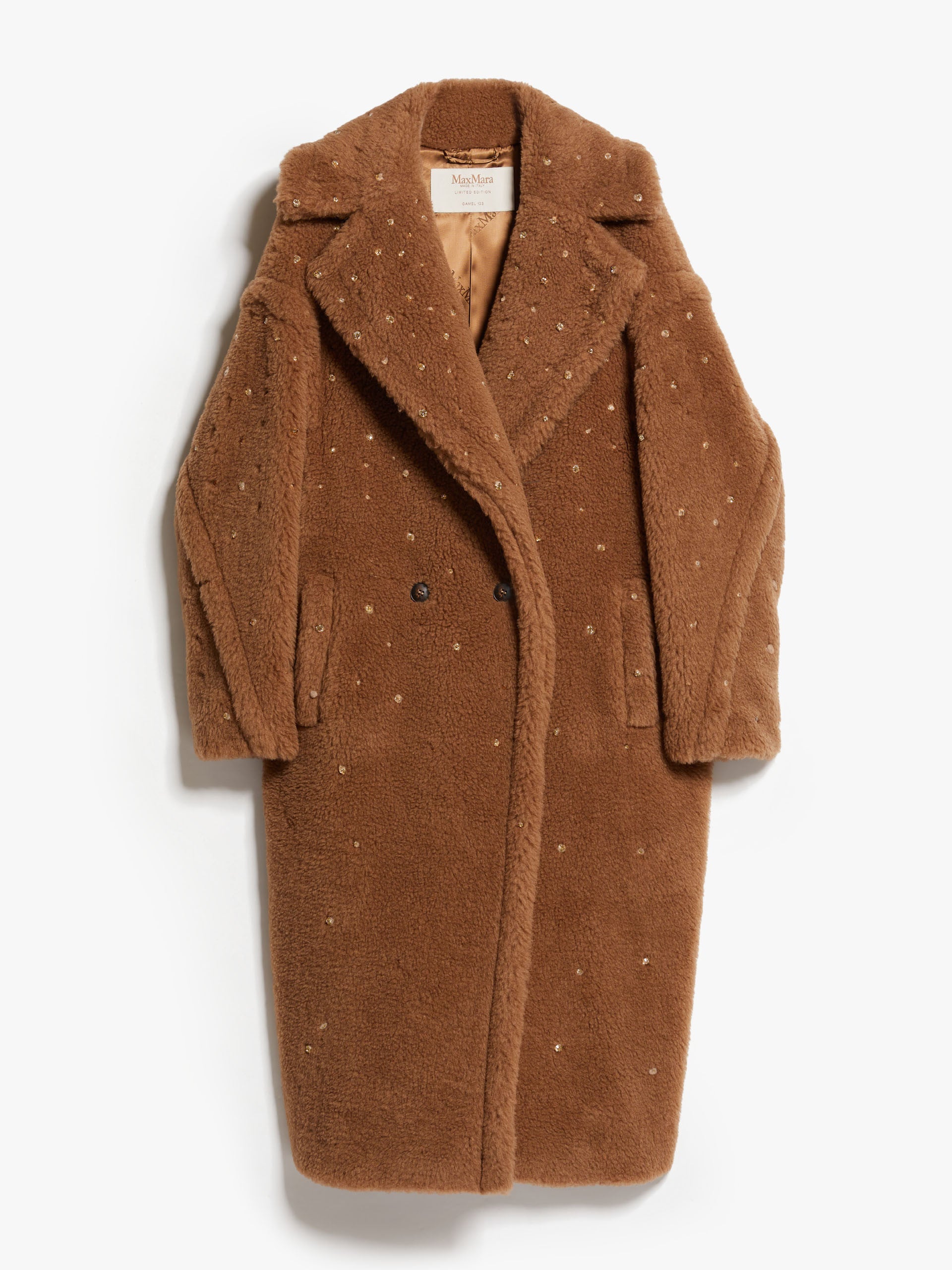 This year the fashion world's most loved Teddy celebrates an important birthday. The year 2023 marks ten beautifully chic years since the Teddy became the most loved It coat by women all over the world, thanks to an inspired combination that blends glamour and playfulness. Its special camel hair texture on a silk base is created using sophisticated technology developed by the creative team with an Italian supplier, capable of producing a unique faux fur. Available in a sparkling special occasion version with all-over rhinestones. The coat's abundant volume is a celebration of the opulent extravagance of this fabric.
