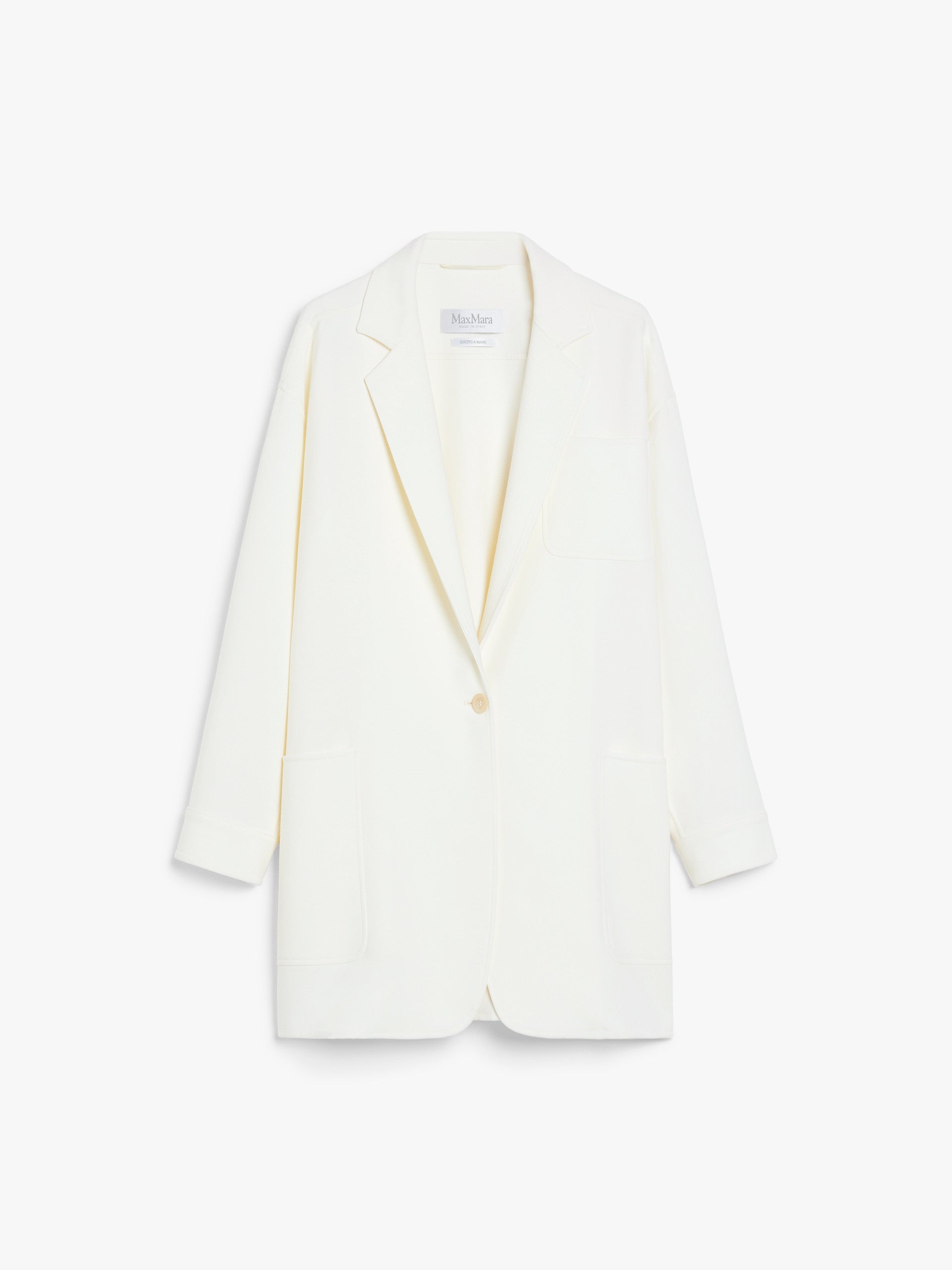 Single-breasted jacket with an oversized fit, made of stretch wool canvas double cloth partially sewn by hand. Straight-cut with classic lapel collar, long sleeves with dropped shoulders and shirt-style cuff with button. Unlined and finished with patch pockets on the front and a one-button front fastening.