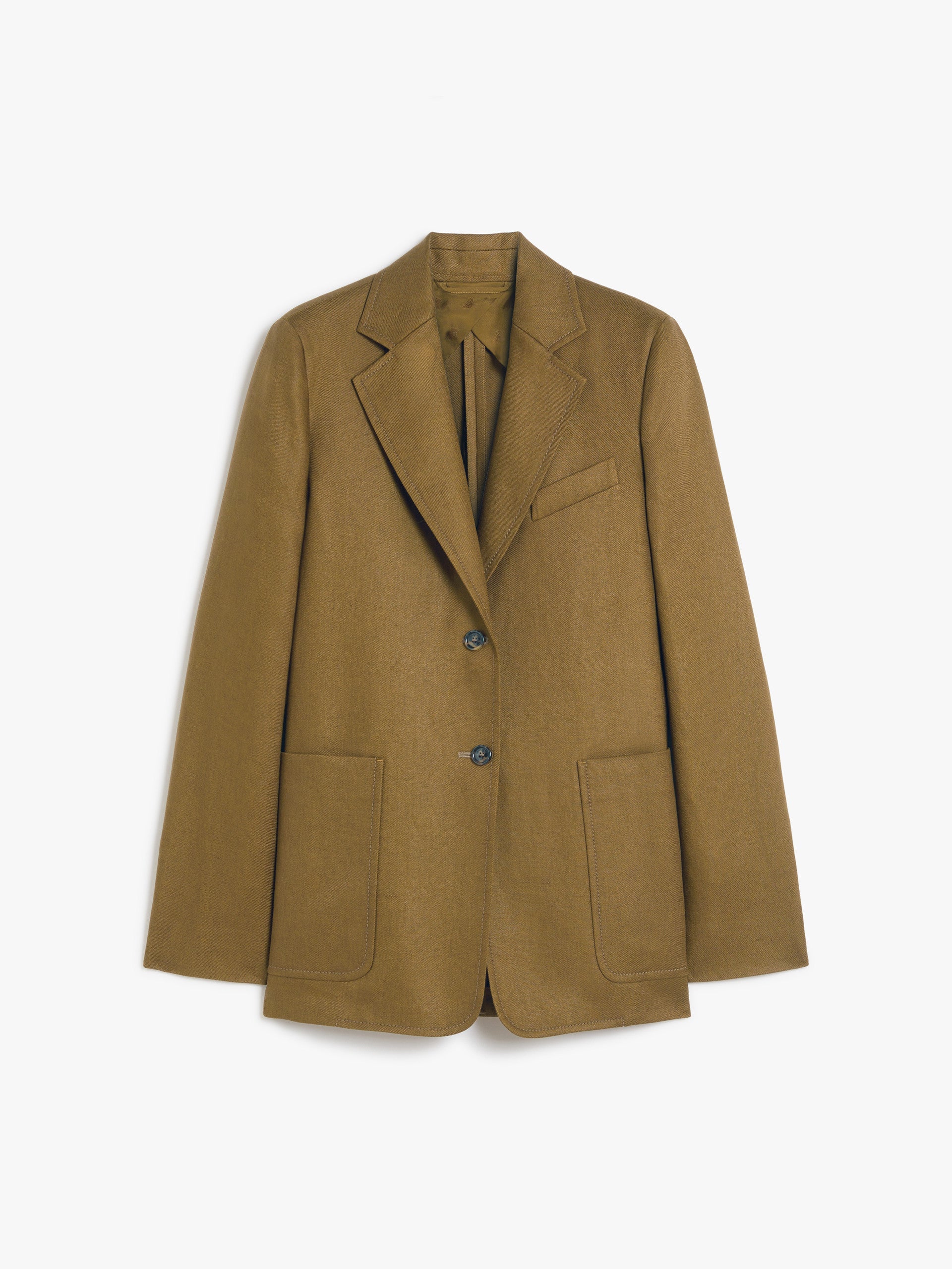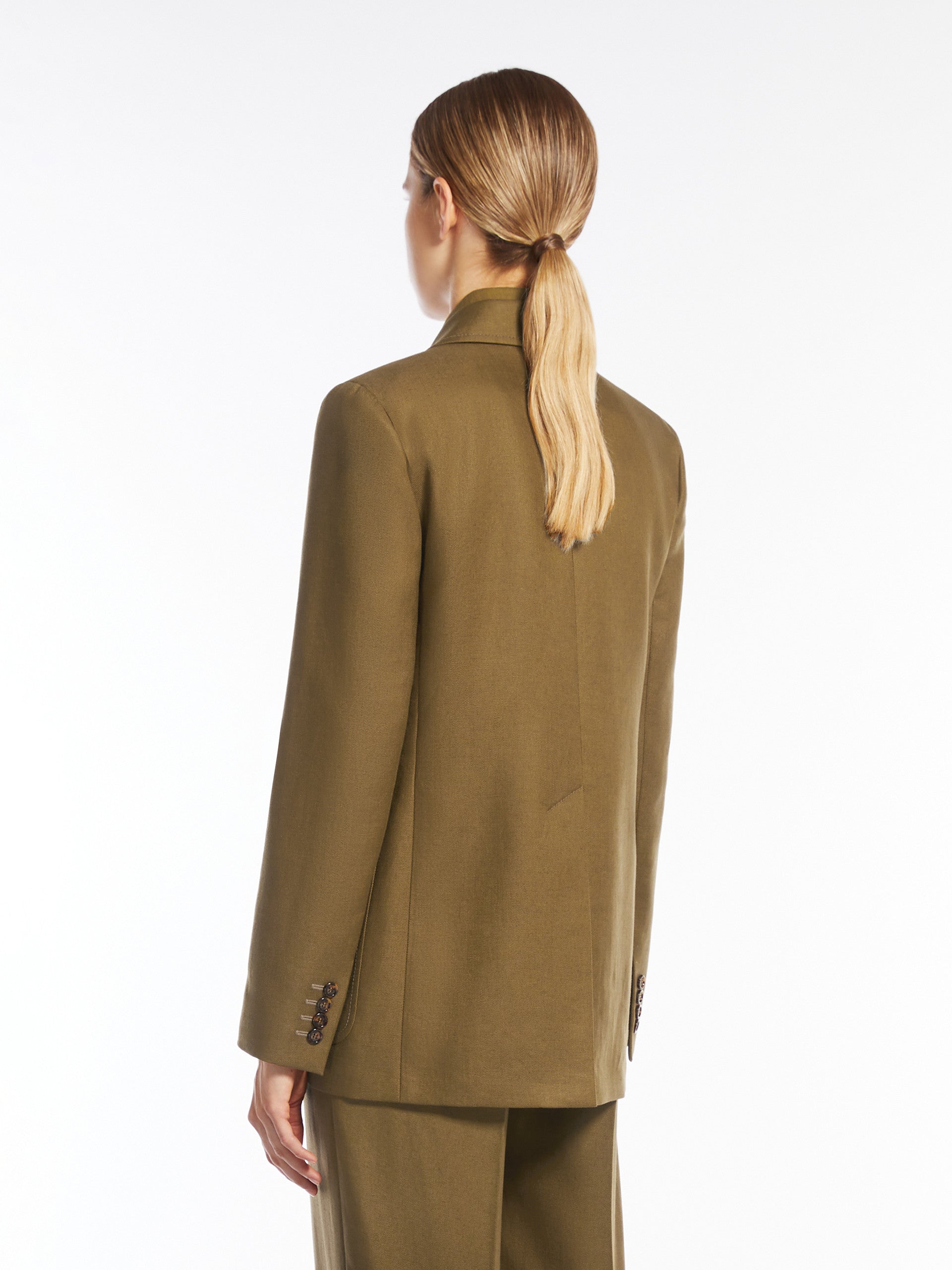 Single-breasted blazer with a semi-fitted silhouette, made of pure linen twill fabric. The style has a lapel collar, set-in sleeves with buttoned cuffs and front patch pockets. Embellished by a breast pocket and central vent on the back. Two-button front fastening.