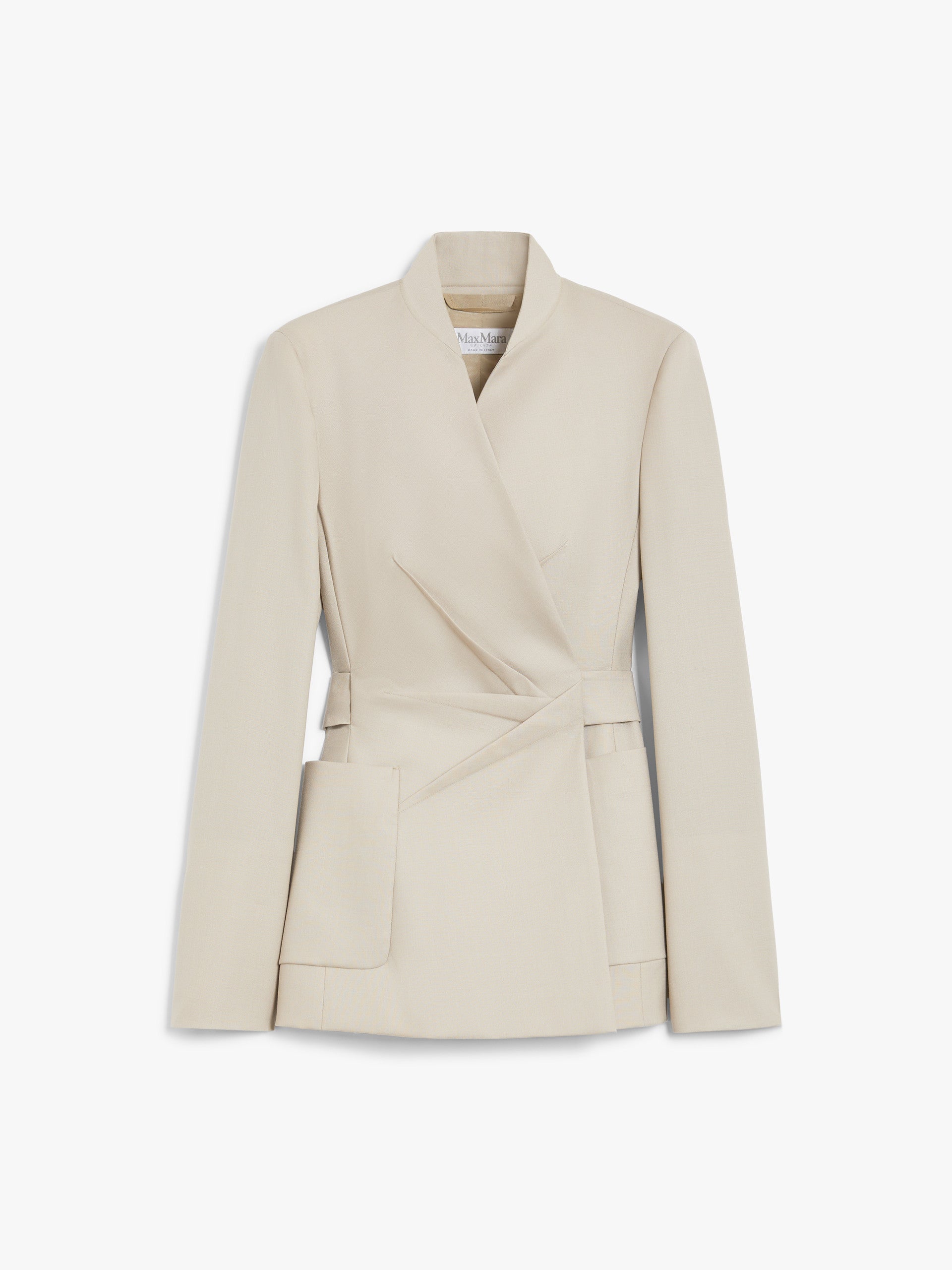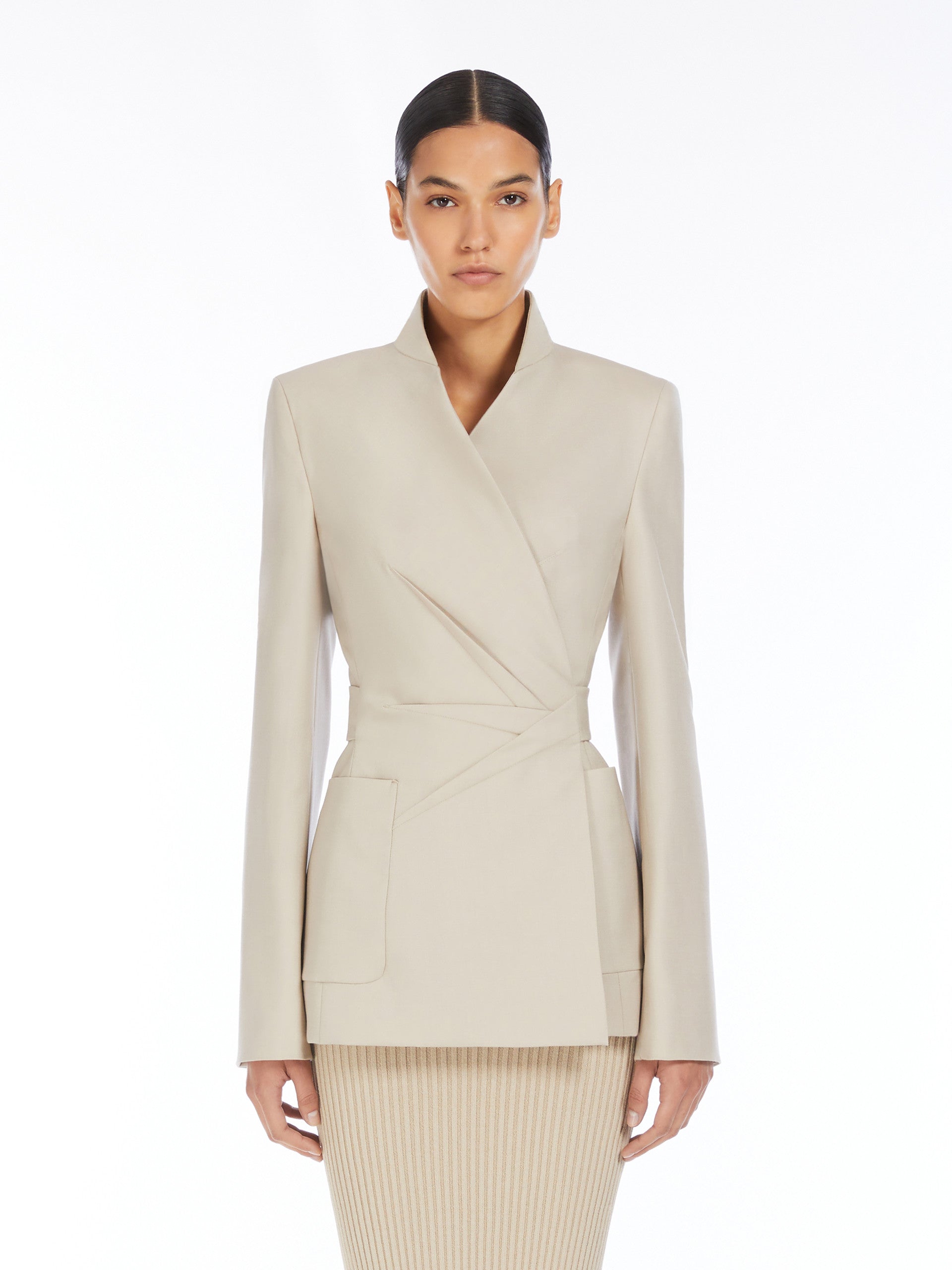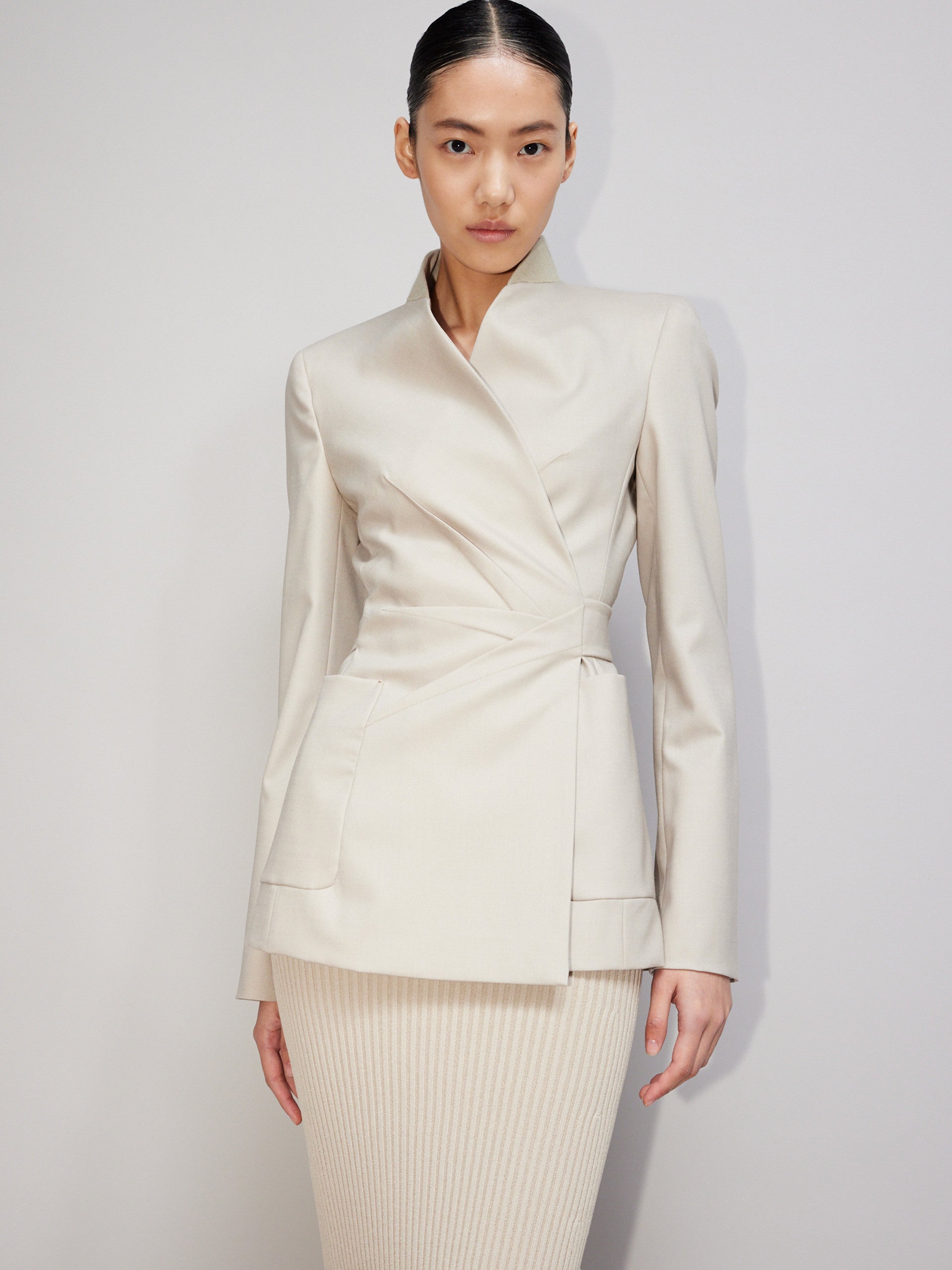 Women’s blazer in a luxurious combination of wool, mohair and silk. Lined garment featuring a silhouette wrapped over to the left side with a sash tied at the back, a mandarin collar and long set-in sleeves with a deep vent at the cuff. Featuring stitched pleat motif on the front, patch pockets and lateral vents at the back.