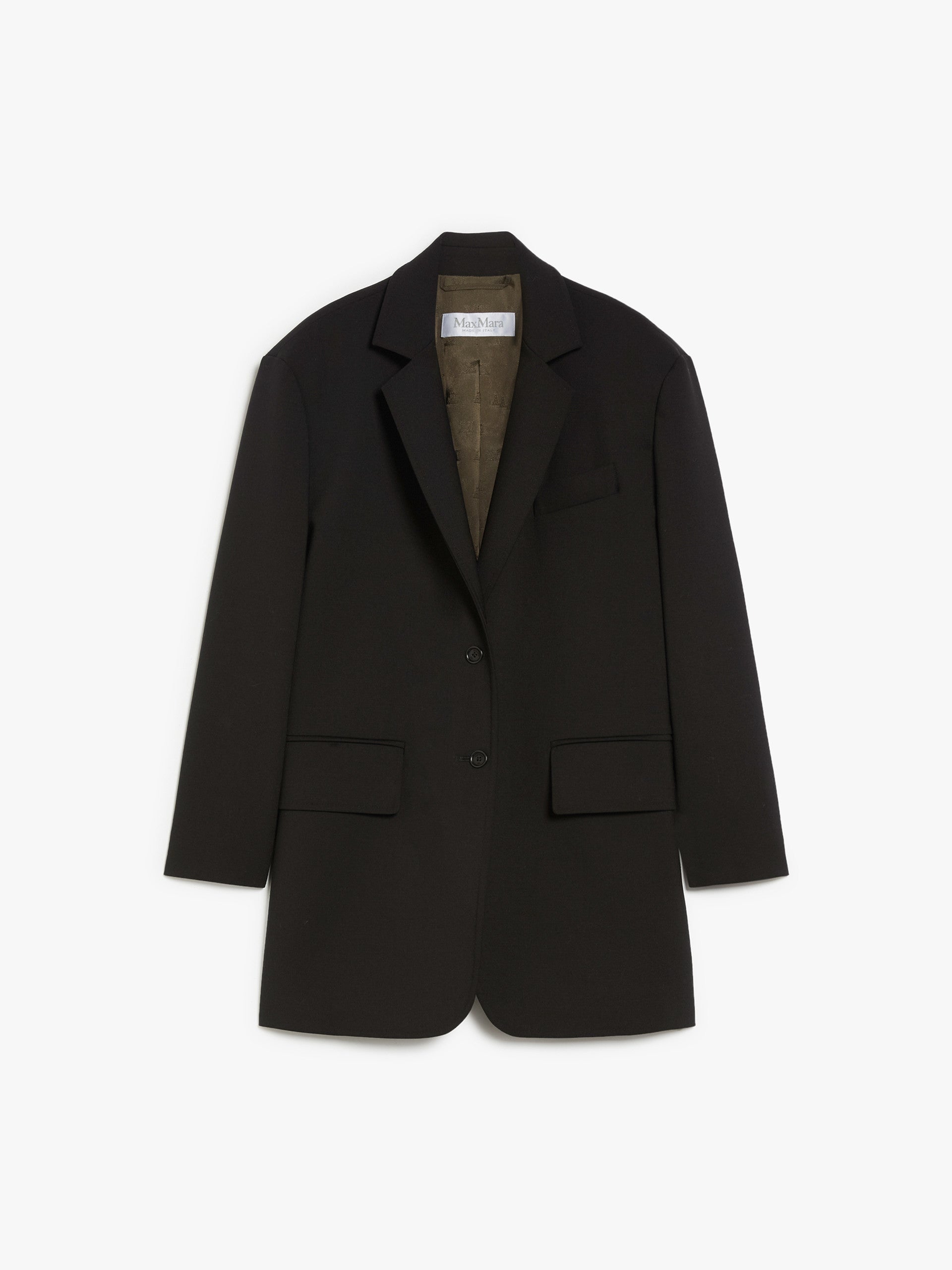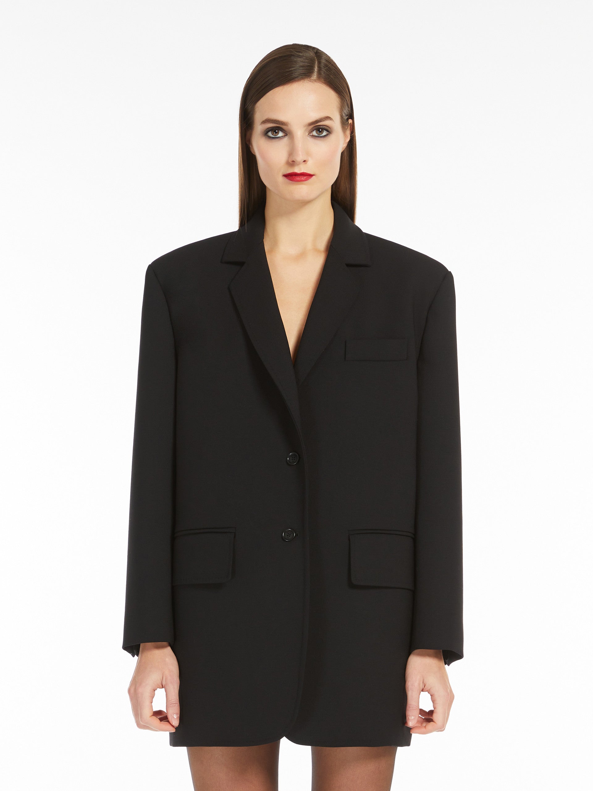 Straight-line single-breasted blazer, made of exquisite wool double crêpe. The garment features an oversized, straight silhouette with lapel collar, set-in sleeves with slit and buttons at the cuff, and patch pockets with flap on the front. Lined in contrasting Monogram jacquard fabric, it features a slightly slanted chest pocket and front closure with two matching visible buttons.