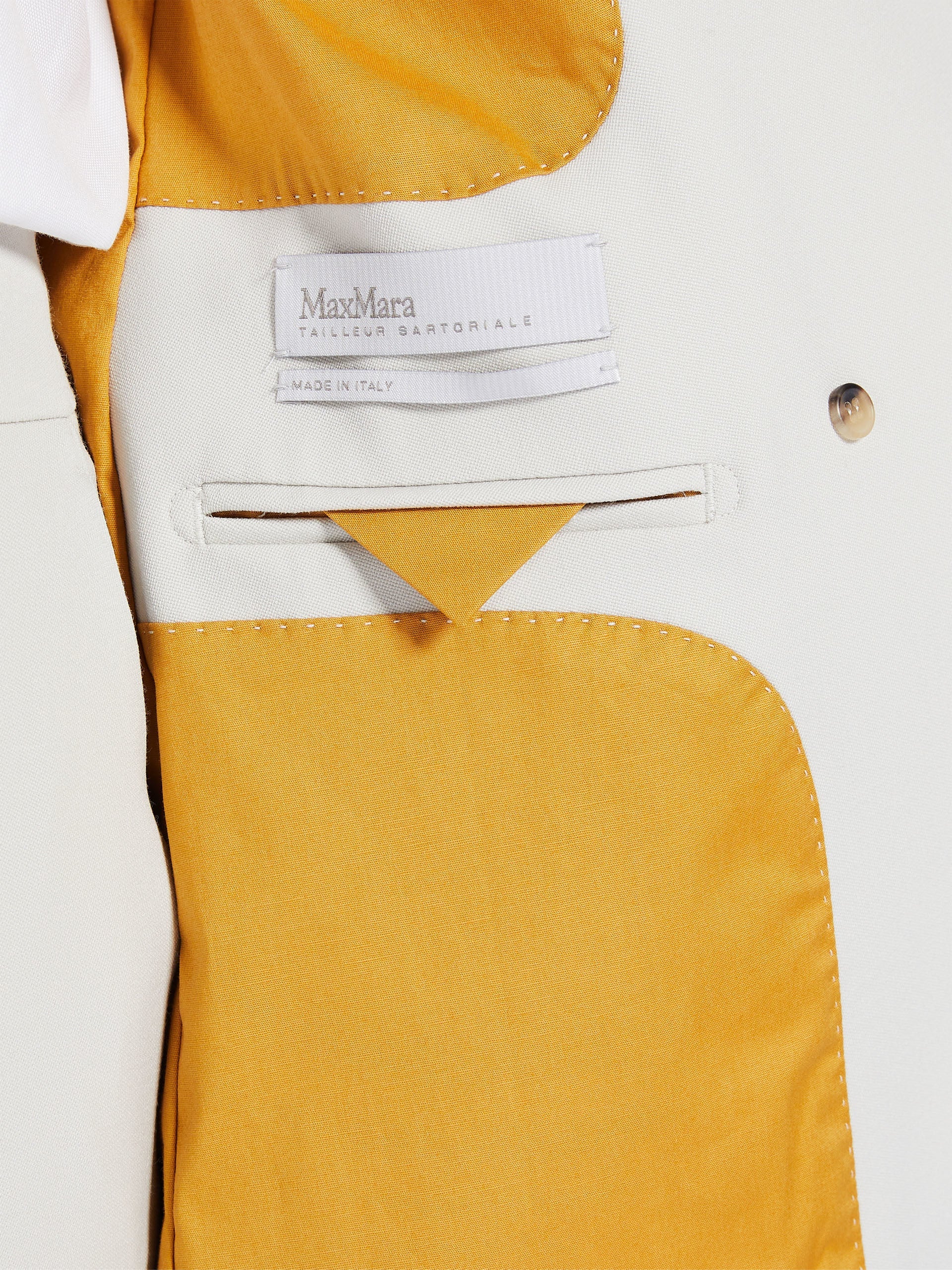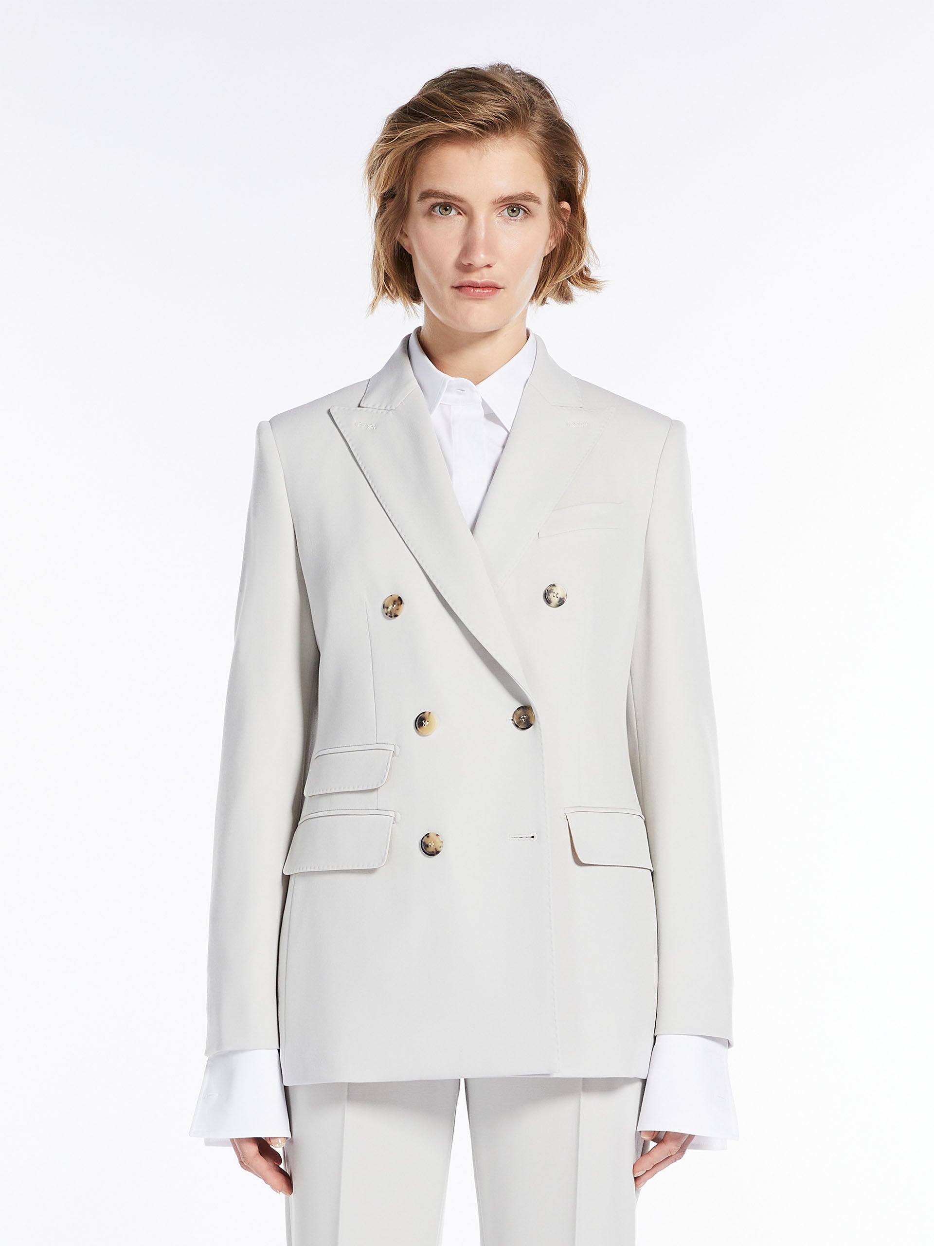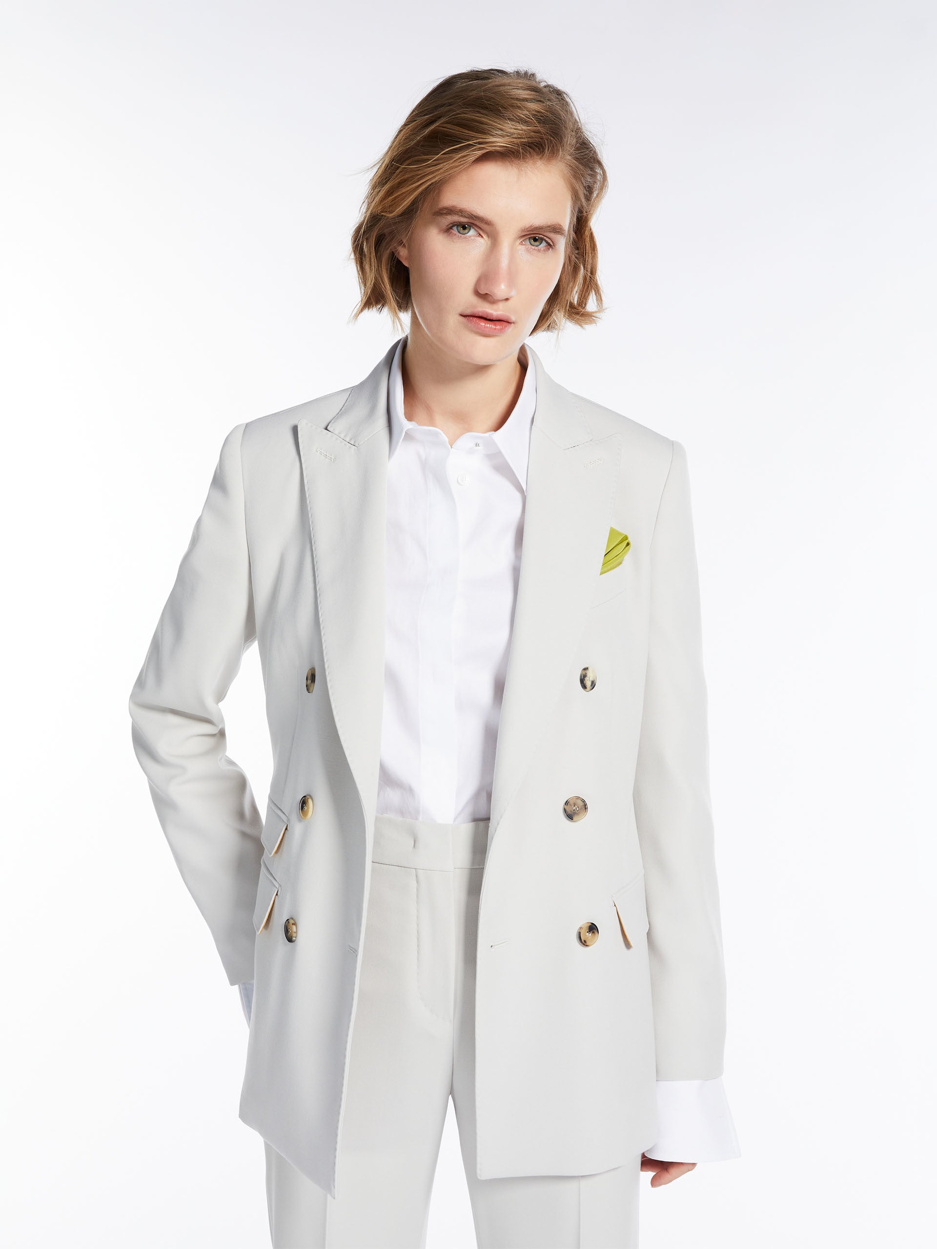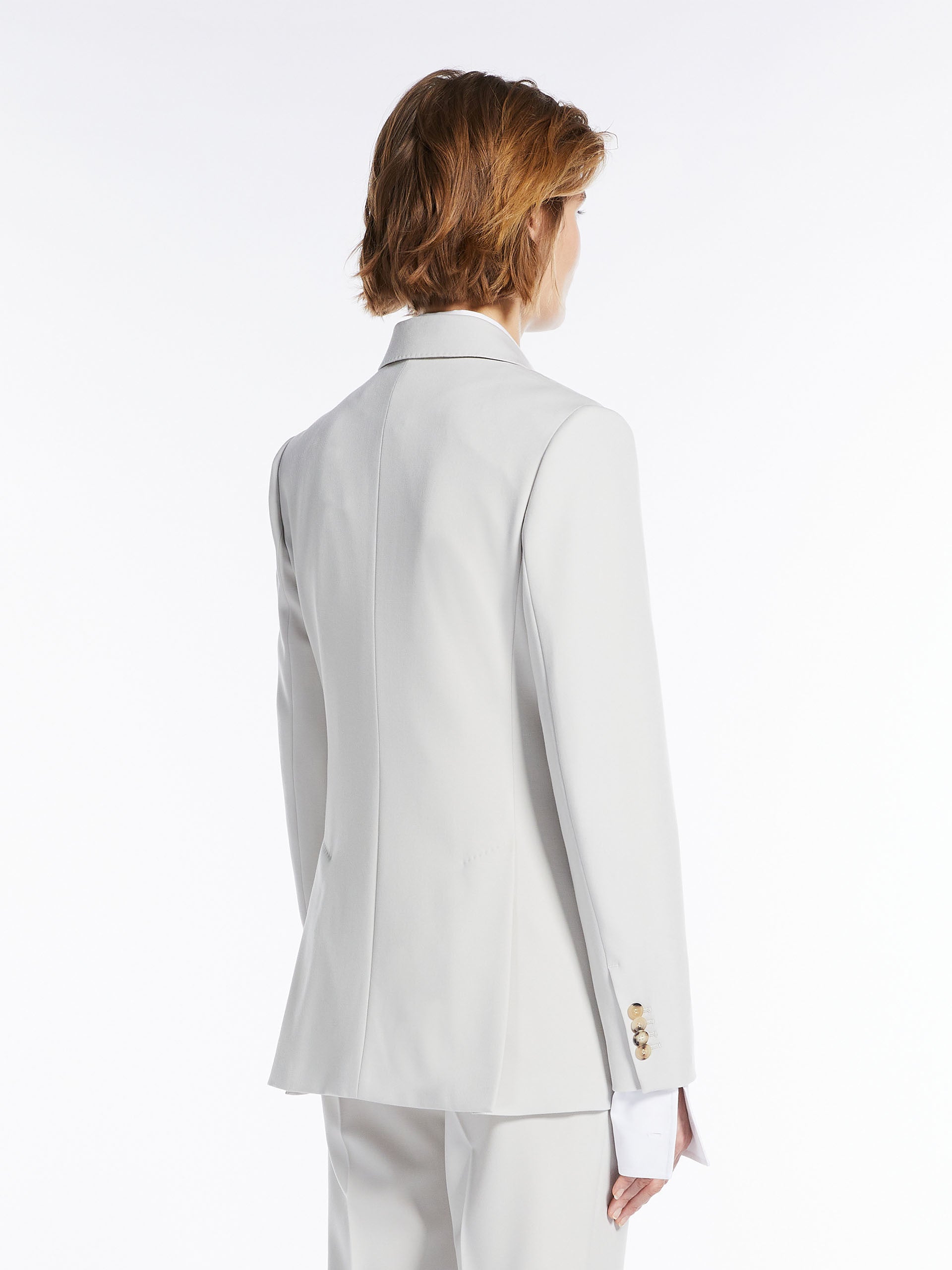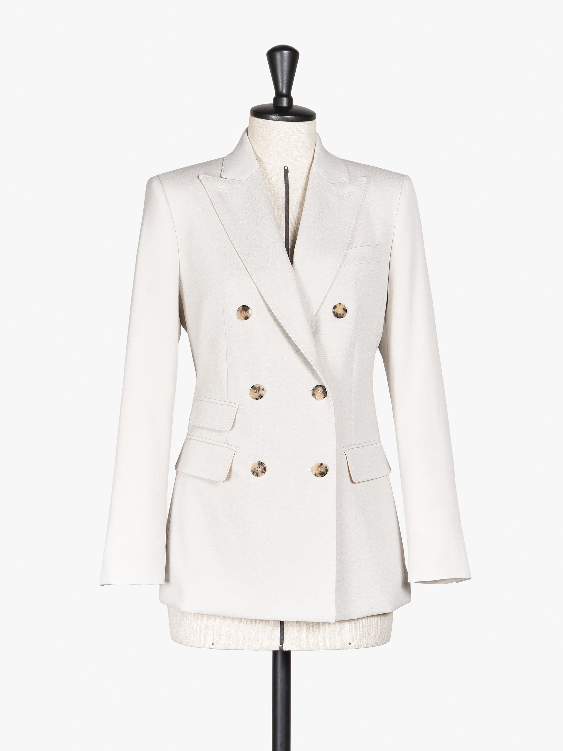Double-breasted blazer made of fine, slightly elastic granité wool. The fabric, made from combed wool fibres that are extremely soft to the touch and have a refined look, boasts a wavy, semi-matte texture suitable for all seasons. The full canvas construction has a peak lapel collar, a masculine breast pocket, three flap pockets on the front and double vents on the back. Semi-lined with stretch cupro blend fabric in a contrasting colour. Horn button fastening. Length: 70 cm.