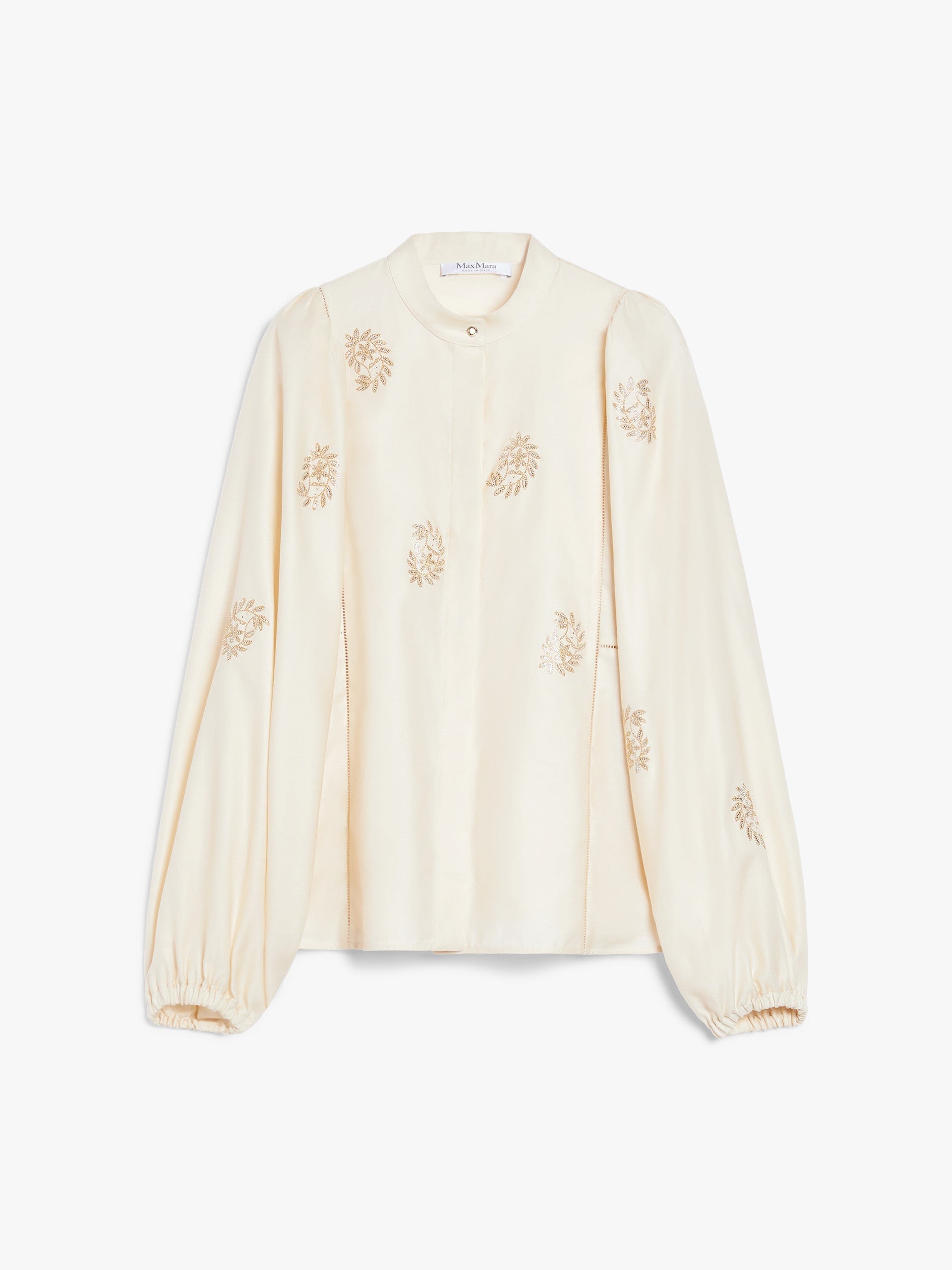 Shirt made of lightweight pure cotton satin. The placement embroideries on the front and sleeves create a dynamic effect thanks to their different direction, while the inlaid trimming details embellish the garment on the front and back. The garment features a mandarin collar and long, wide balloon sleeves with elastic cuff and gathered shoulder. Featuring small rounded slits at the hem. Concealed button fastening at the front.