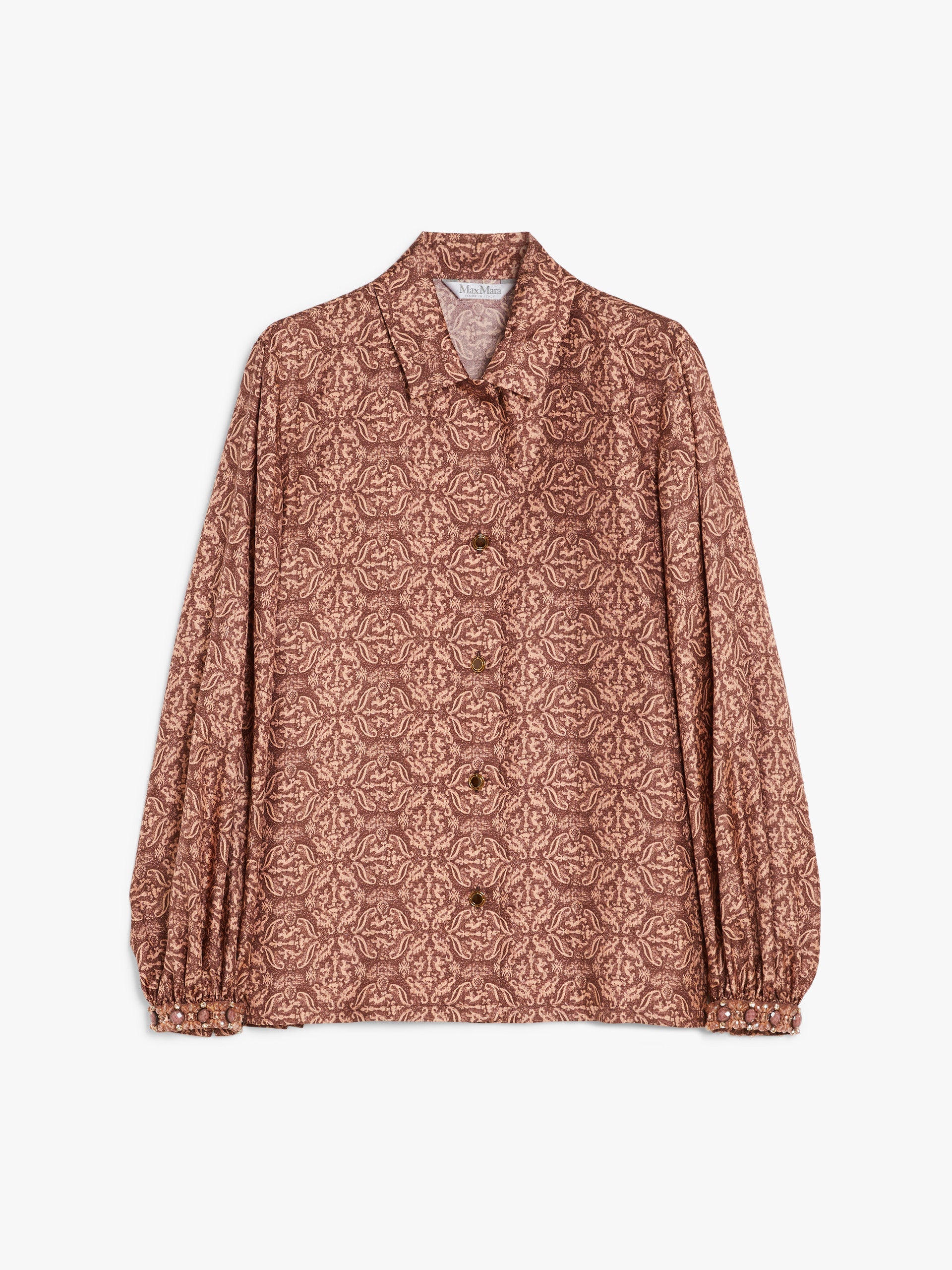 Semi-fitted men’s-style shirt made from exquisite pure silk twill. It is customised with an all-over jacquard-effect print and cuffs decorated with crystal and gemstone embroidery. Finished with a classic pointed collar, dropped shoulder long, wide sleeves and square side slits at the hem. Visible button fastening.