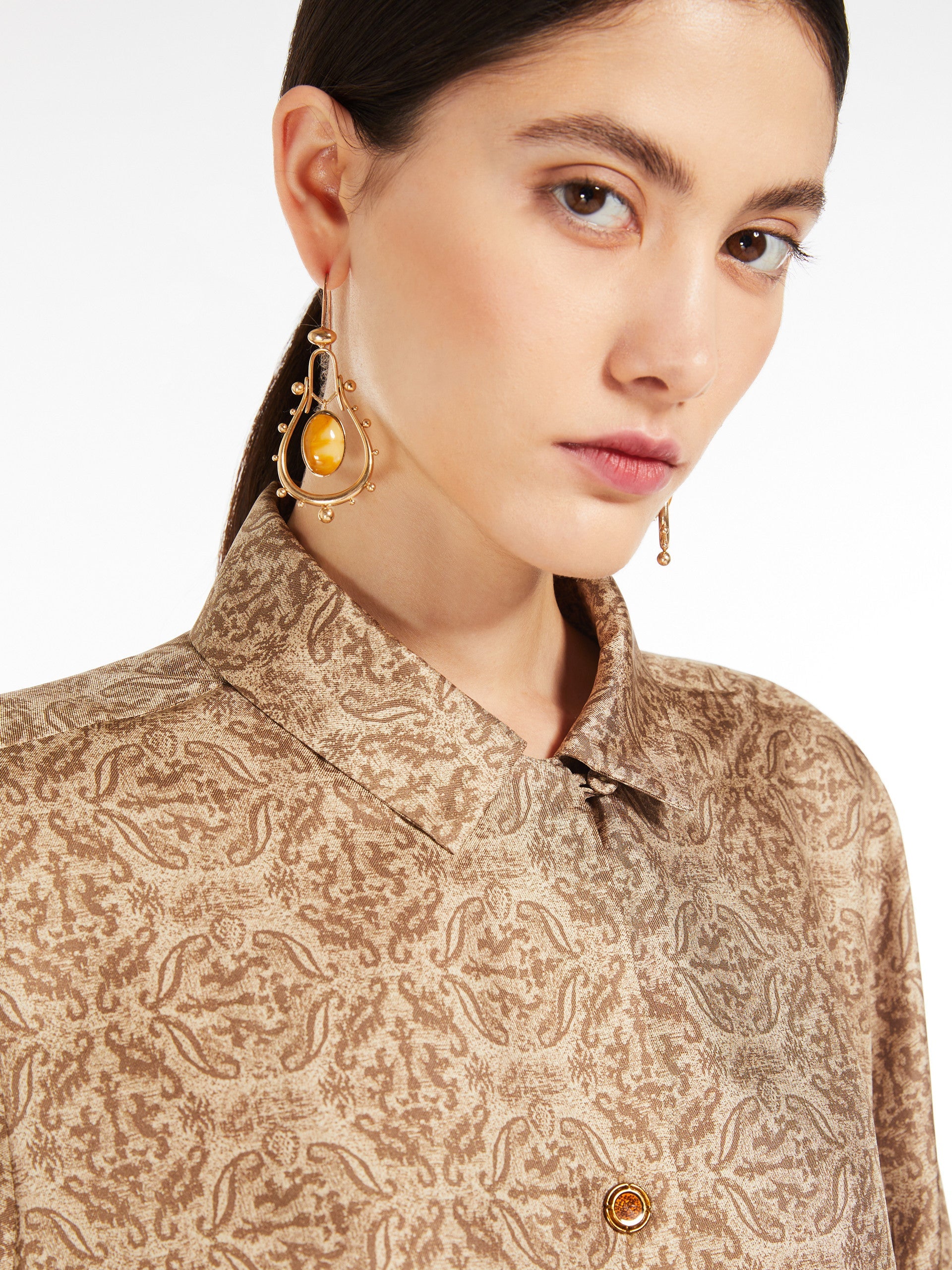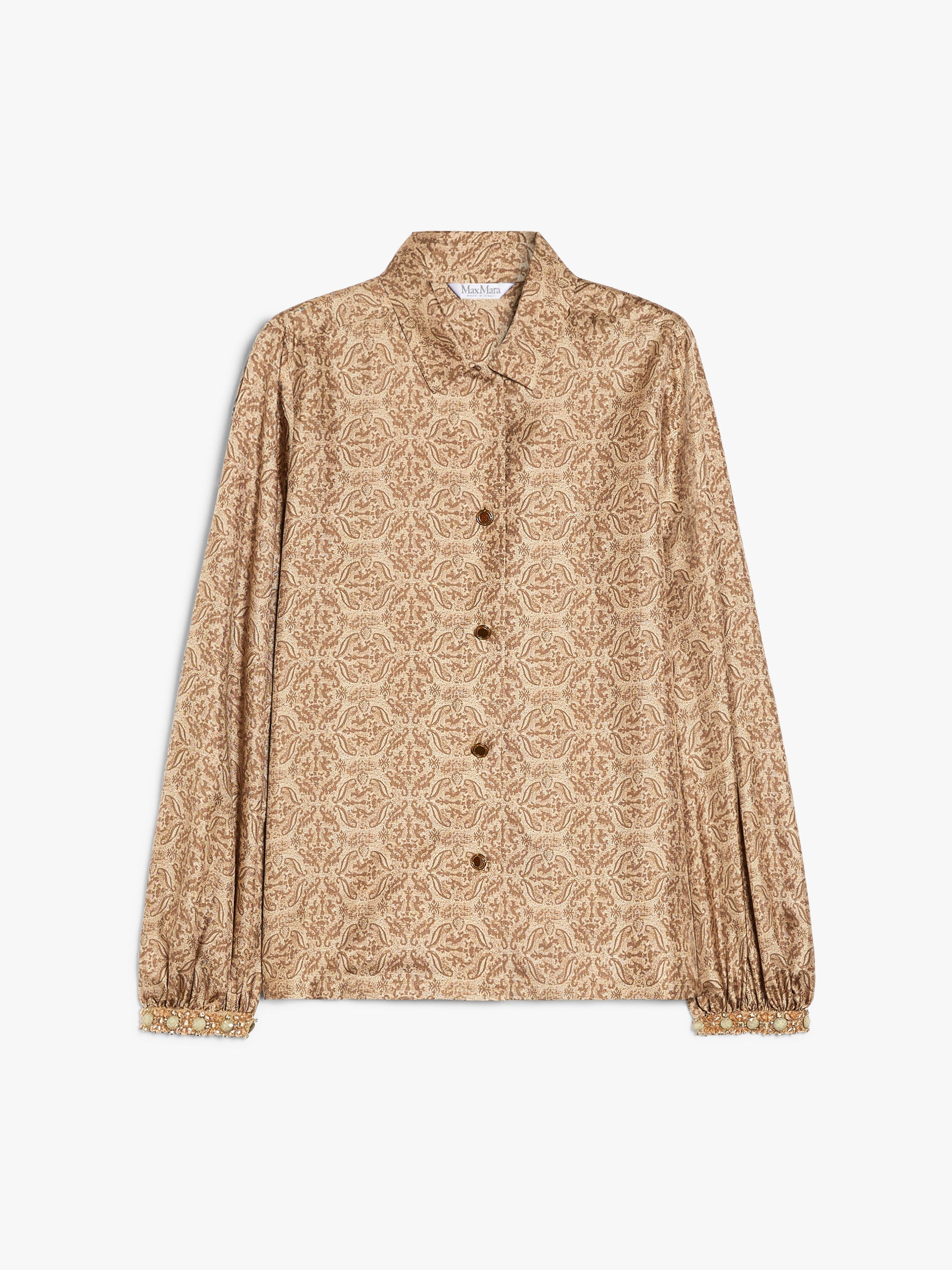 Semi-fitted men’s-style shirt made from exquisite pure silk twill. It is customised with an all-over jacquard-effect print and cuffs decorated with crystal and gemstone embroidery. Finished with a classic pointed collar, dropped shoulder long, wide sleeves and square side slits at the hem. Visible button fastening.