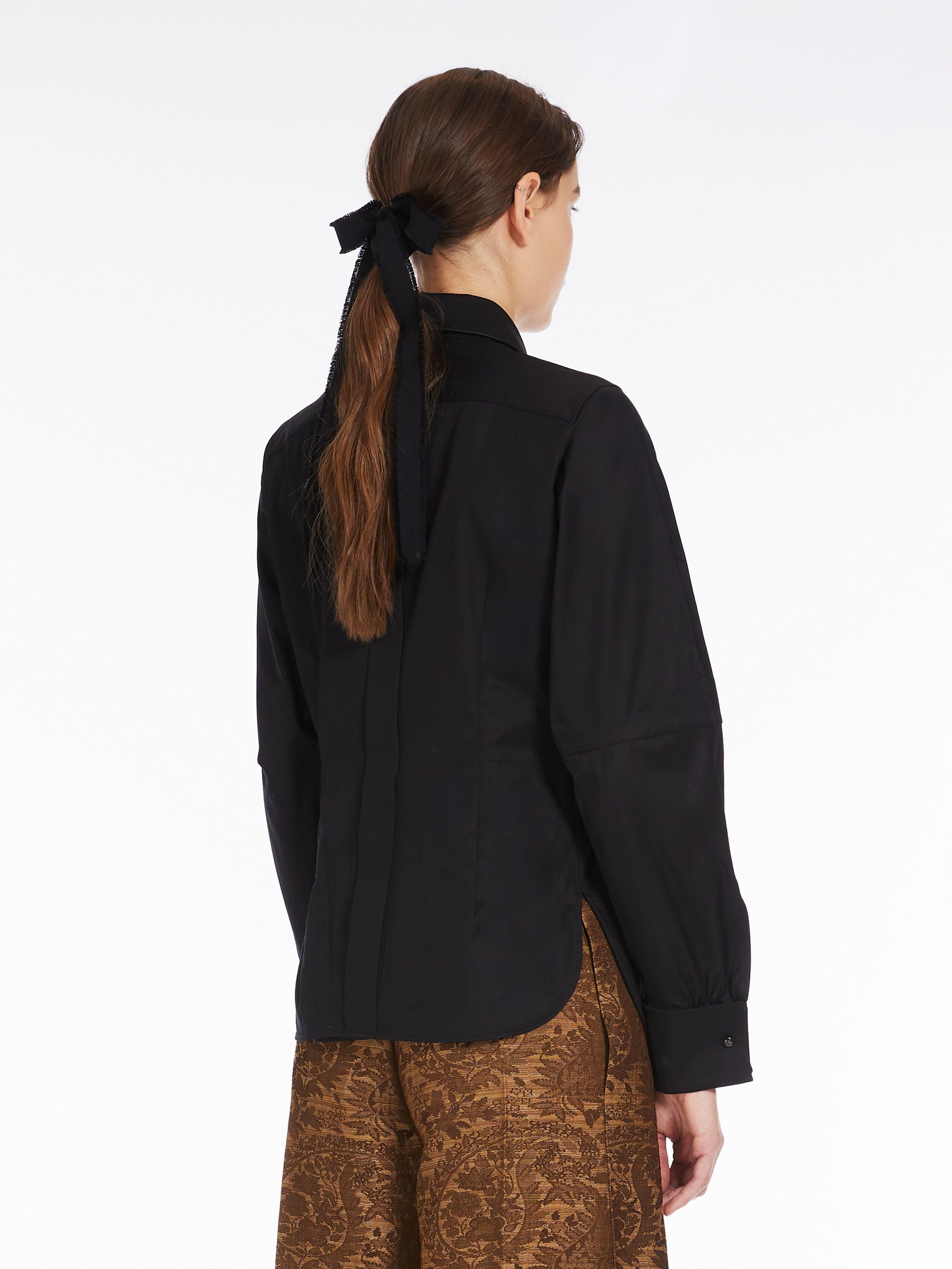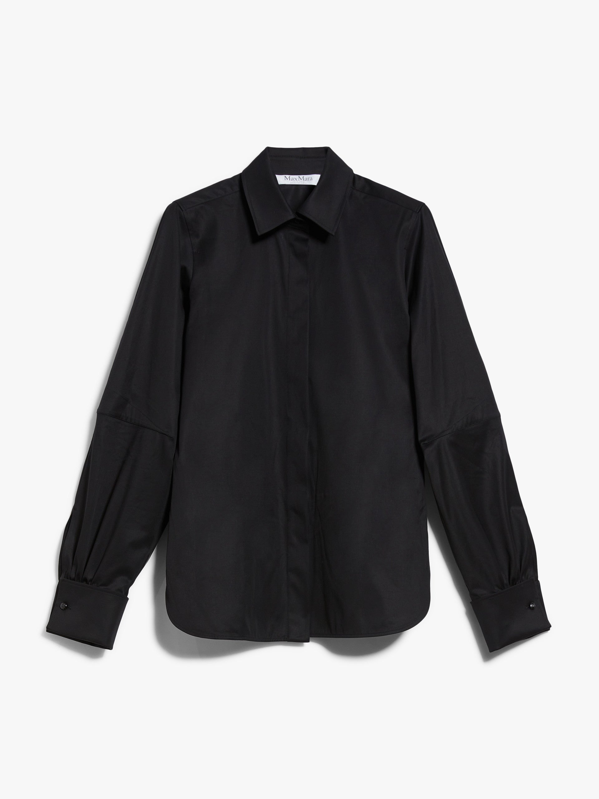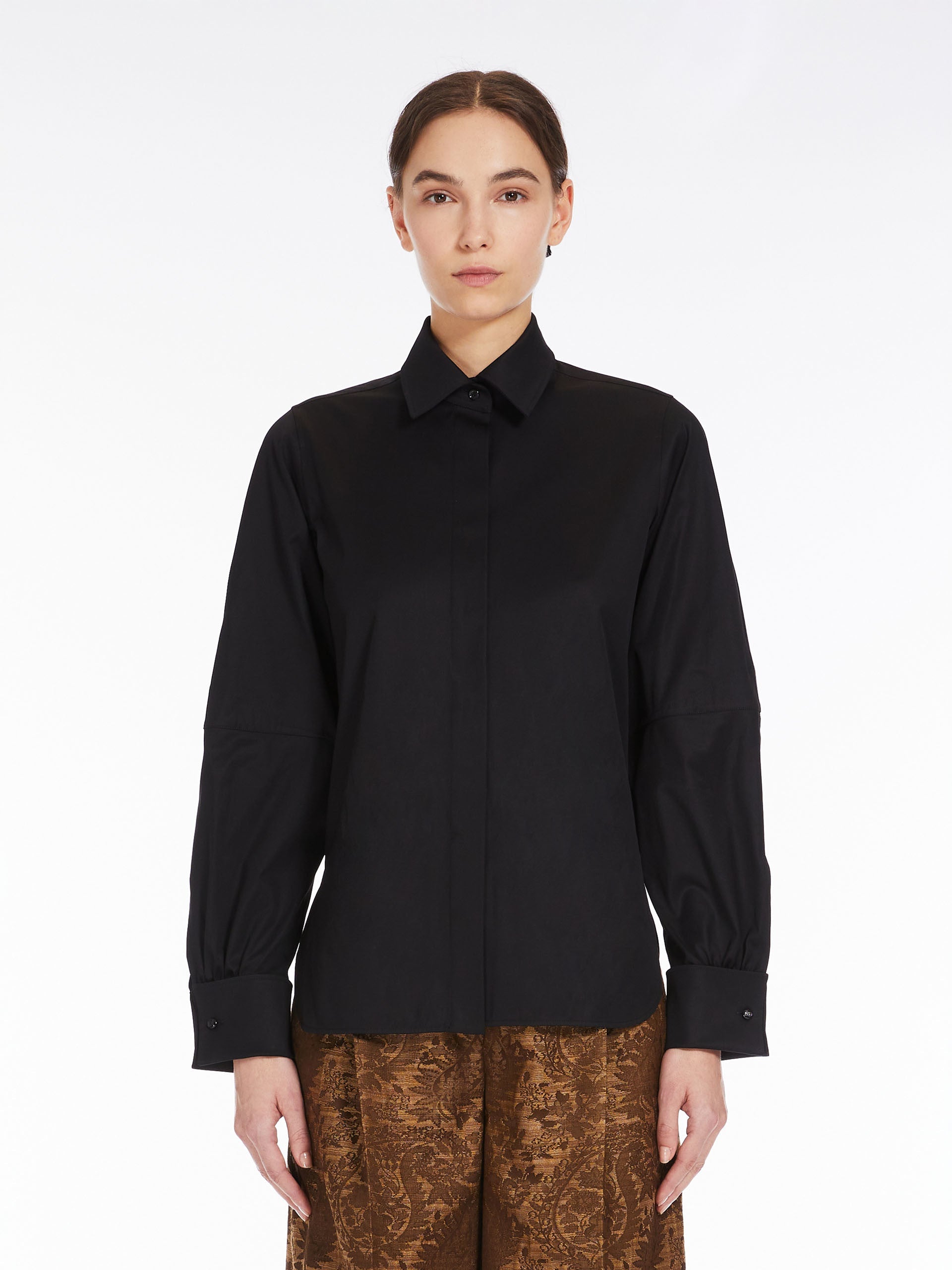 Masculine-inspired shirt in stretch cotton twill, interpreted in a modern, feminine version with wide sleeves featuring pleats and customised button cufflink fastenings. Featuring rounded side slits. Concealed button fastening. Length: 65 cm.
