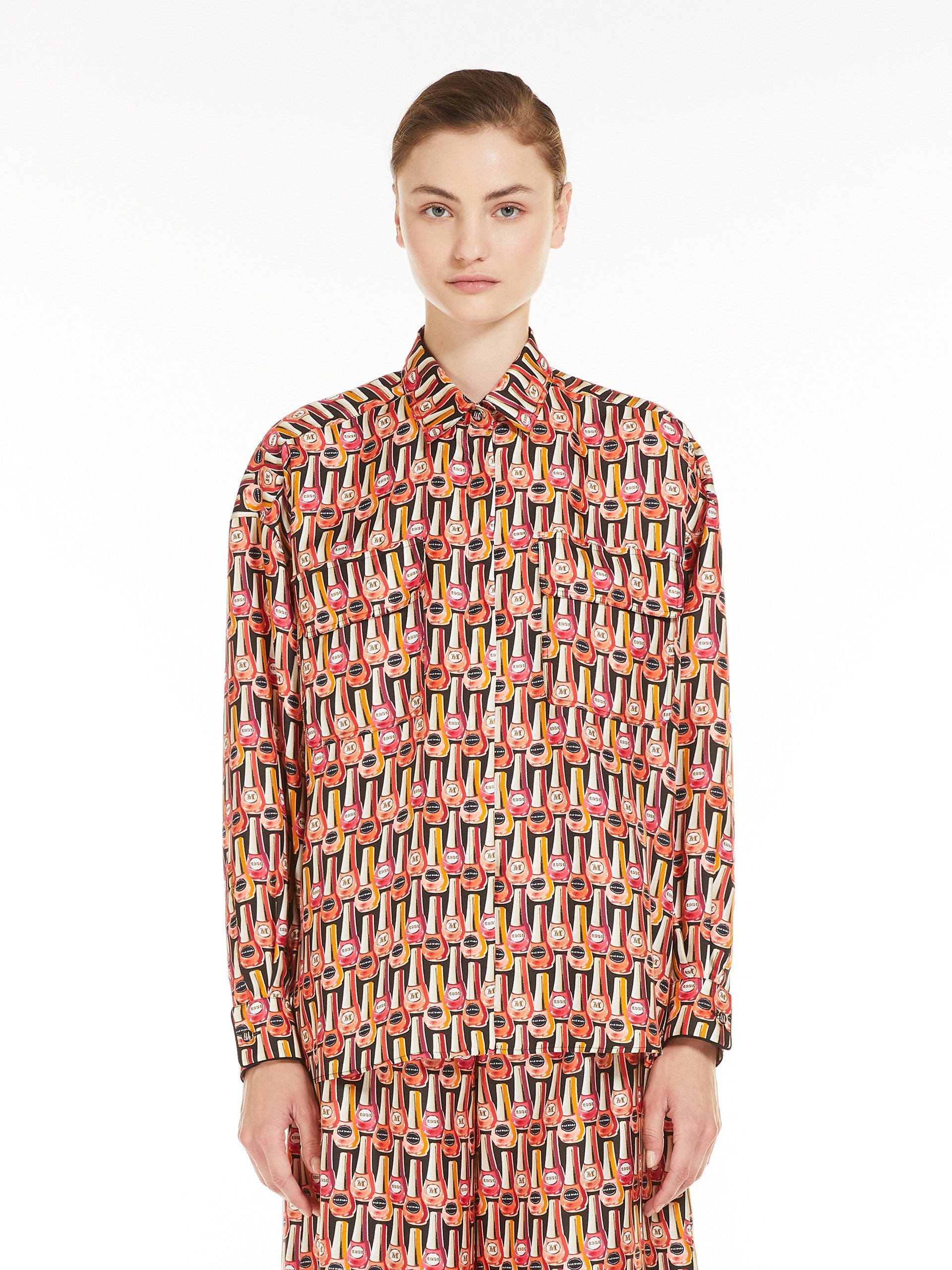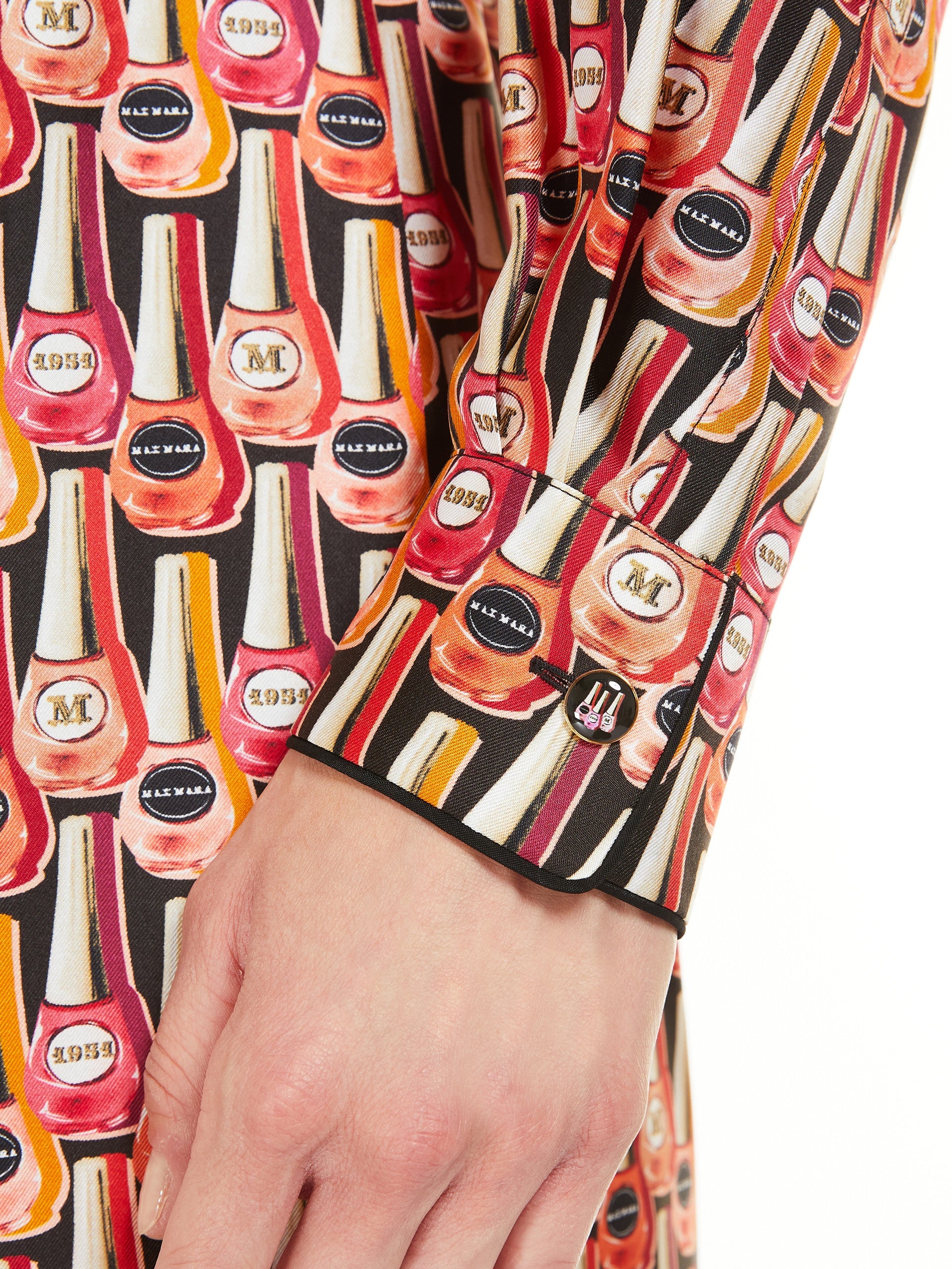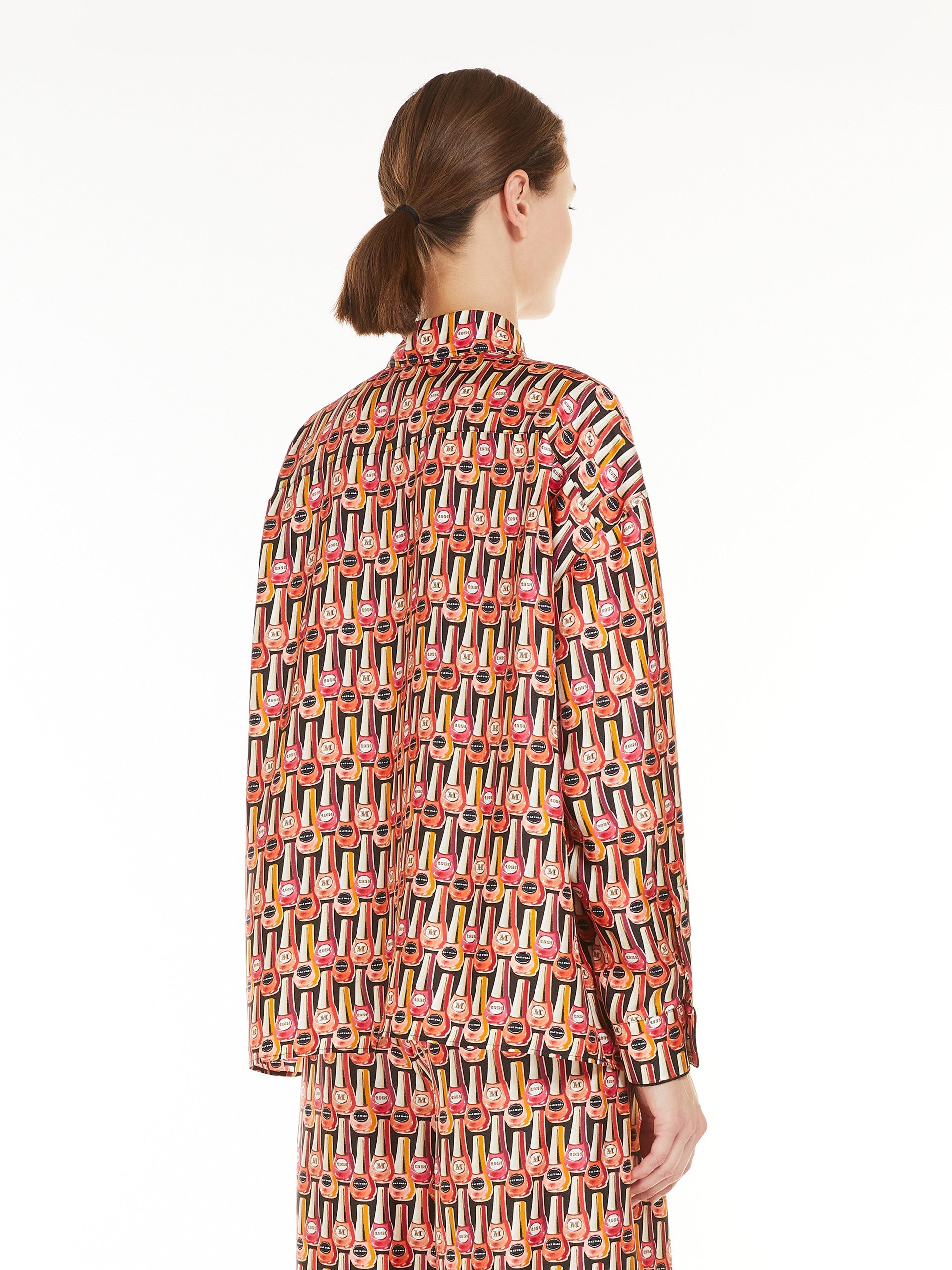 Long-sleeved shirt with a masculine cut, made of an exquisite printed pure silk twill. Slightly oversized style, finished with piping on the cuff and customised rounded buttons. Covered button fastening. Length: 65 cm.