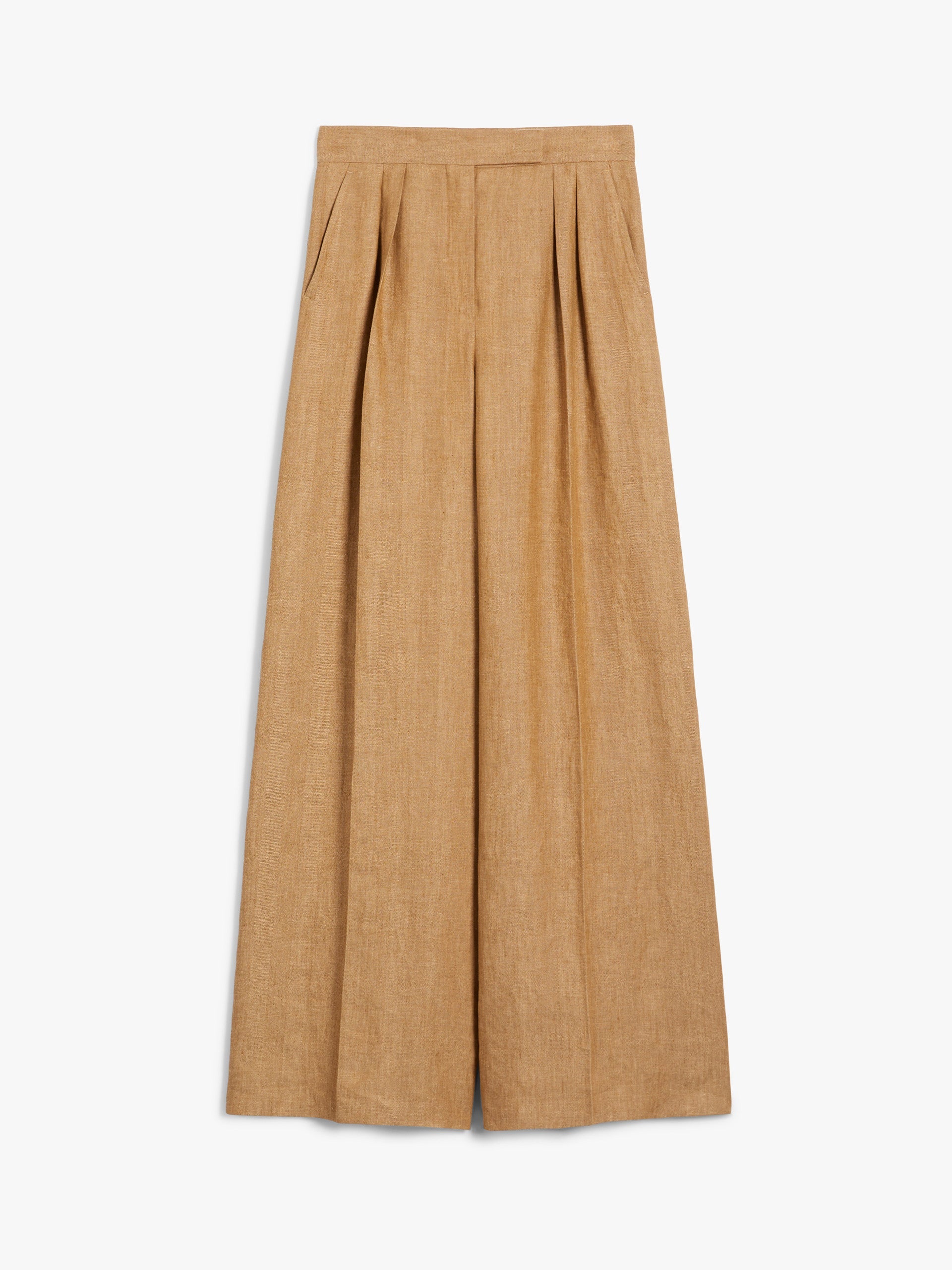 Long trousers made of a yarn-dyed design pure linen fabric. This design features a wide-leg silhouette, double pleat at the waist at the front, trouser crease and slant side pockets. Fastening with a wide waistband tab, zip fly and small hook.