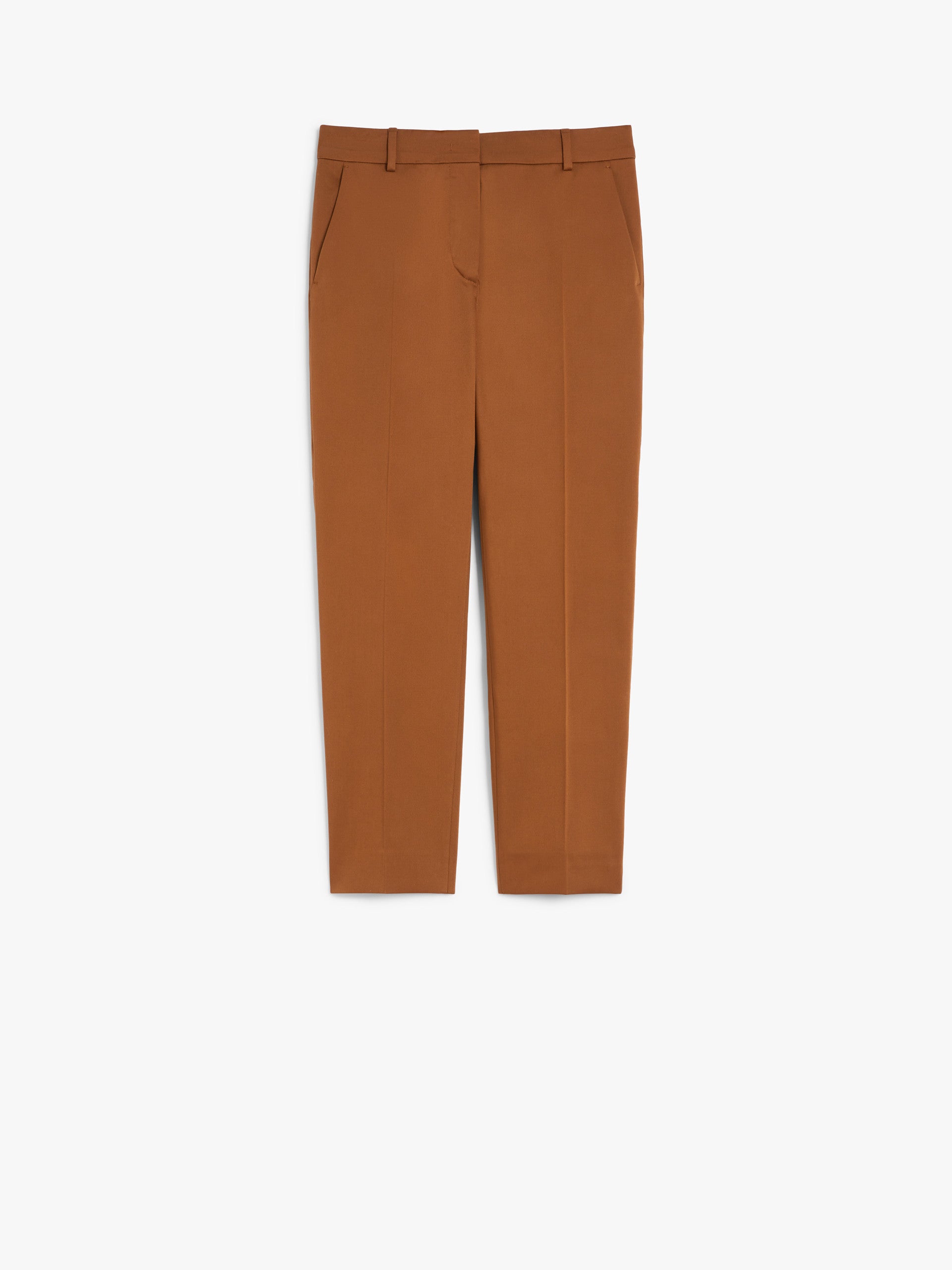 Cigarette trousers in luxurious stretch cotton satin. The style is cropped above the ankle with side inset pockets and double welt pockets on the back. Finished with belt loops and a trouser crease. Fastening with a wide waistband tab, zip fly and small hook.