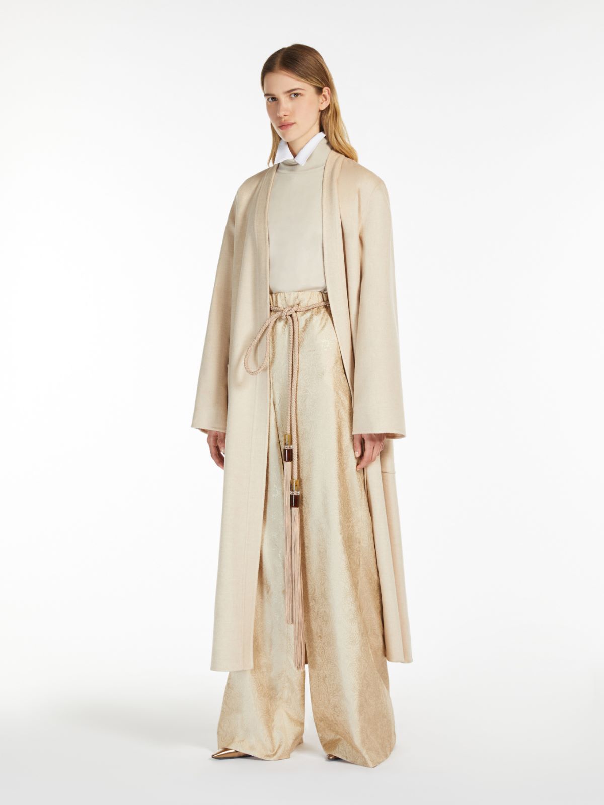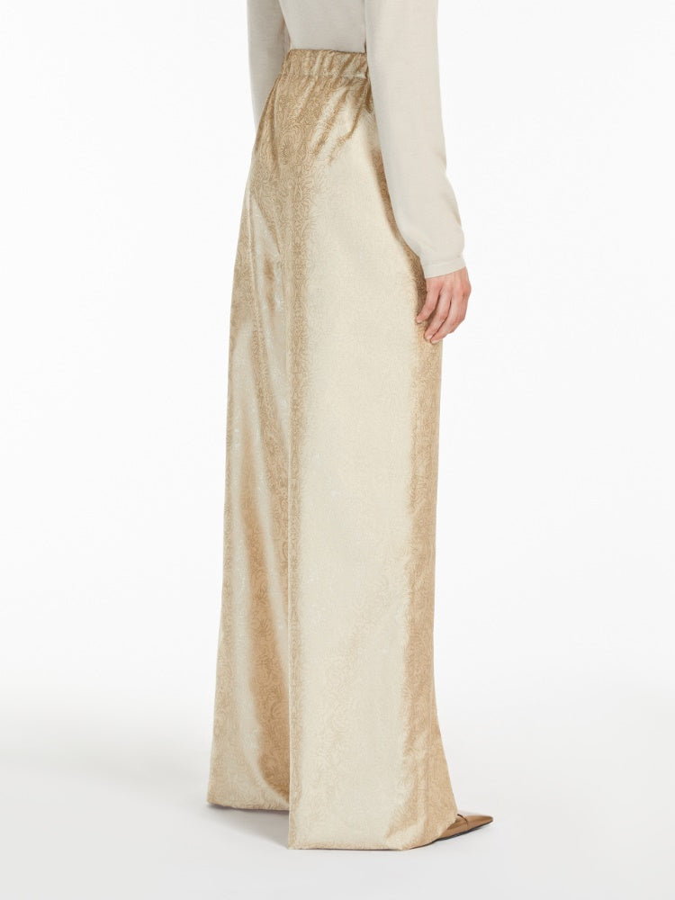 Trousers in luxurious pure silk fabric with all-over printed motif. It features a flowing silhouette with a loose leg, slant pockets on the sides and an elasticated waist.