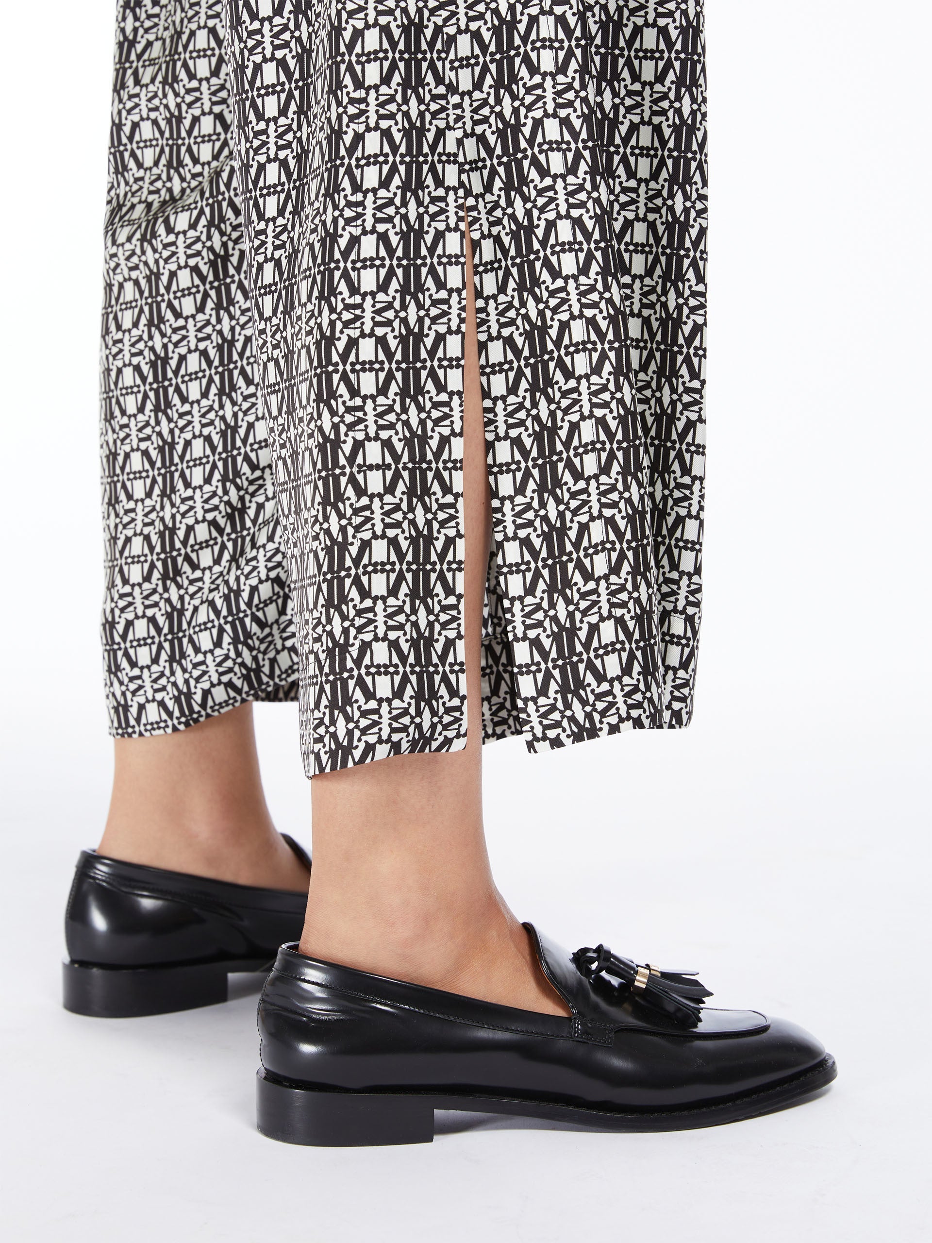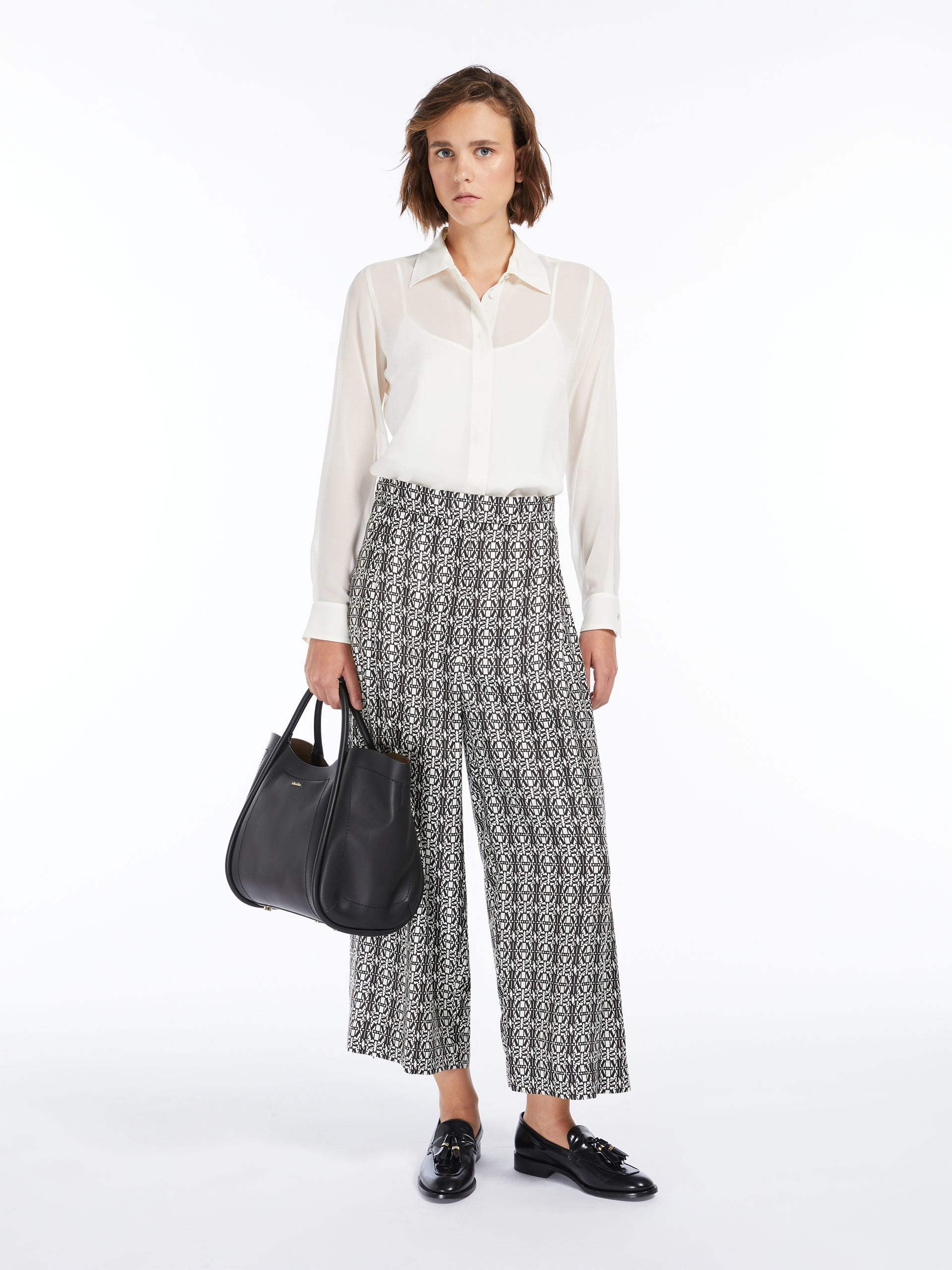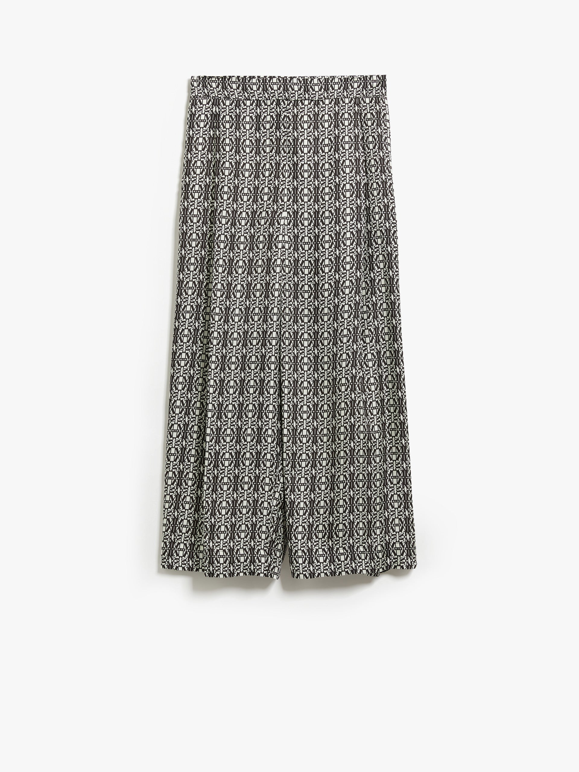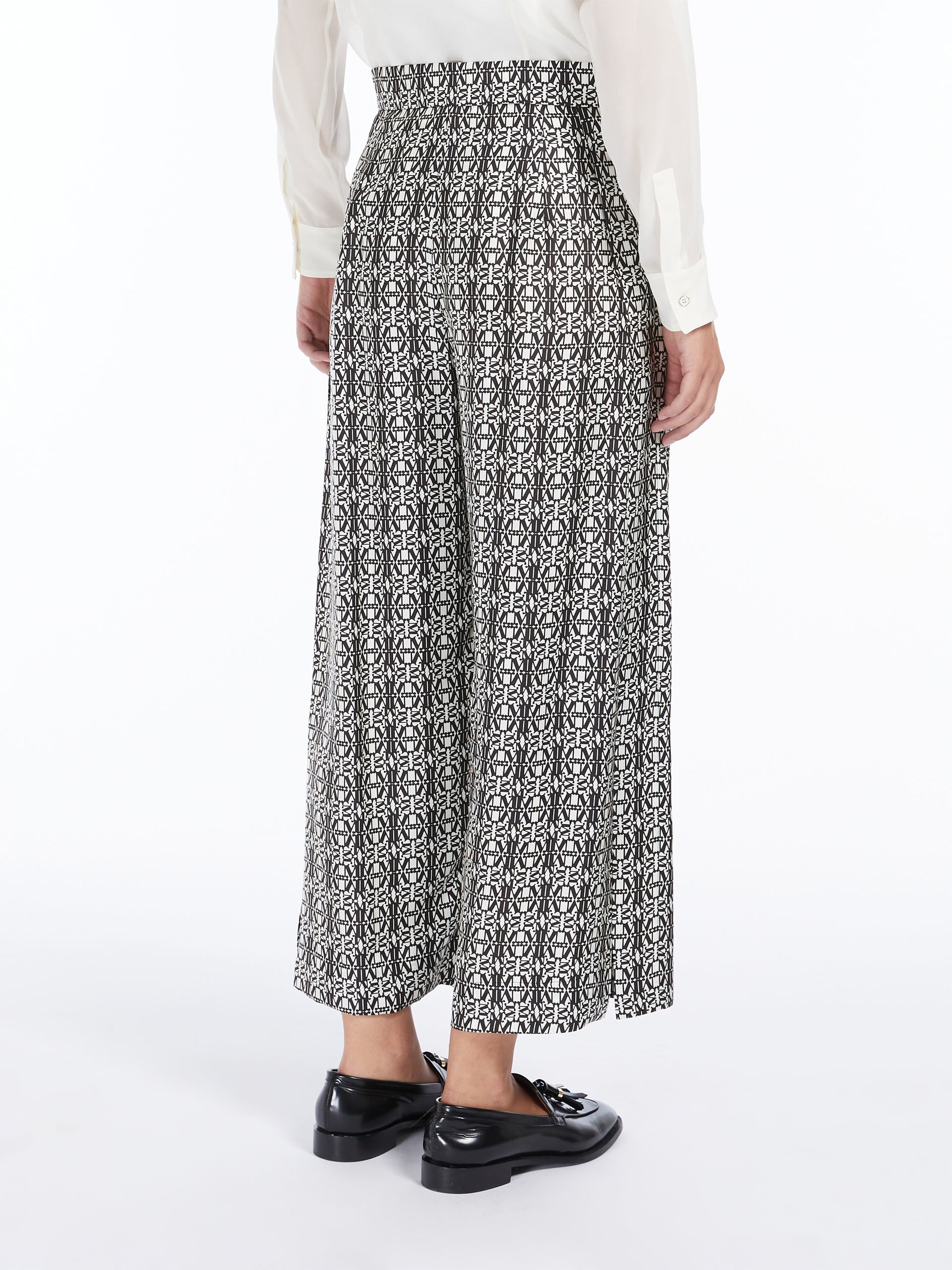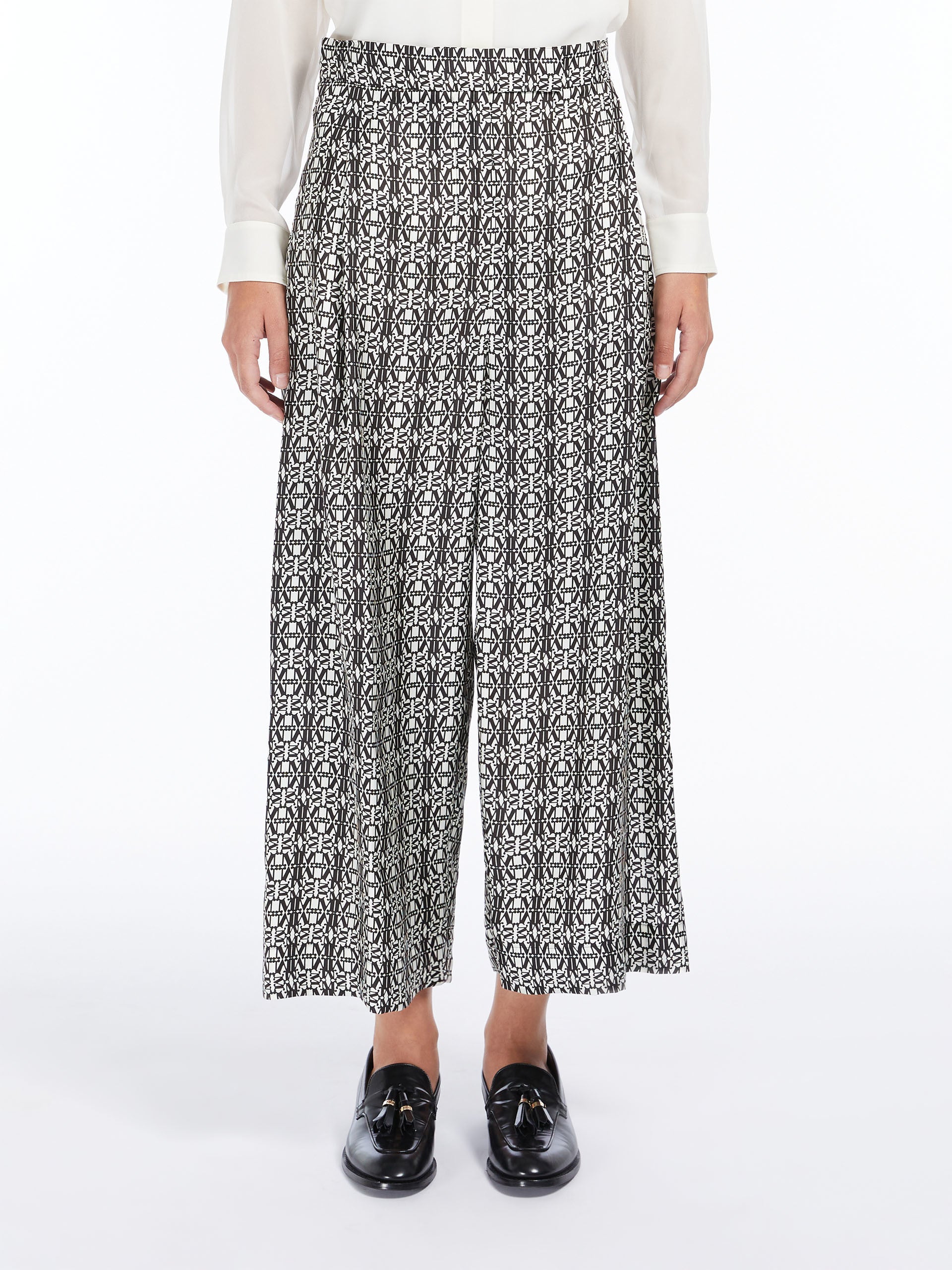 Cropped ankle-length trousers with wide leg made of fine pure silk twill, with all-over printed monogram motif. Unlined model, finished with slanted side pockets, wide edge and deep side slits on the hem. Hook and concealed zip fastening.