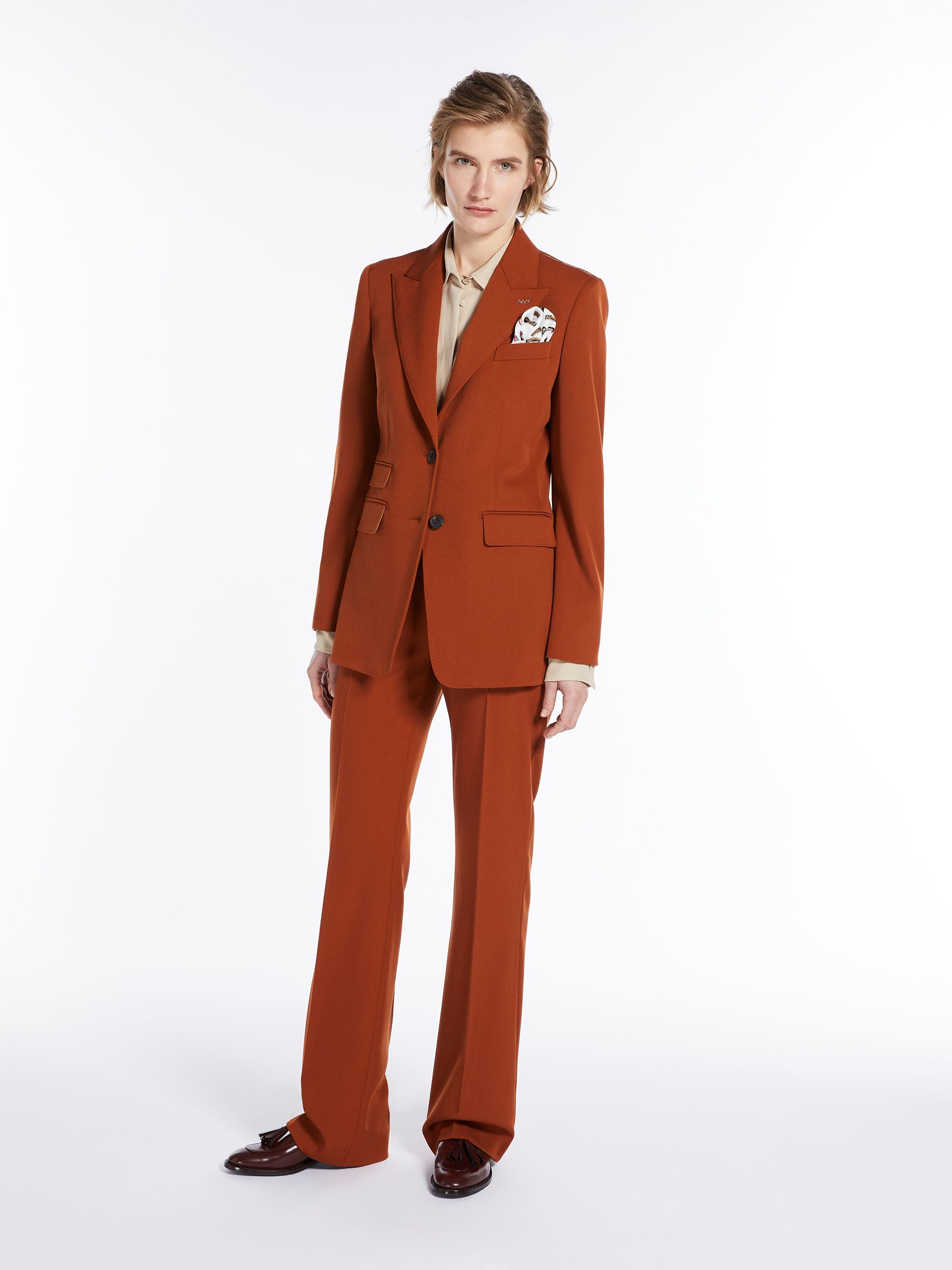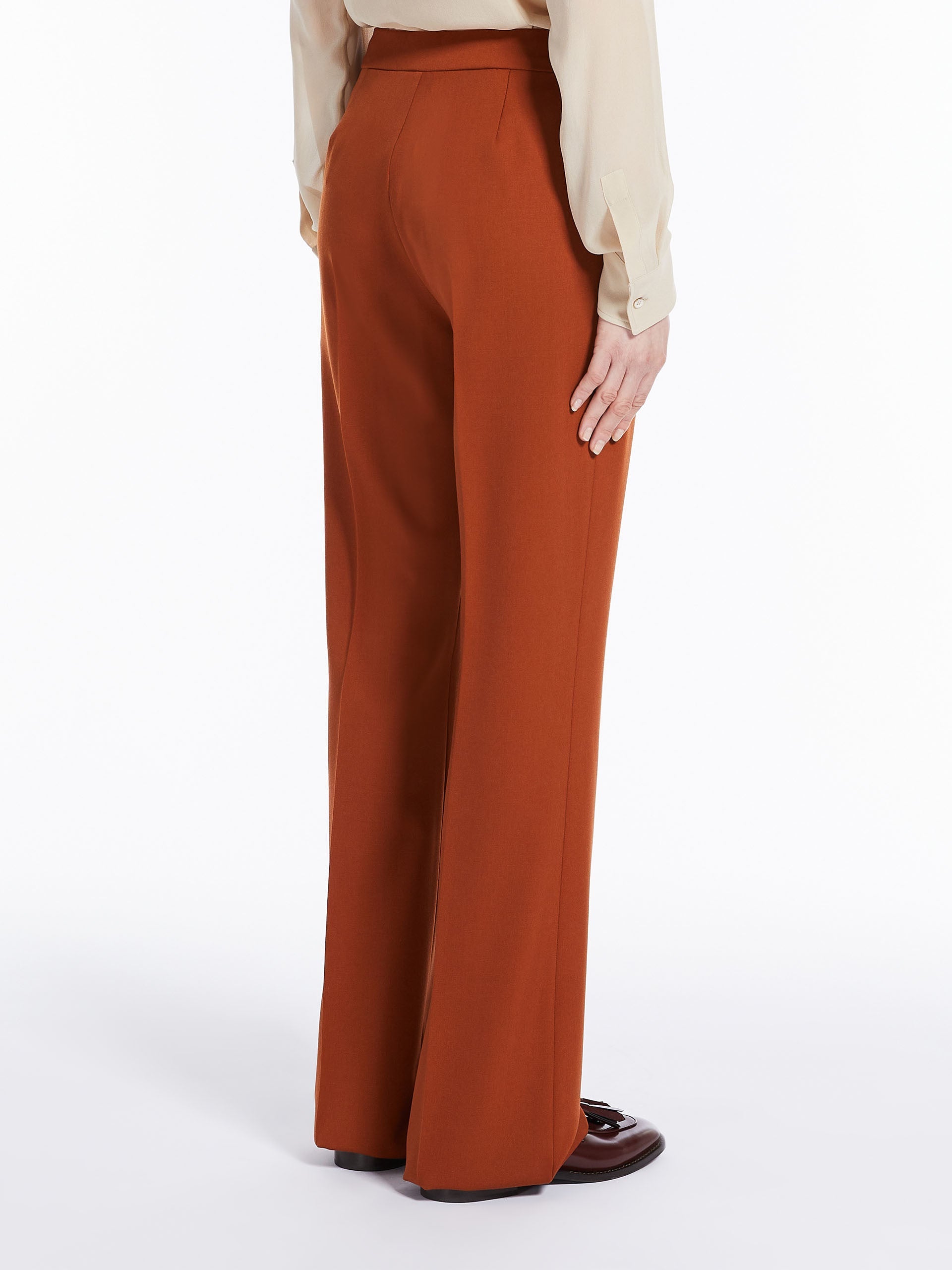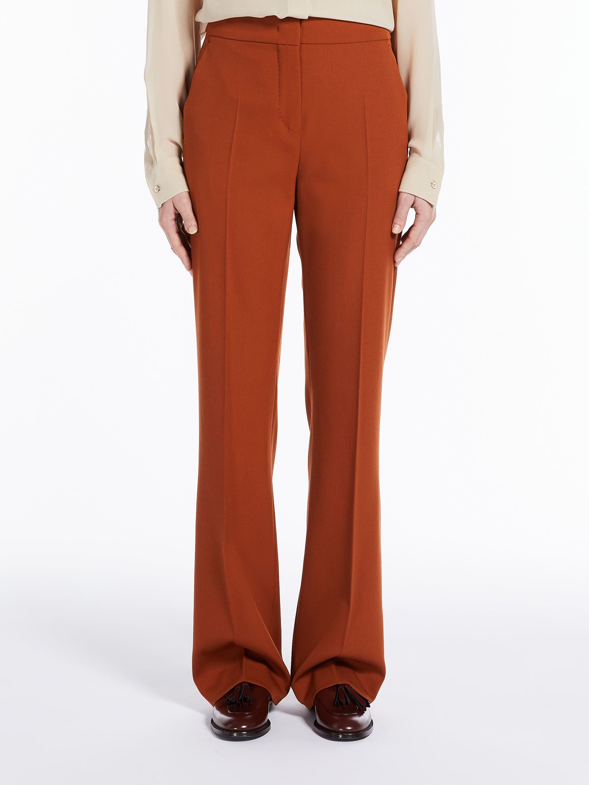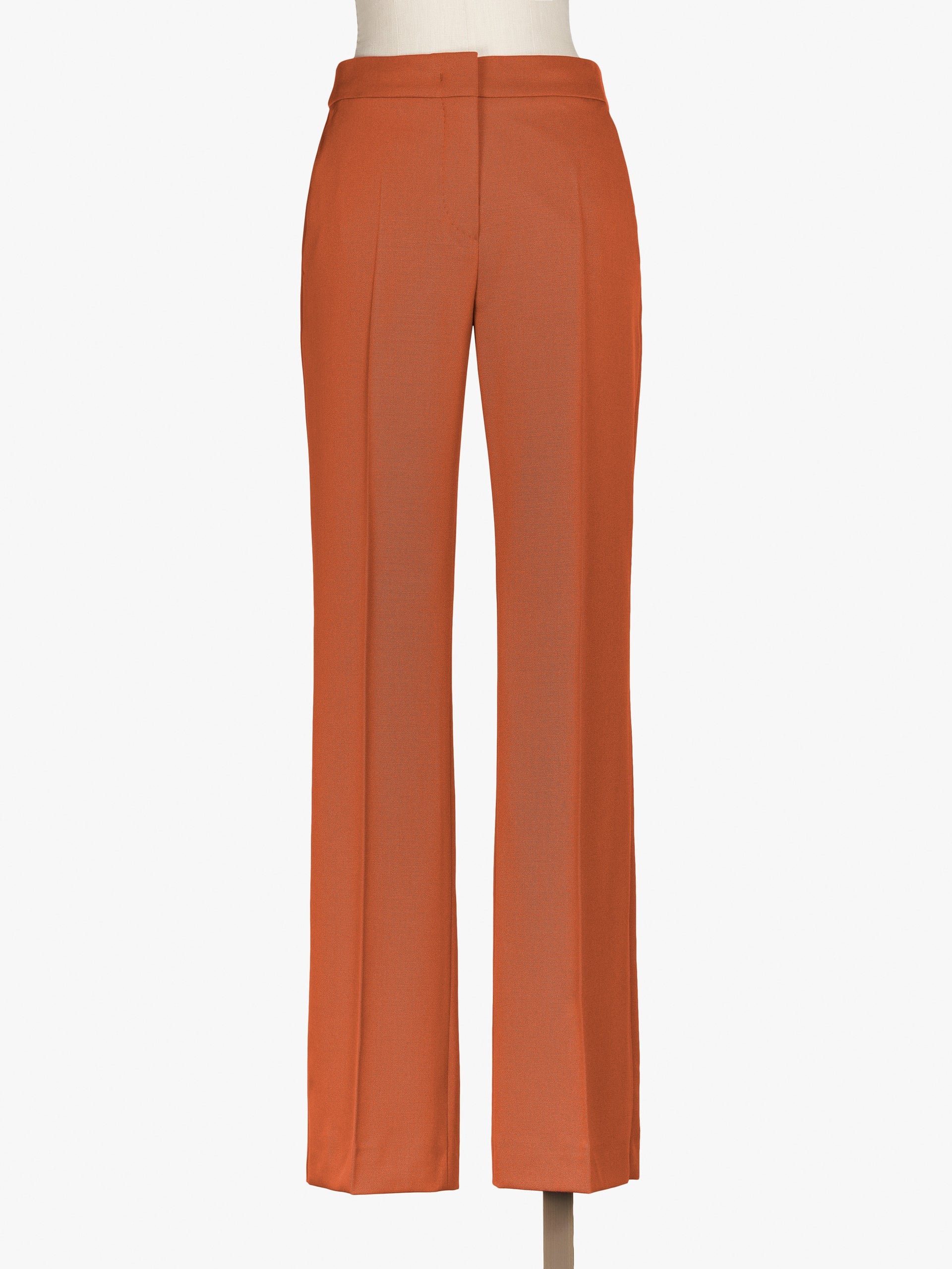 Trousers with a straight leg slightly flared at the hem, made of fine, slightly elastic granité wool. The fabric, made from combed wool fibres that are extremely soft to the touch and have a refined look, boasts a wavy, semi-matte texture suitable for all seasons. The masculine-inspired tailored construction is completed by a trouser crease on the leg and pockets on the sides. Fastening with wide customised waistband, flap with zip and small hook.