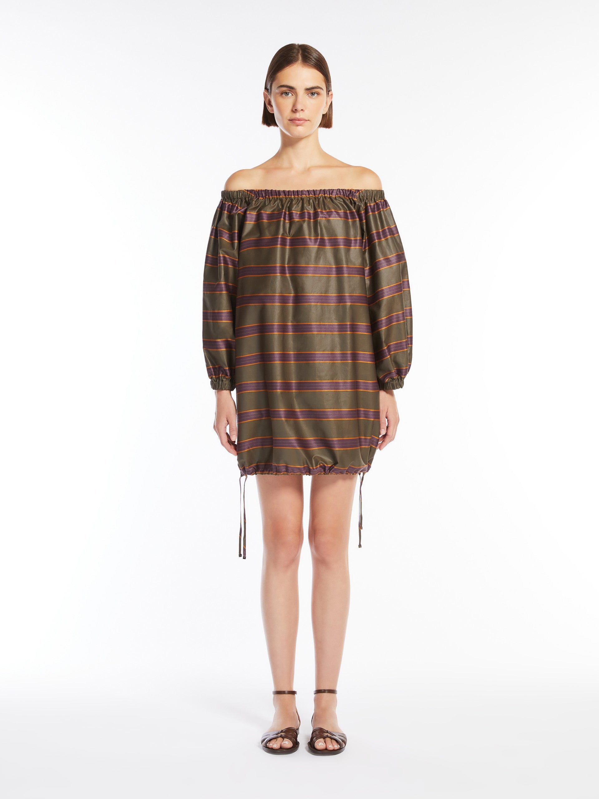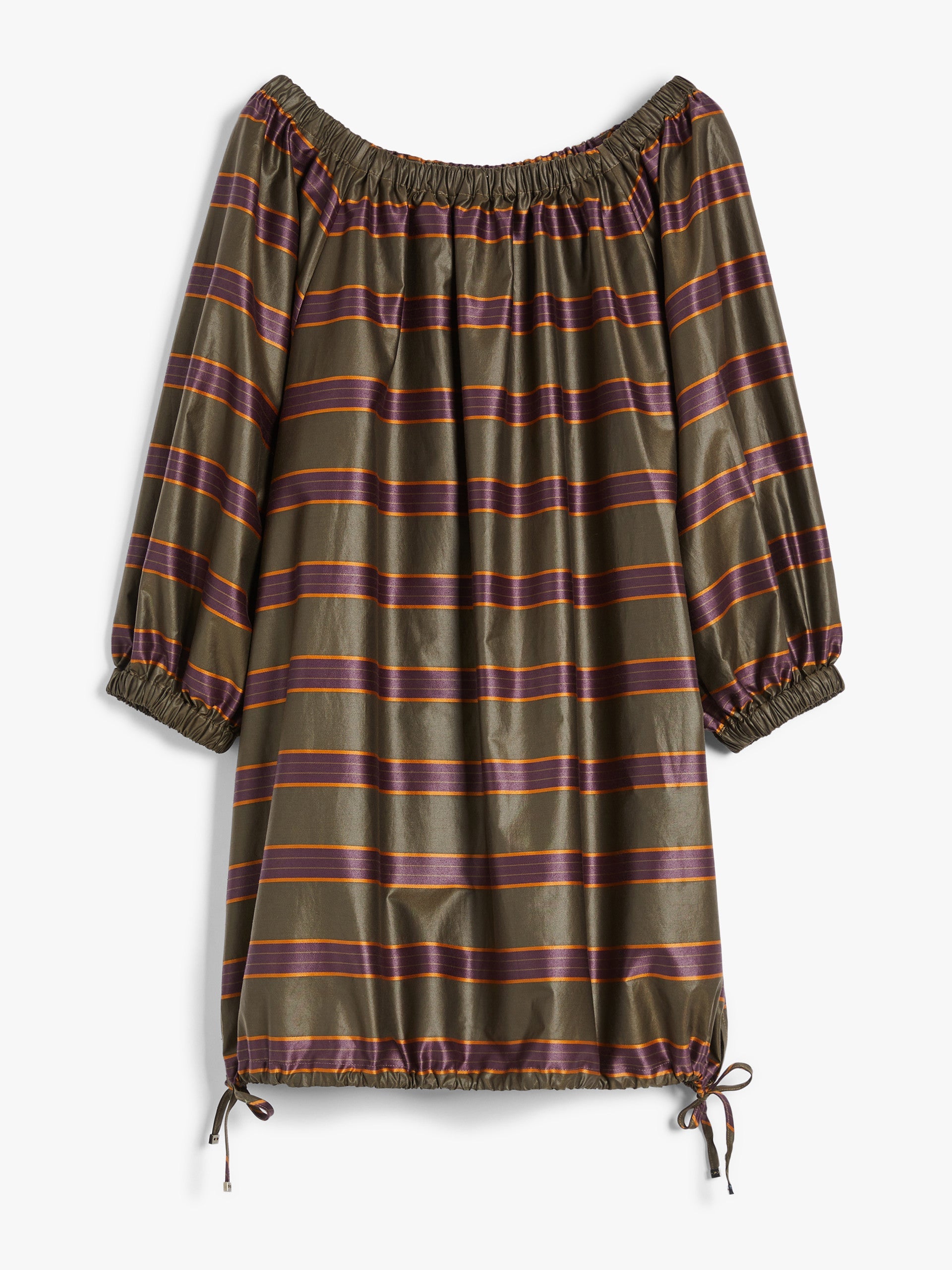 Short dress in a cotton blend canvas featuring a wide, feminine gathered neckline, off-the-shoulder style and balloon raglan sleeves with gathered elasticated cuffs. Unlined and with an ample volume, it is completed by a drawstring edge that ties on both sides.