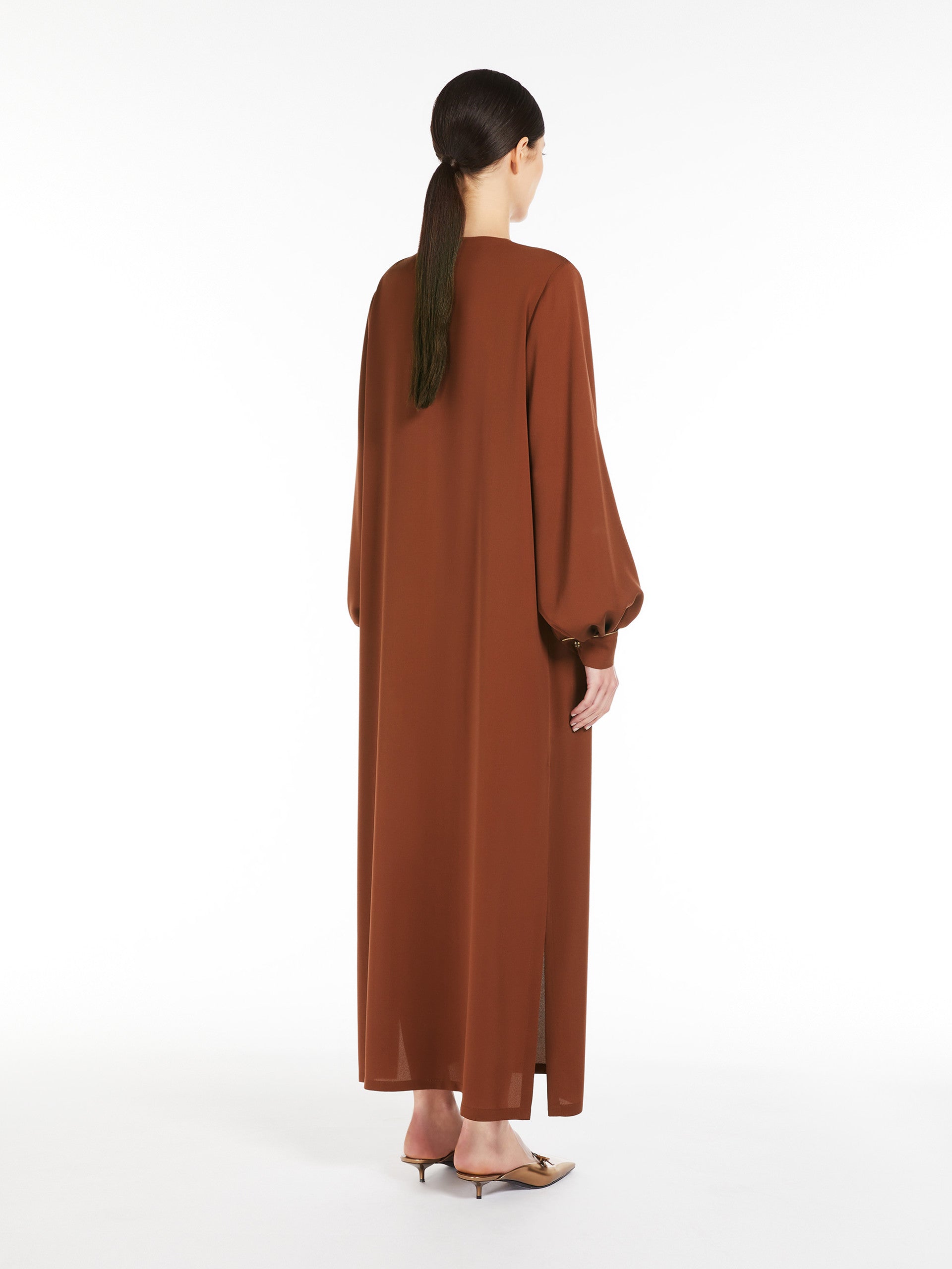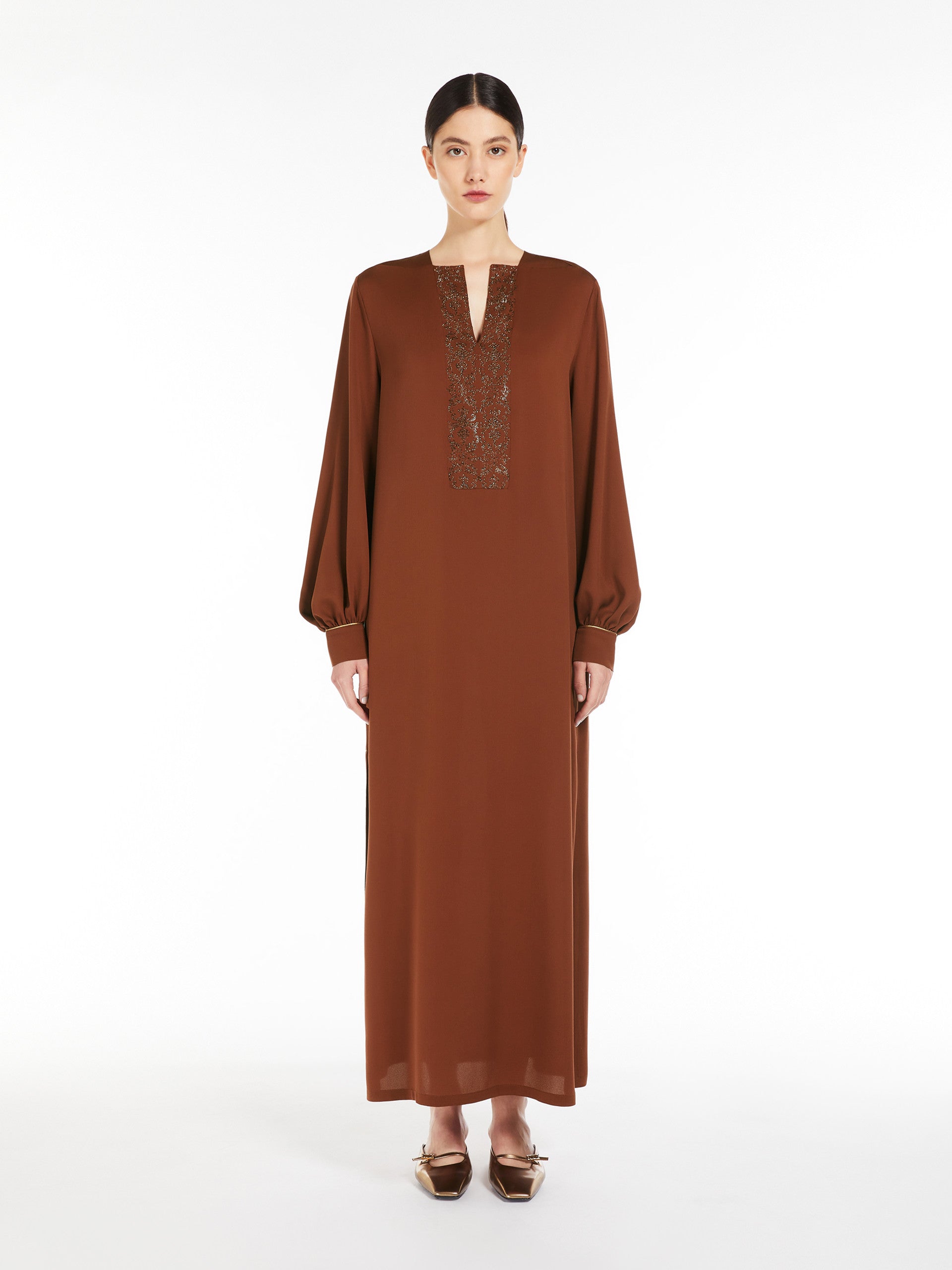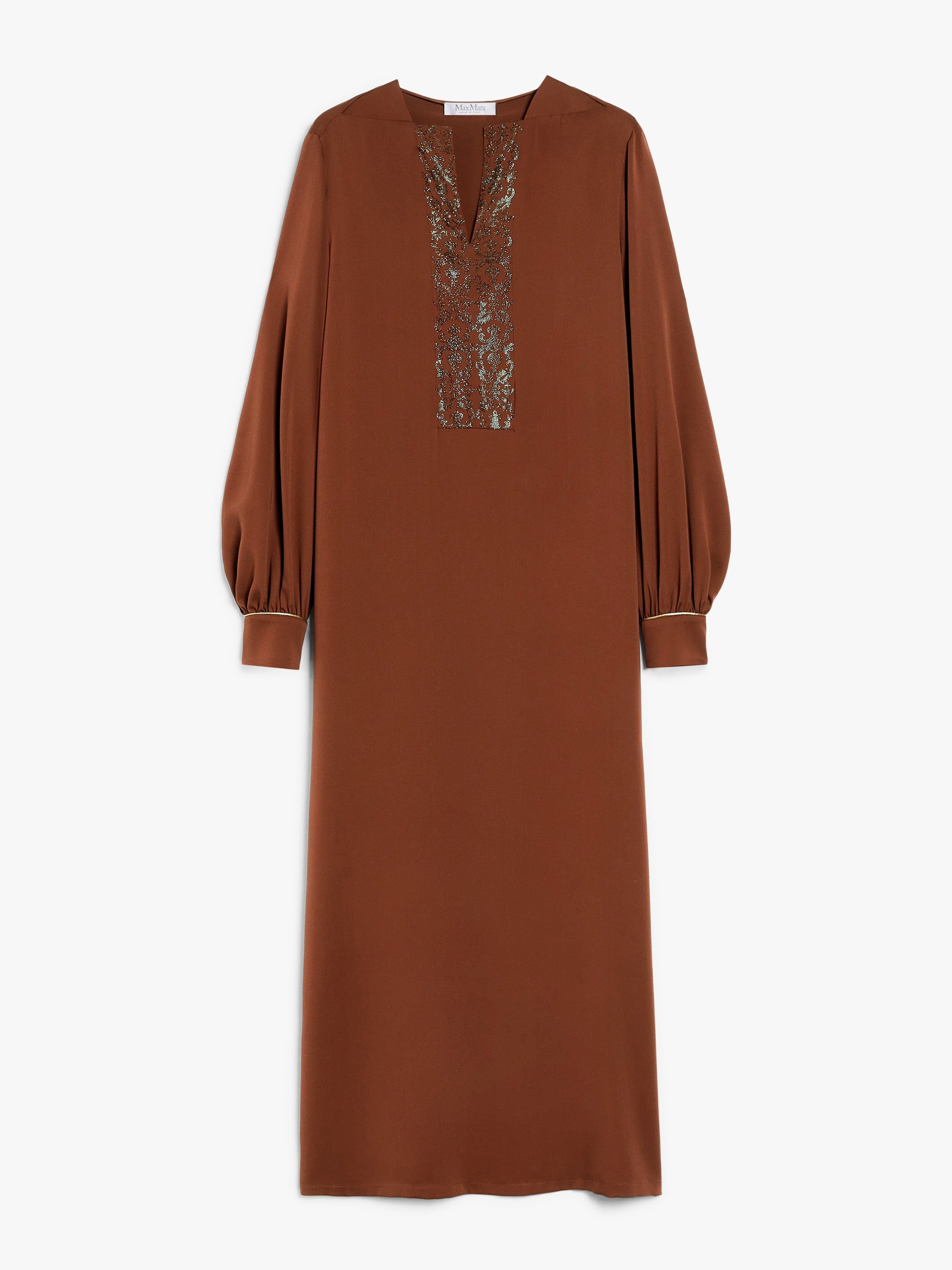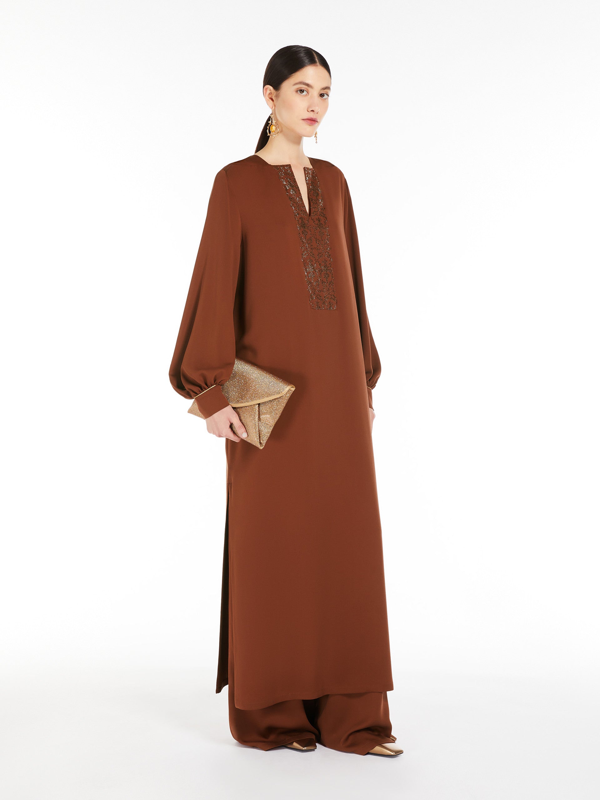 Long tunic dress made of luxurious, heavy pure silk charmeuse. It features a square V-neckline and a plastron embroidered with contrasting micro-rhinestones. Unstructured style with wide long puff sleeves and buttoned shirt cuff. Unlined, it is finished with deep square side slits and gold-coloured piping on the cuffs.