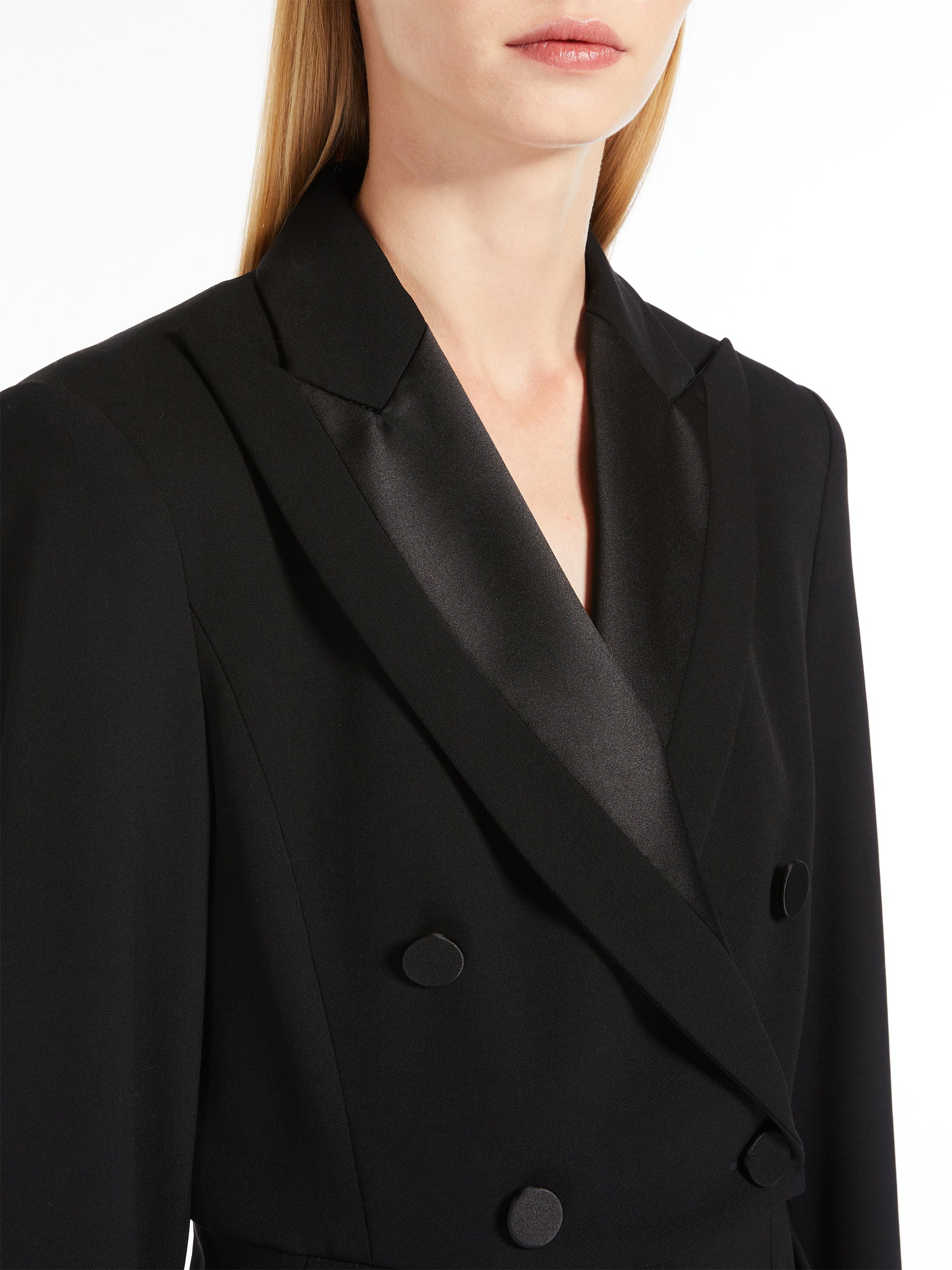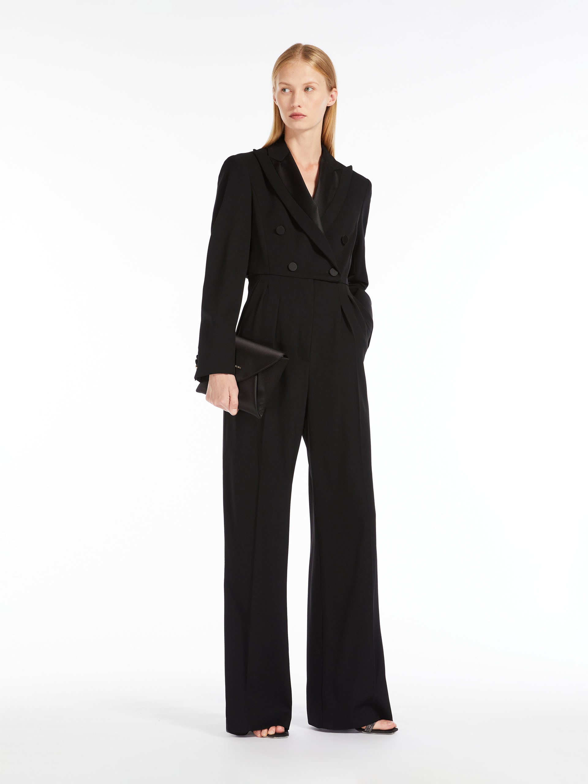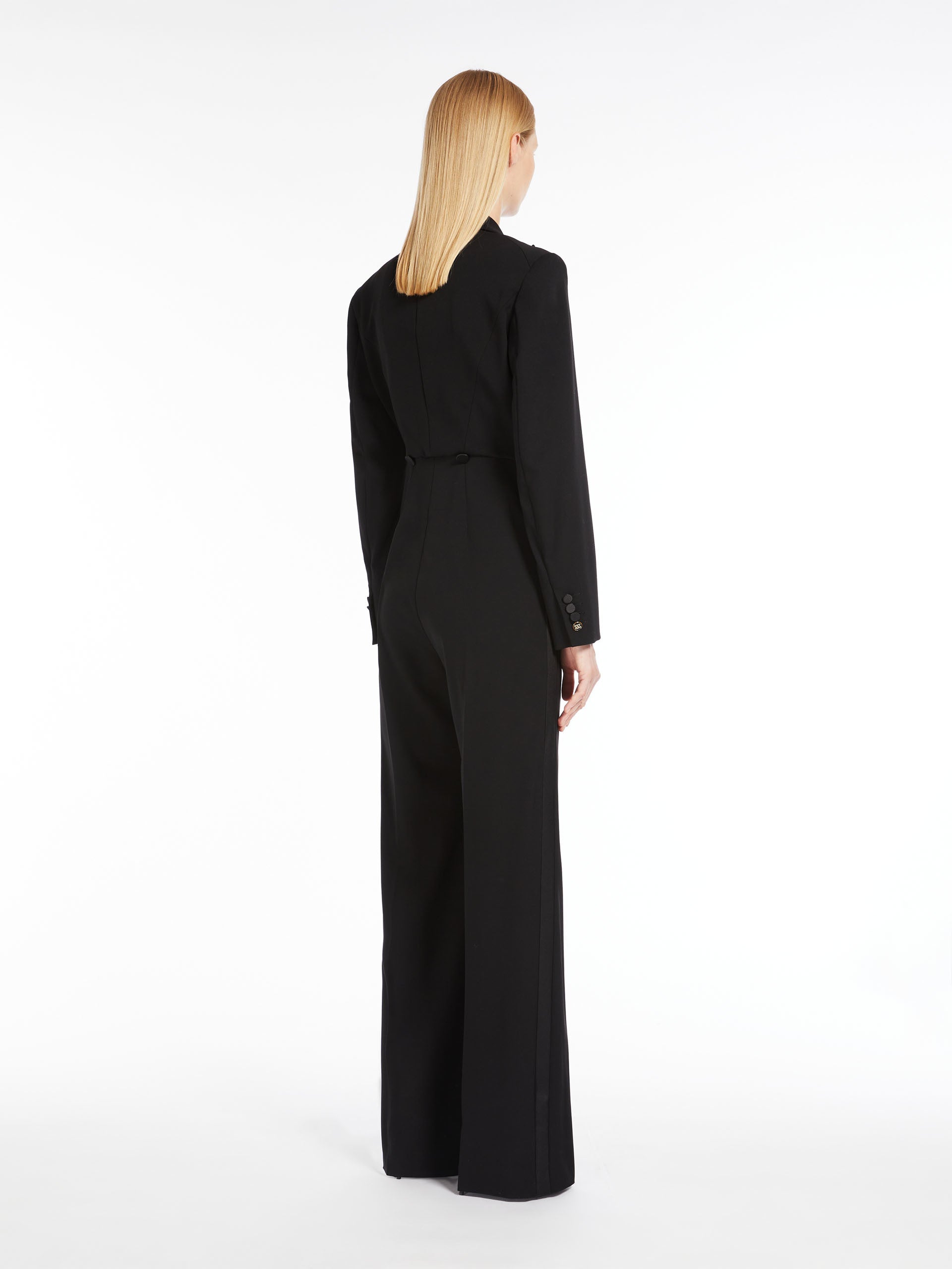 Double-breasted jumpsuit in exquisite granité stretch wool, with shiny satin details in the same shades. The tuxedo-inspired construction features well-defined shoulders, a lapel collar, a seam at the waist with two buttons on the back and wide trousers with double pleats and a trouser crease. Completed by long sleeves with a customised button at the hem.