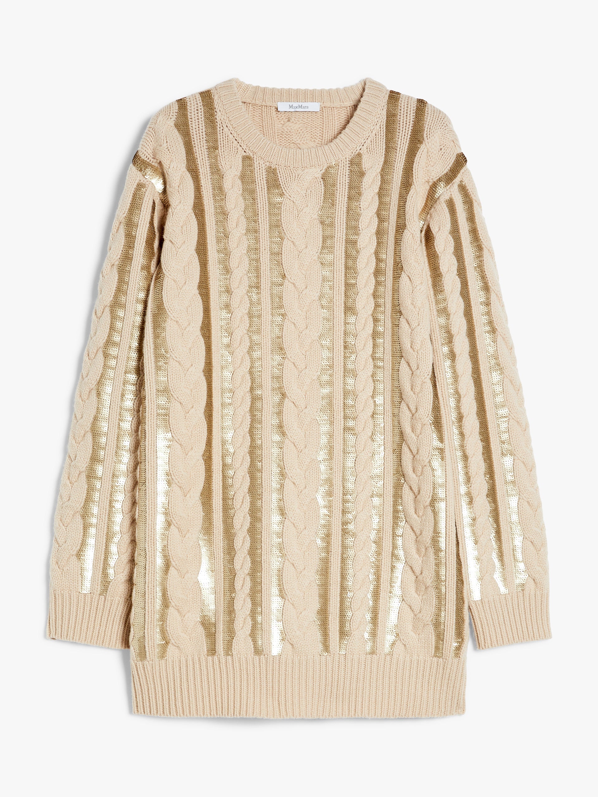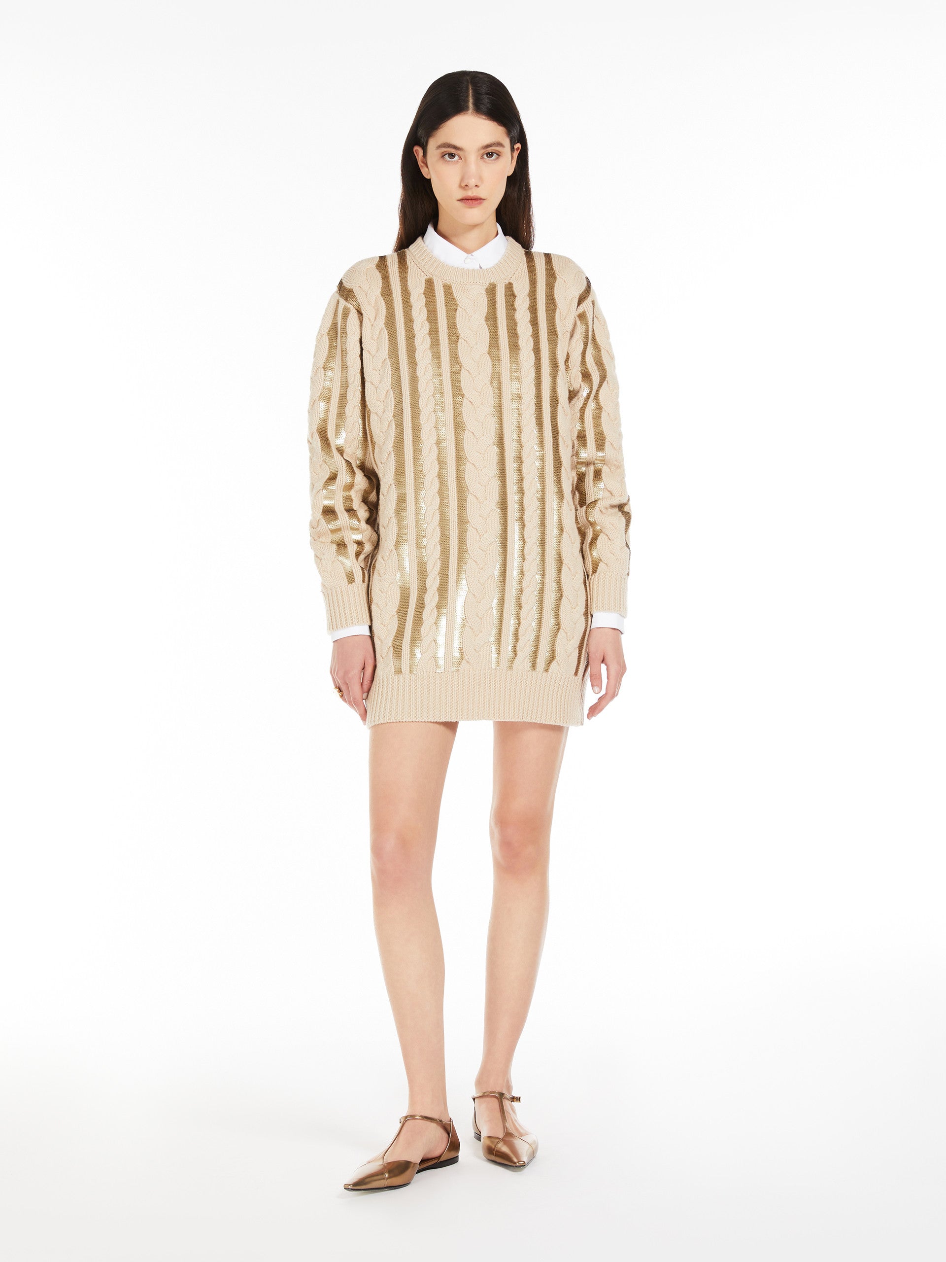 Short dress in luxurious wool and cashmere yarn, with a round neckline and long dropped-shoulder sleeves. Straight-line style, embellished with matching sequins embroidered on the front and sleeves. Finished with ribbed edges.