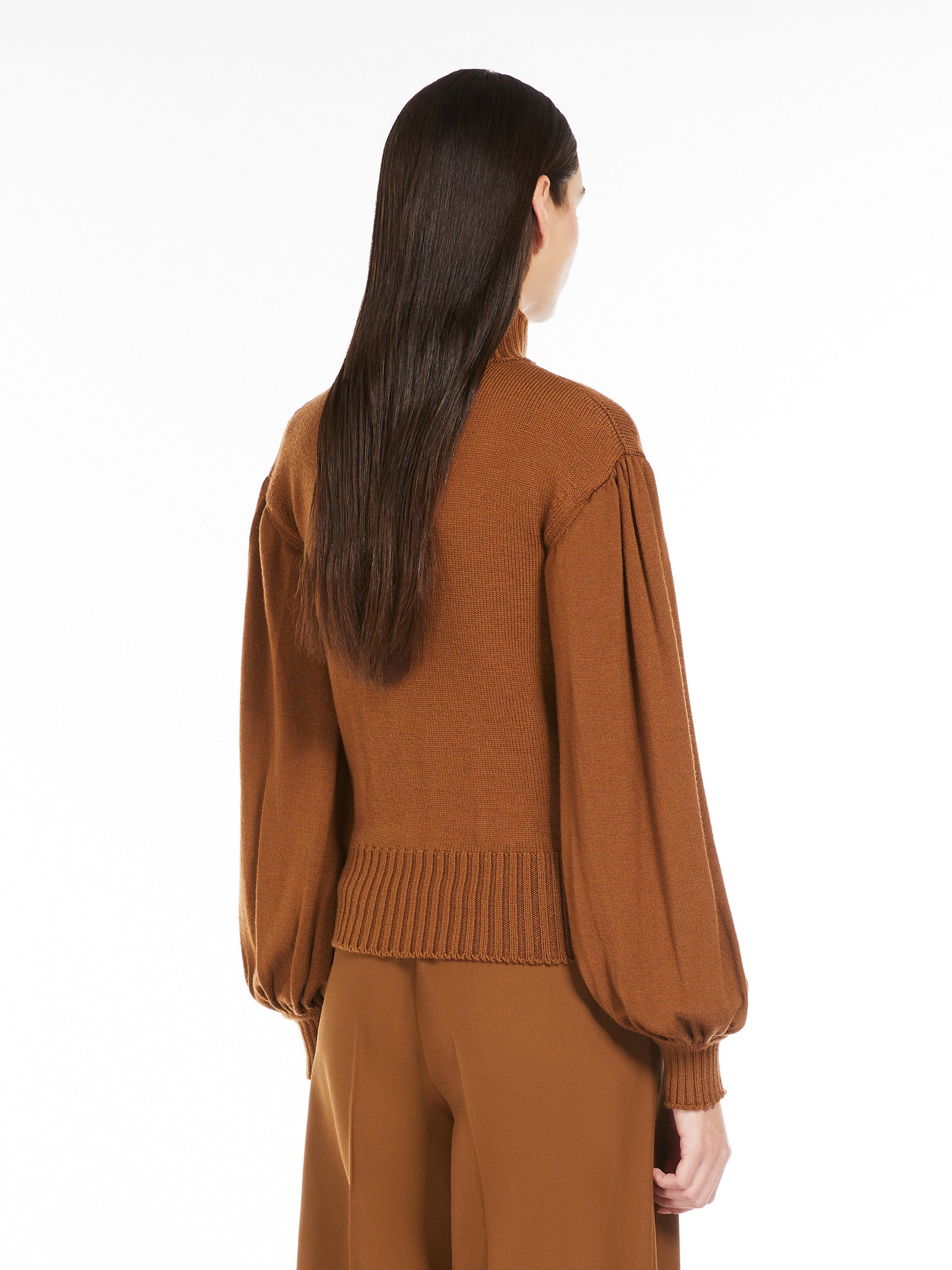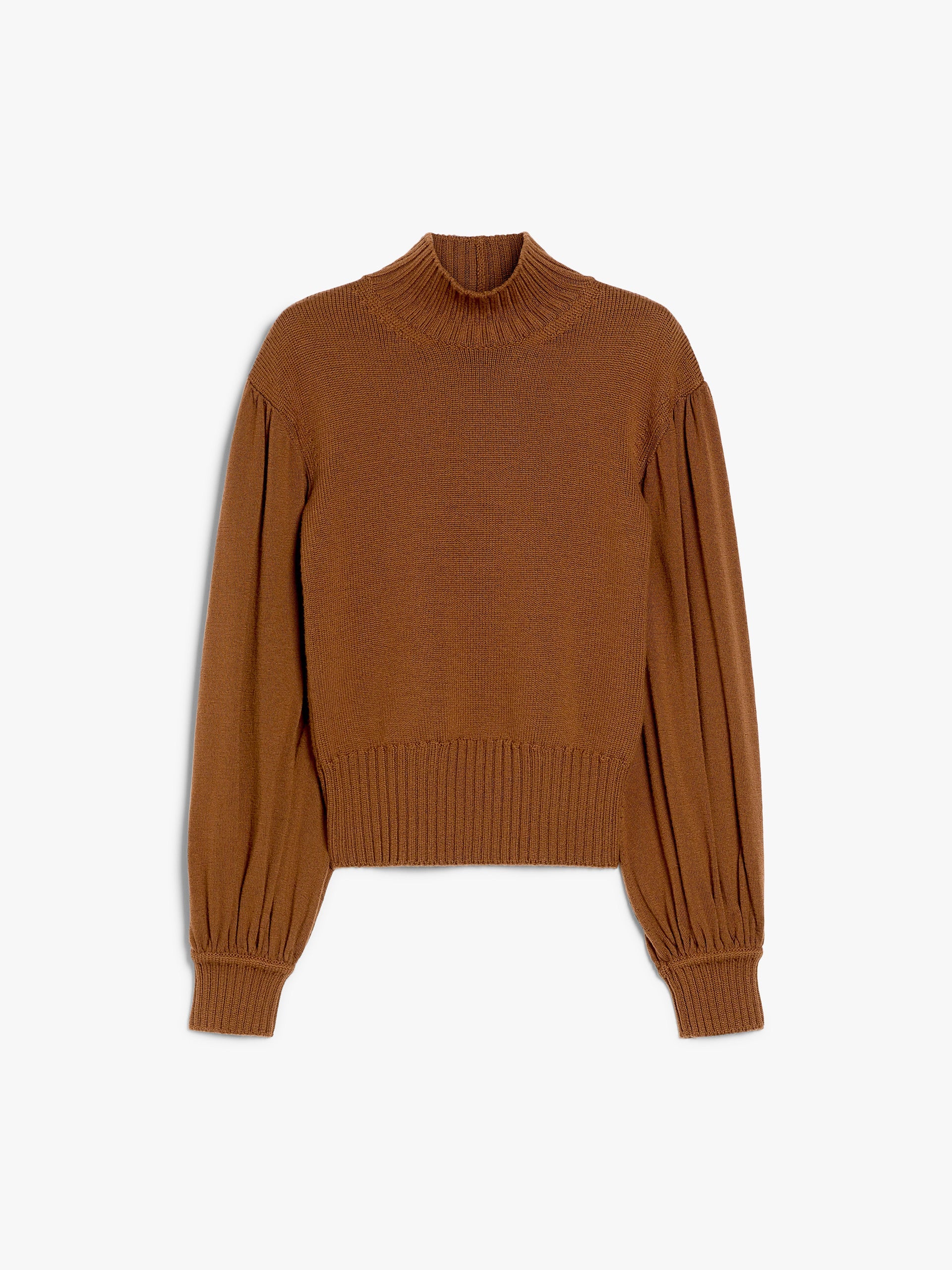 Turtleneck jumper in luxurious, smooth pure wool yarn. The garment is gently cropped to the waist and features wide puff sleeves with dropped shoulders. Finished with a collar, cuffs and ribbed edge.