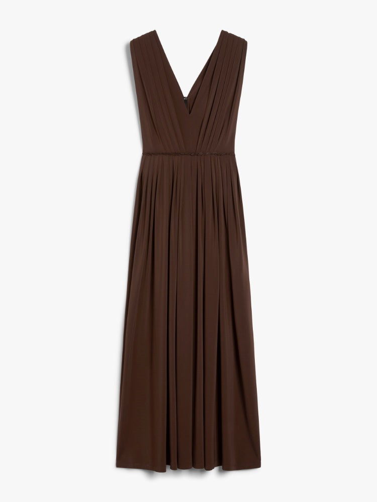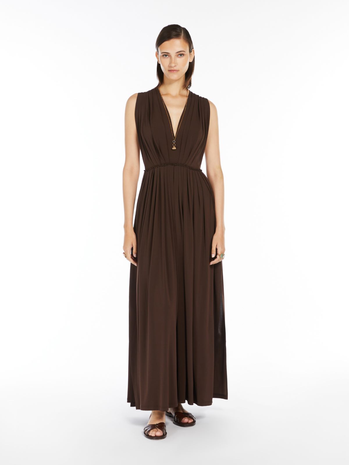 Long sleeveless dress in soft stretch viscose jersey, featuring a feminine silhouette with an irregular pleated pattern at the waist seam and shoulders. It features a wide V neck at the front and back, with gathered pleats at the back and a loose-fitting skirt with square side slits. Finished with open armholes on the side, it closes with an concealed zip on the back.
