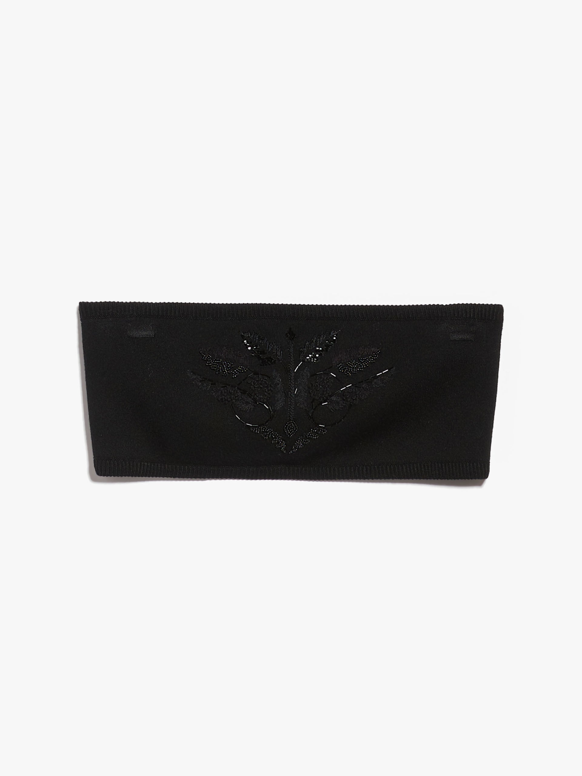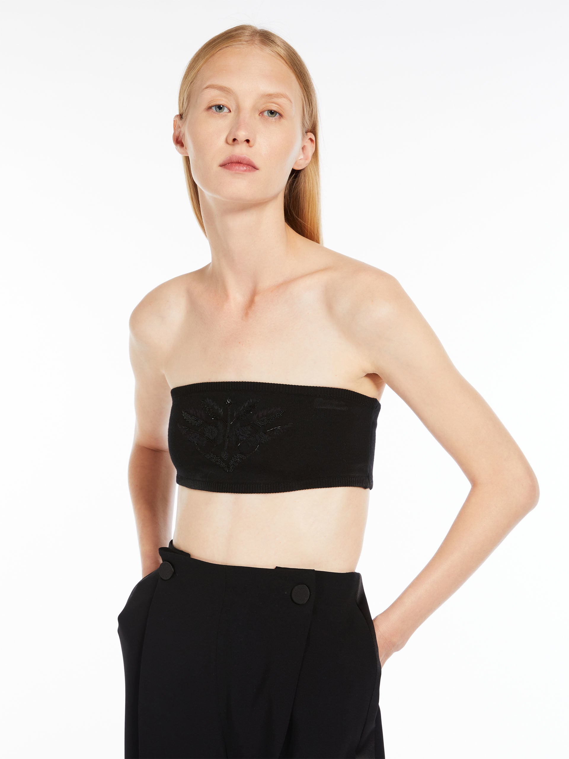 Bandeau top in a soft stretch viscose knit, embellished with an elegant thread and bead embroidery on the front. Finished with ribbed edges.