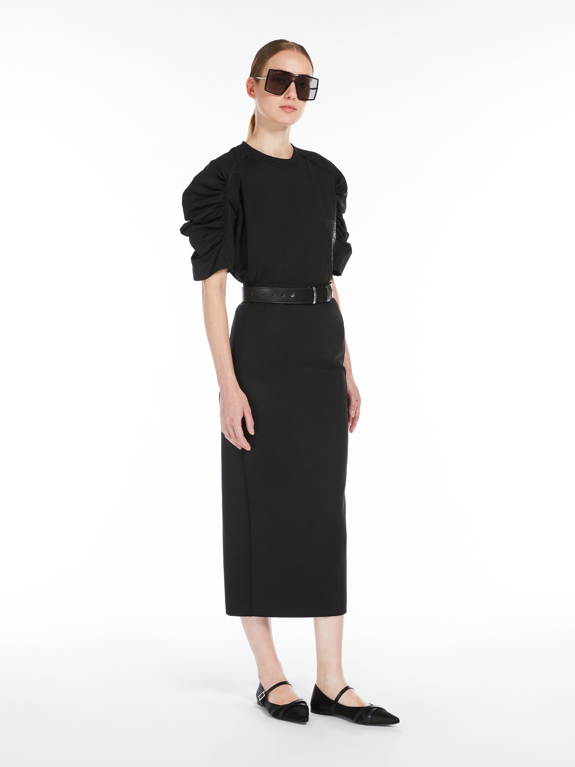 Boxy T-shirt in a technical cotton blend jersey, featuring short raglan sleeves in pure cotton poplin with a gathered balloon motif. Embellished with a tone-on-tone rubber MaxMarabesque detail printed on the chest, on the left side when worn. Concealed zip fastening at the back of the neck.