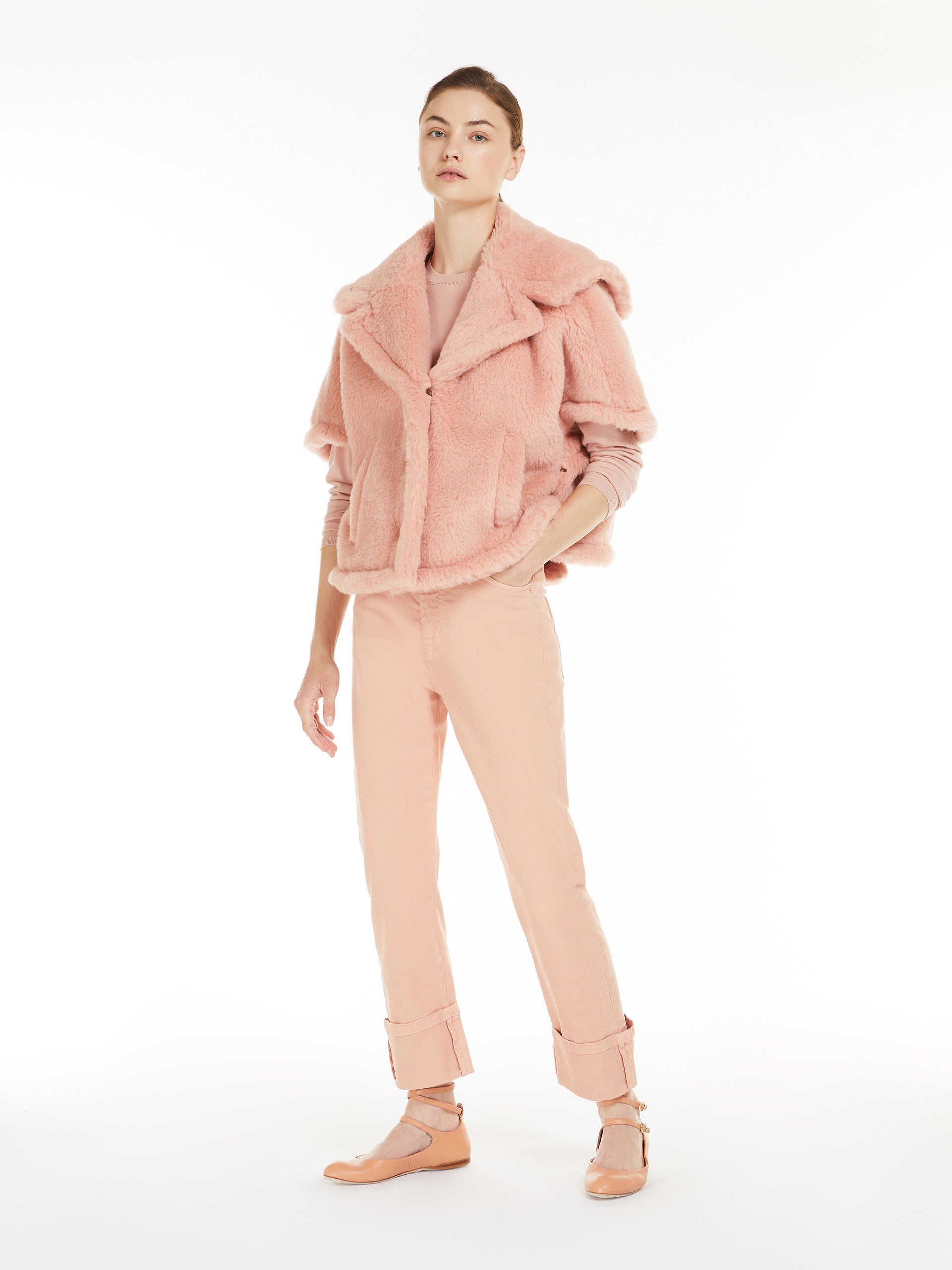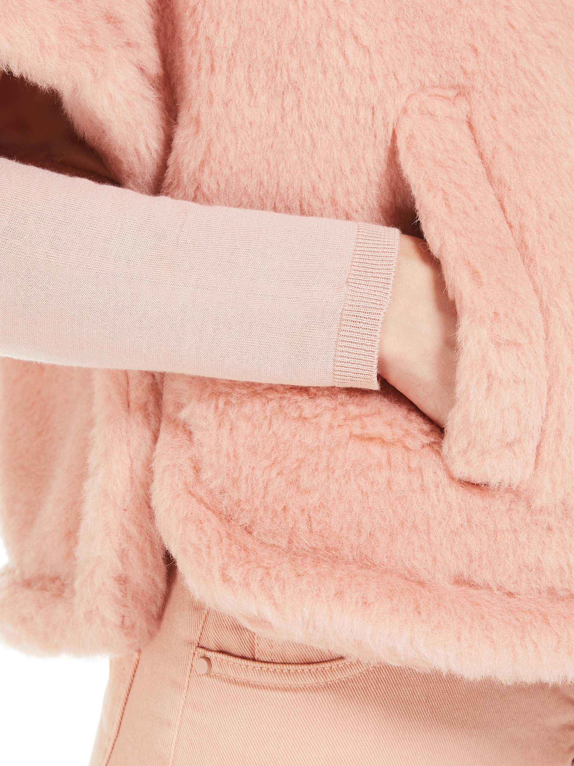 Cape made of soft alpaca and wool Teddy fabric on a silk base. The wide, enveloping volume features an oversized slit at the back, marinière-inspired wide lapel collar, short sleeves and vertical welt pockets. Satin lining. Asymmetric single-breasted fastening with buttons.