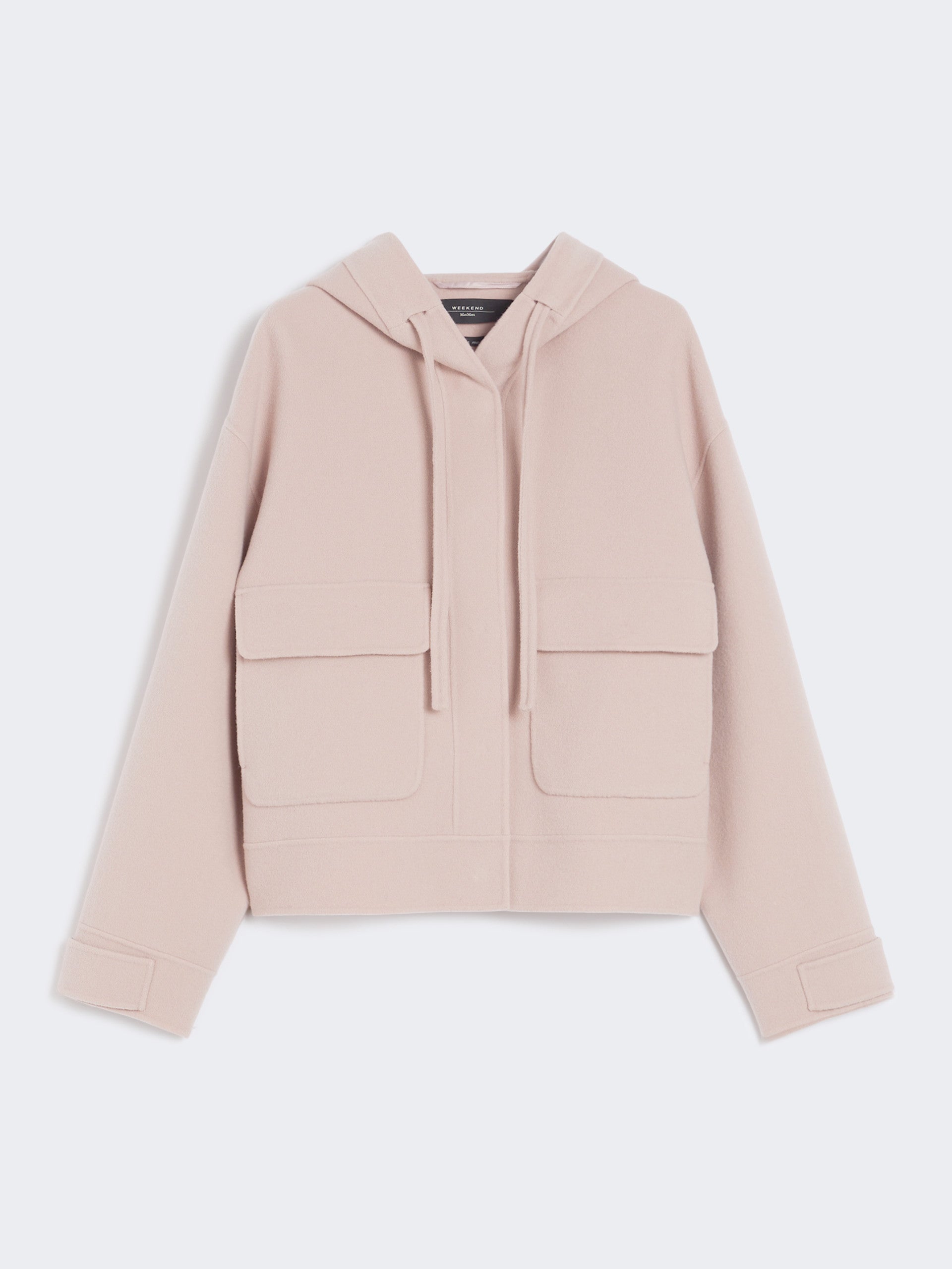 Sporty-feel jacket featuring a drawstring hood and slightly cropped cut.