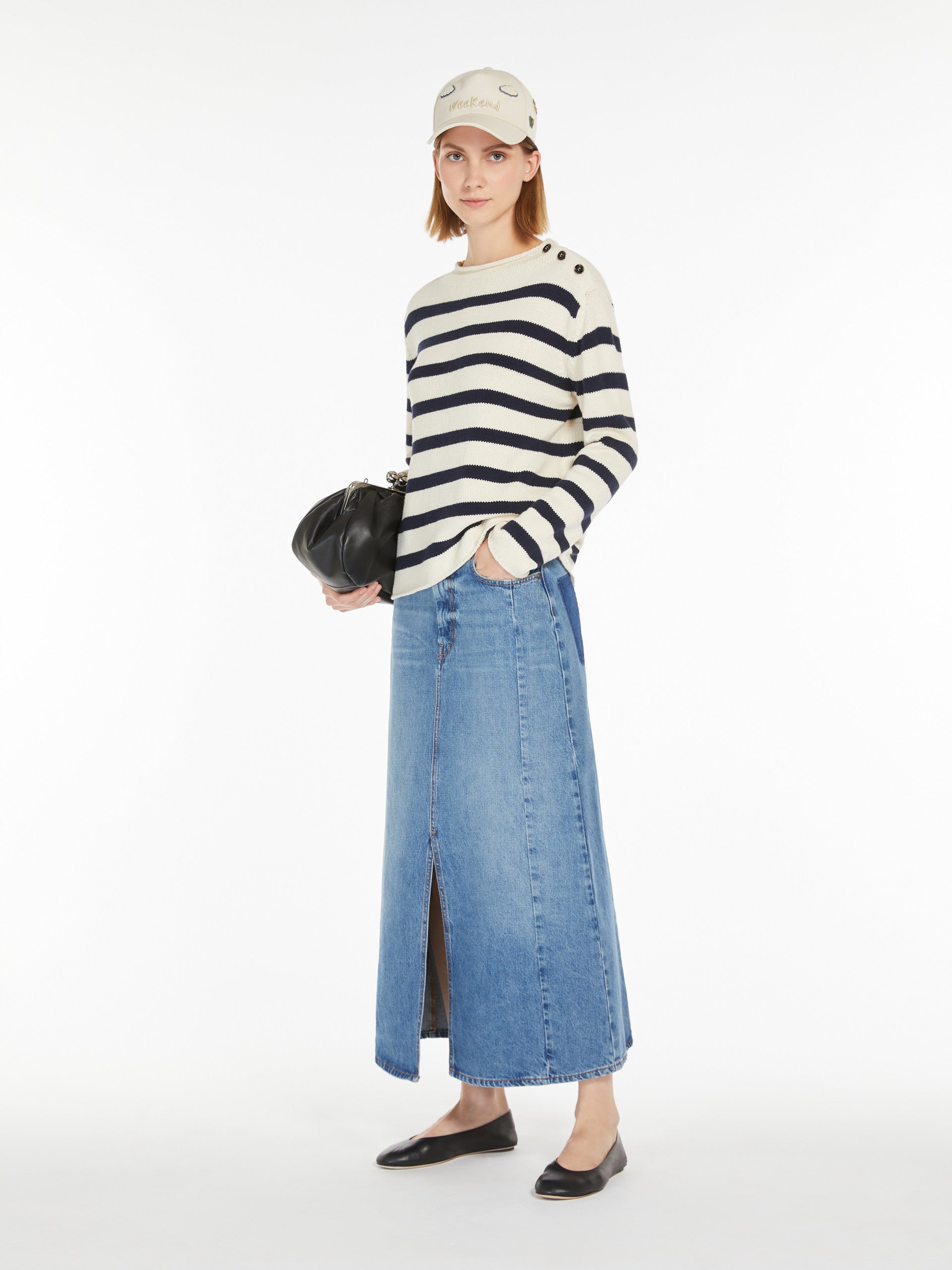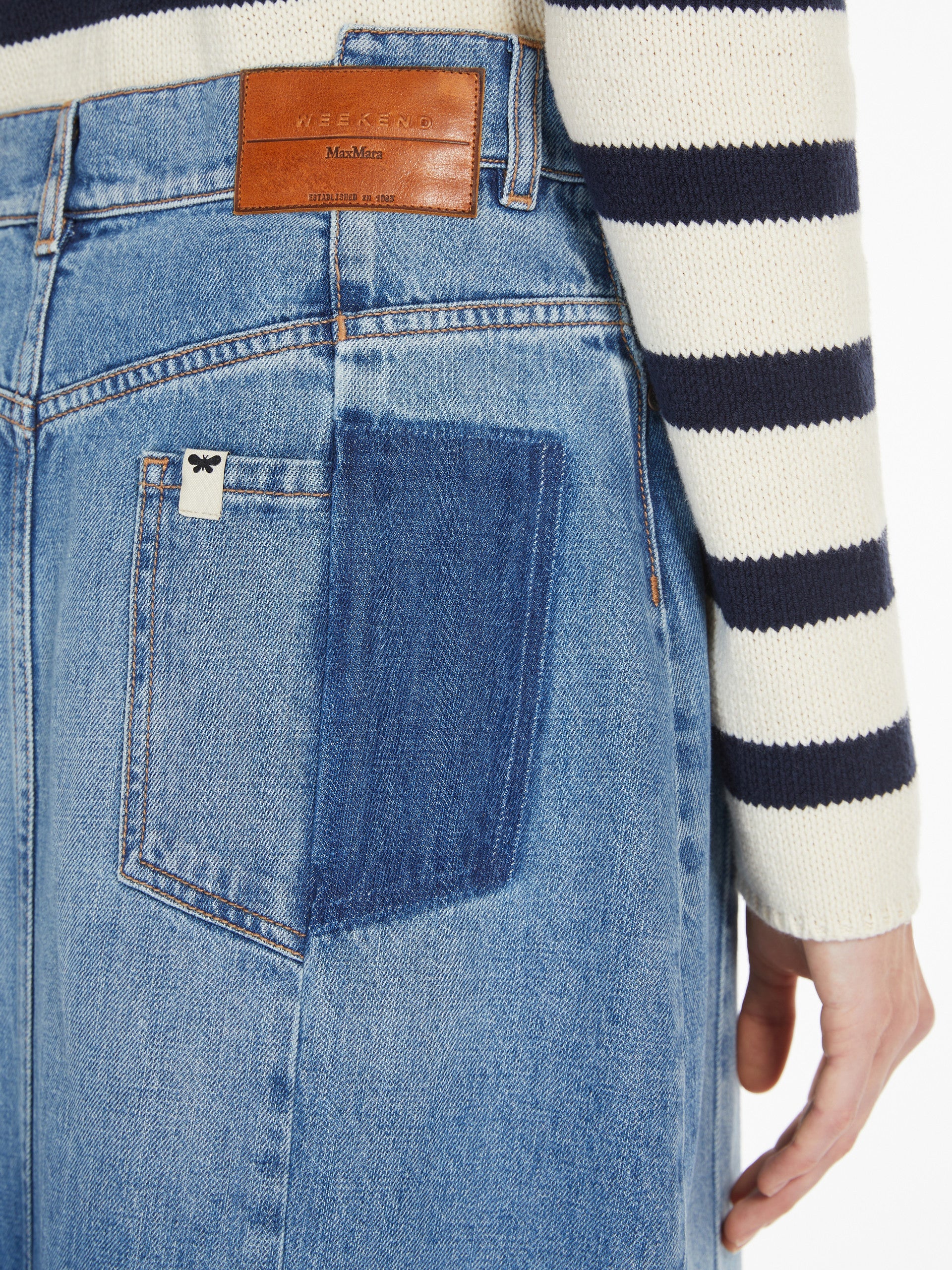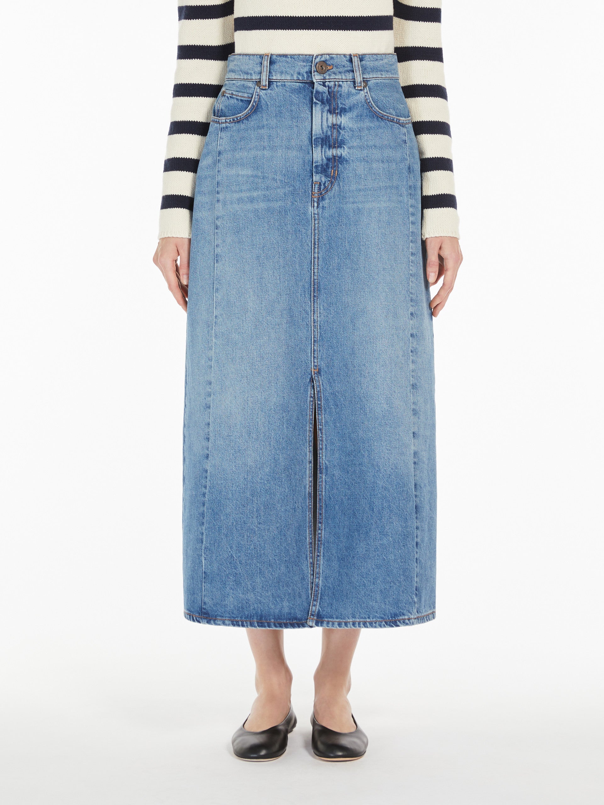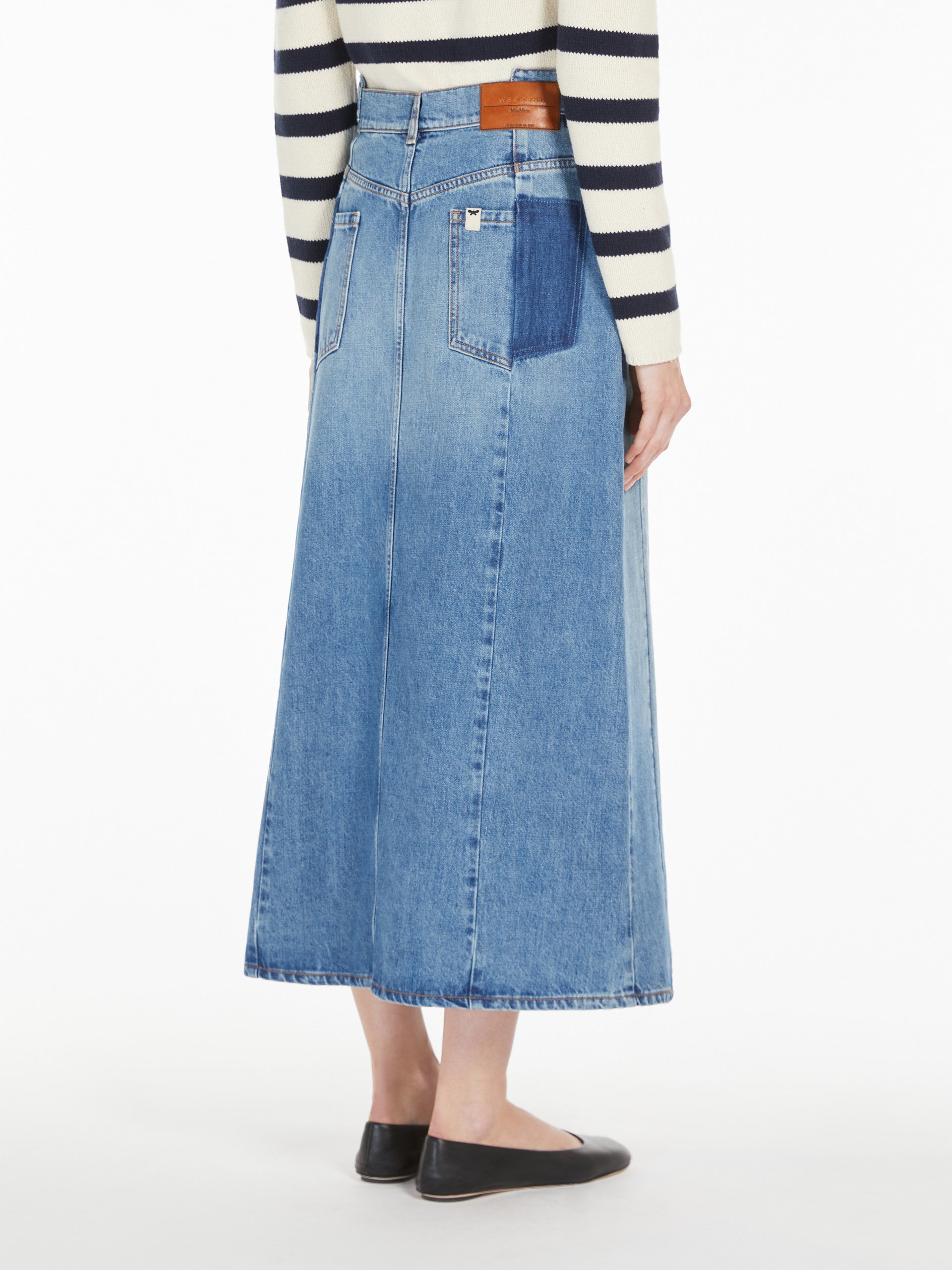 Slightly flared long skirt in authentic-look pure cotton denim fabric. The model boasts a 5-pocket design, vertical darts on the front and back, and asymmetrical details that set the back of the garment apart. Embellished with belt loops at the waist, metal rivets and a butterfly logo-adorned grosgrain rear waist tag. Fly-covered zip and tack button fastening on the front.