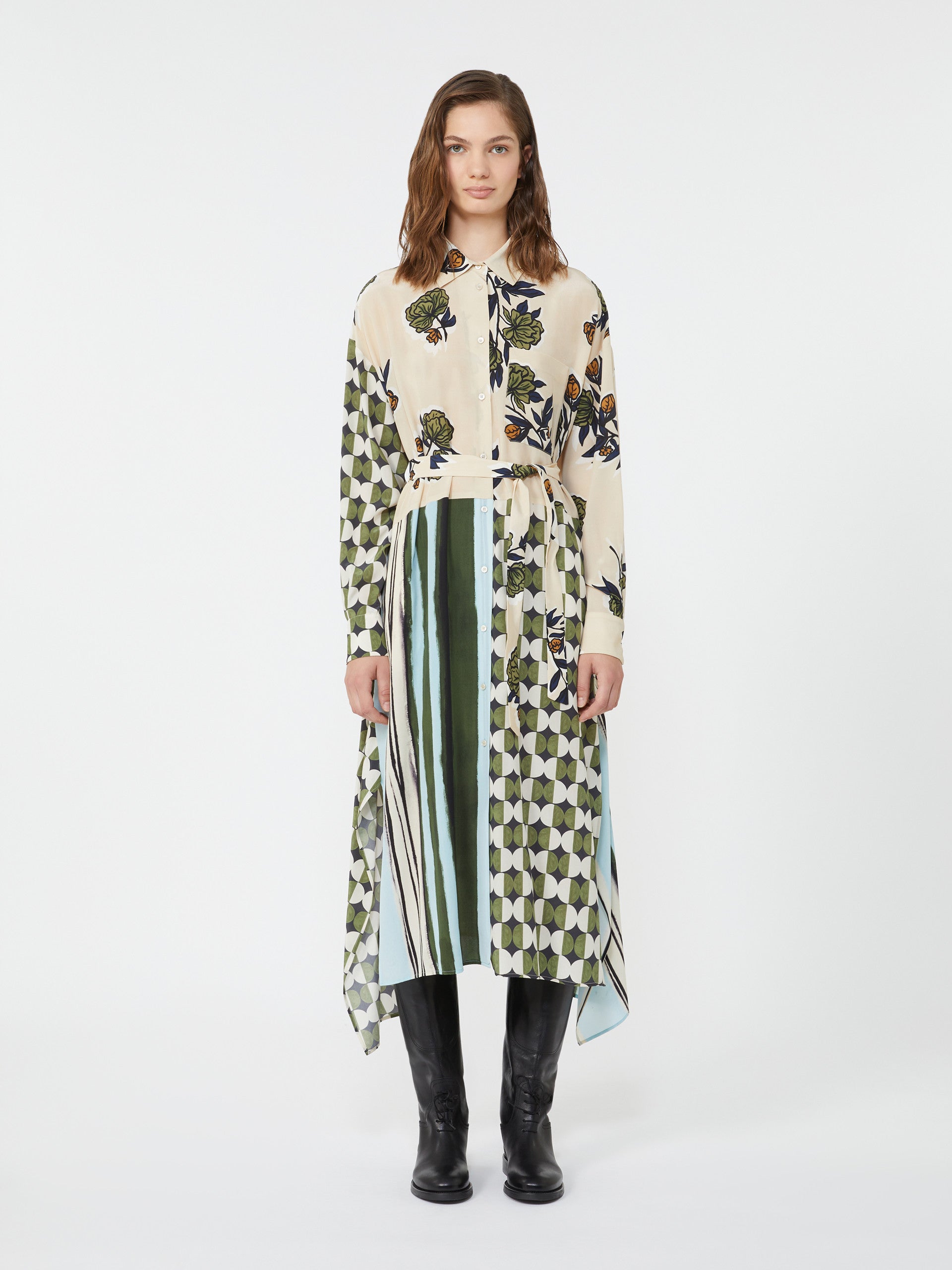 Midi shirt dress, cut at the waist with matching sash to tie. The play of patchwork prints brings movement to the garment.