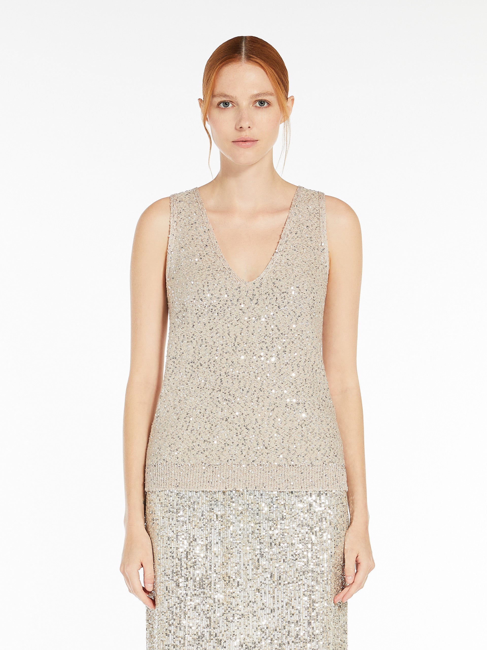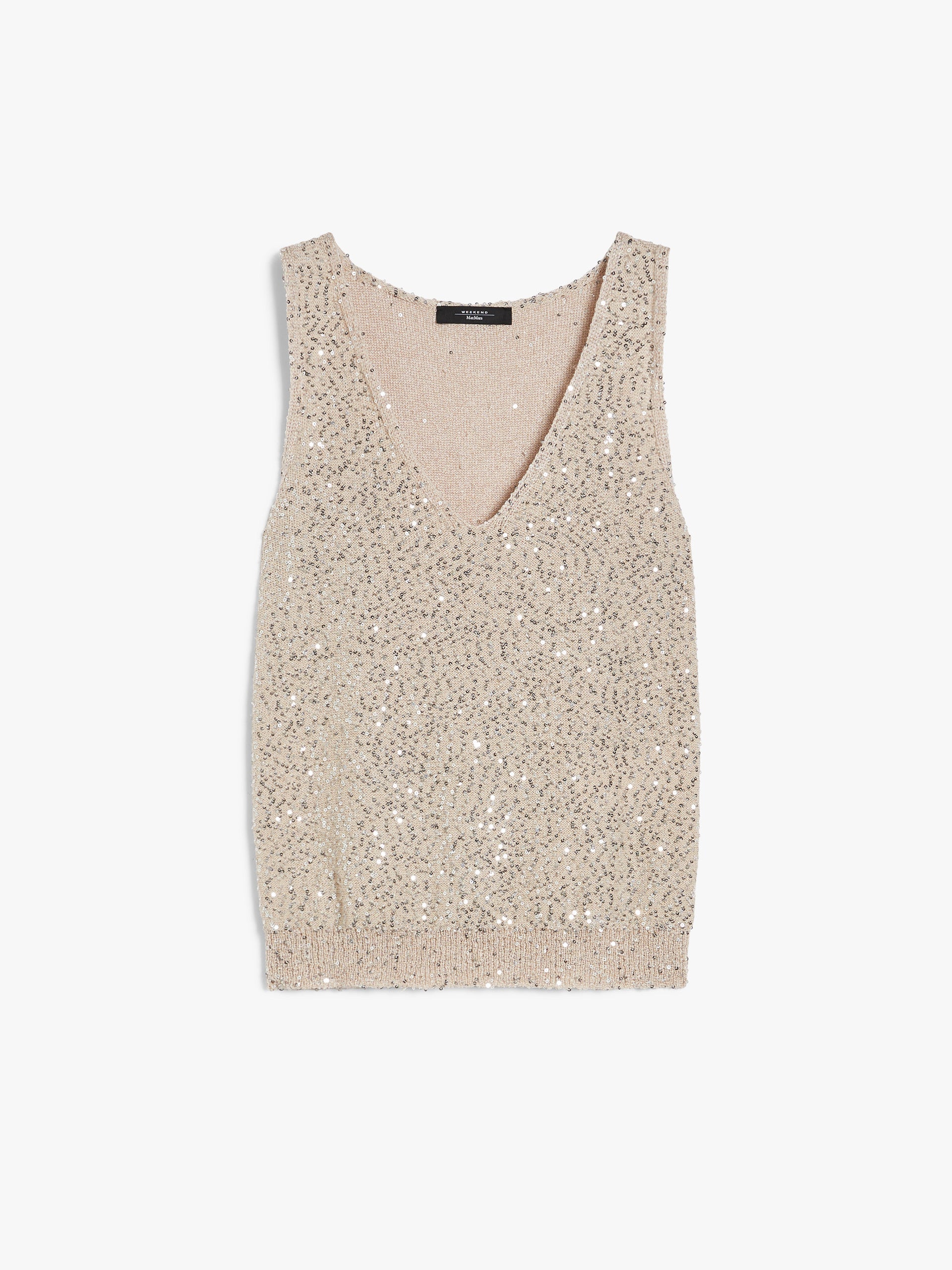 Relaxed-fit sleeveless sequin yarn top. The regular-fit model boasts a plunging V-neckline on the front and back, in addition to a rib-knit hem.