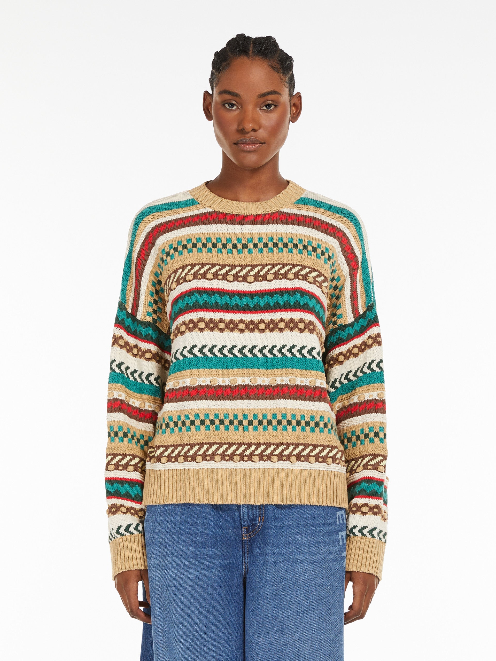 Long-sleeved cotton yarn sweater featuring a jacquard-knit Fair Isle pattern. The relaxed-fit model boasts a regular length, round neckline, dropped shoulders and rib-knit trims.