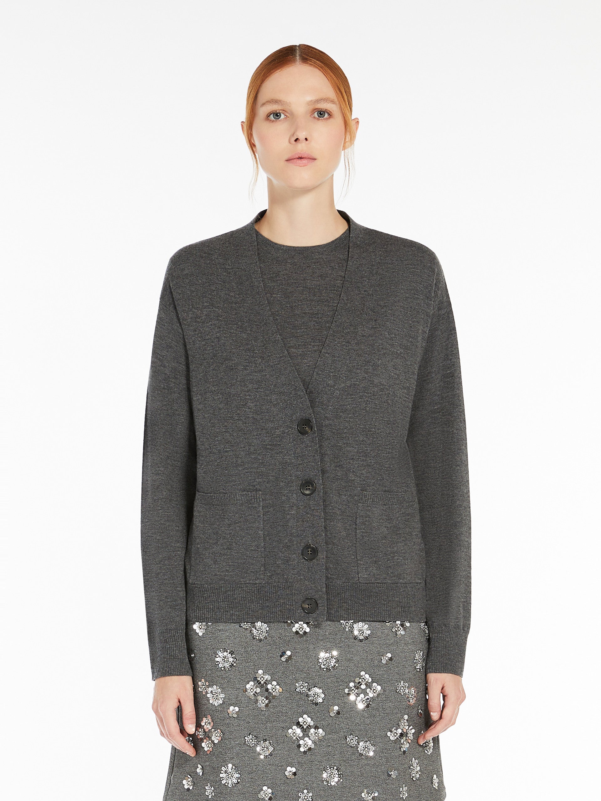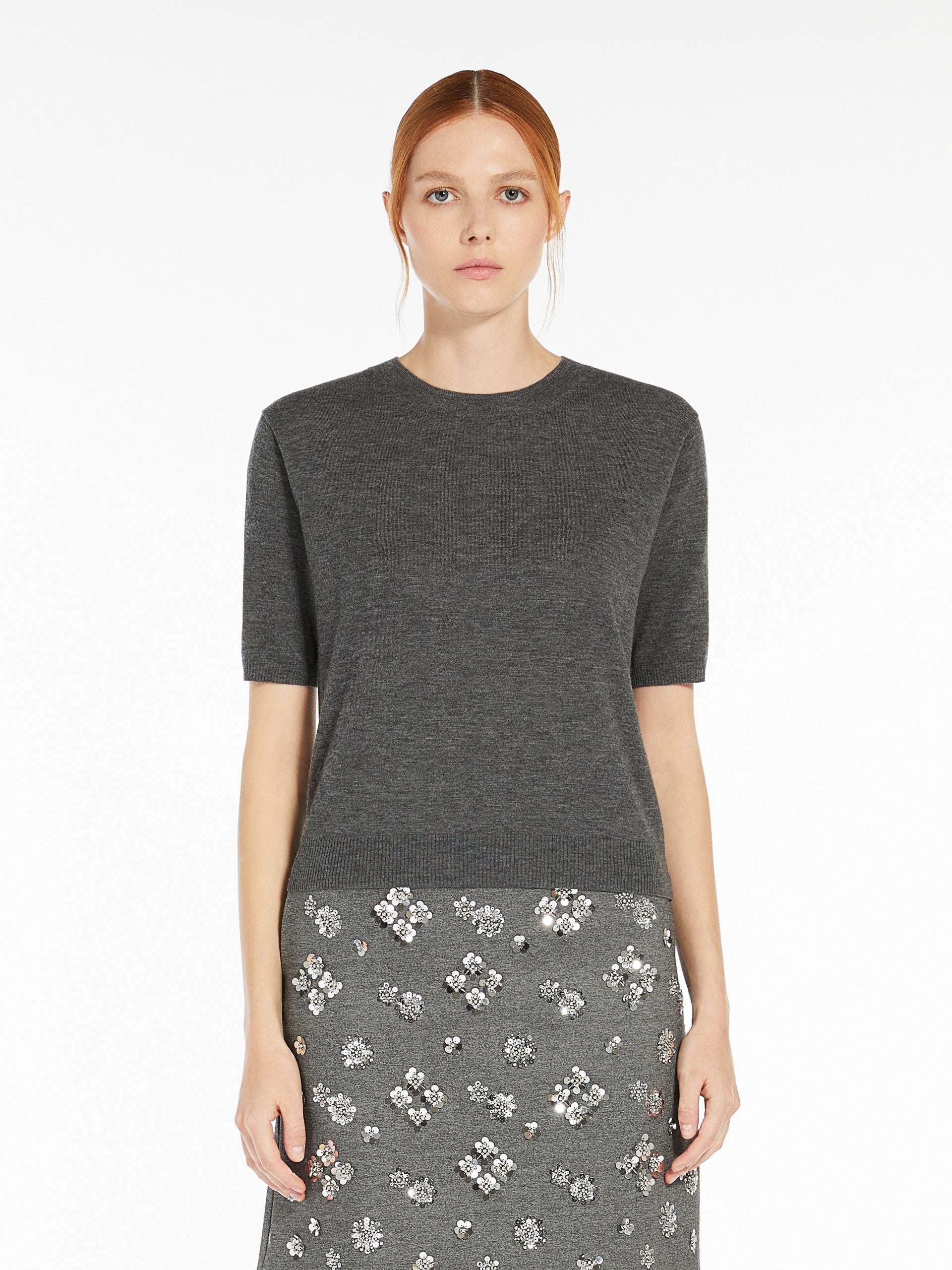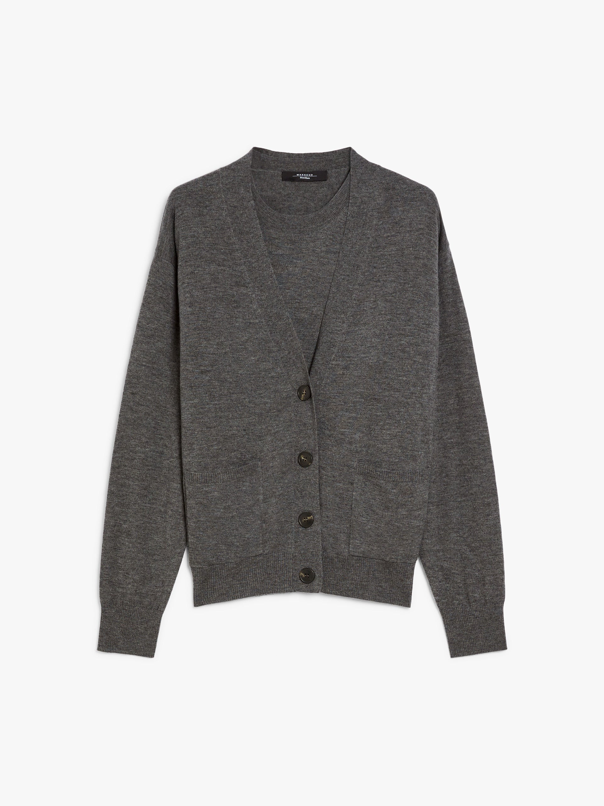 Twin set in fine wool and cashmere yarn comprising a short-sleeved sweater and V-neck cardigan. The sweater boasts a regular fit and crew neckline, whilst the cardigan features a relaxed fit, dropped shoulders and patch pockets. Button fastening. Both garments are embellished with rib-knit trims.