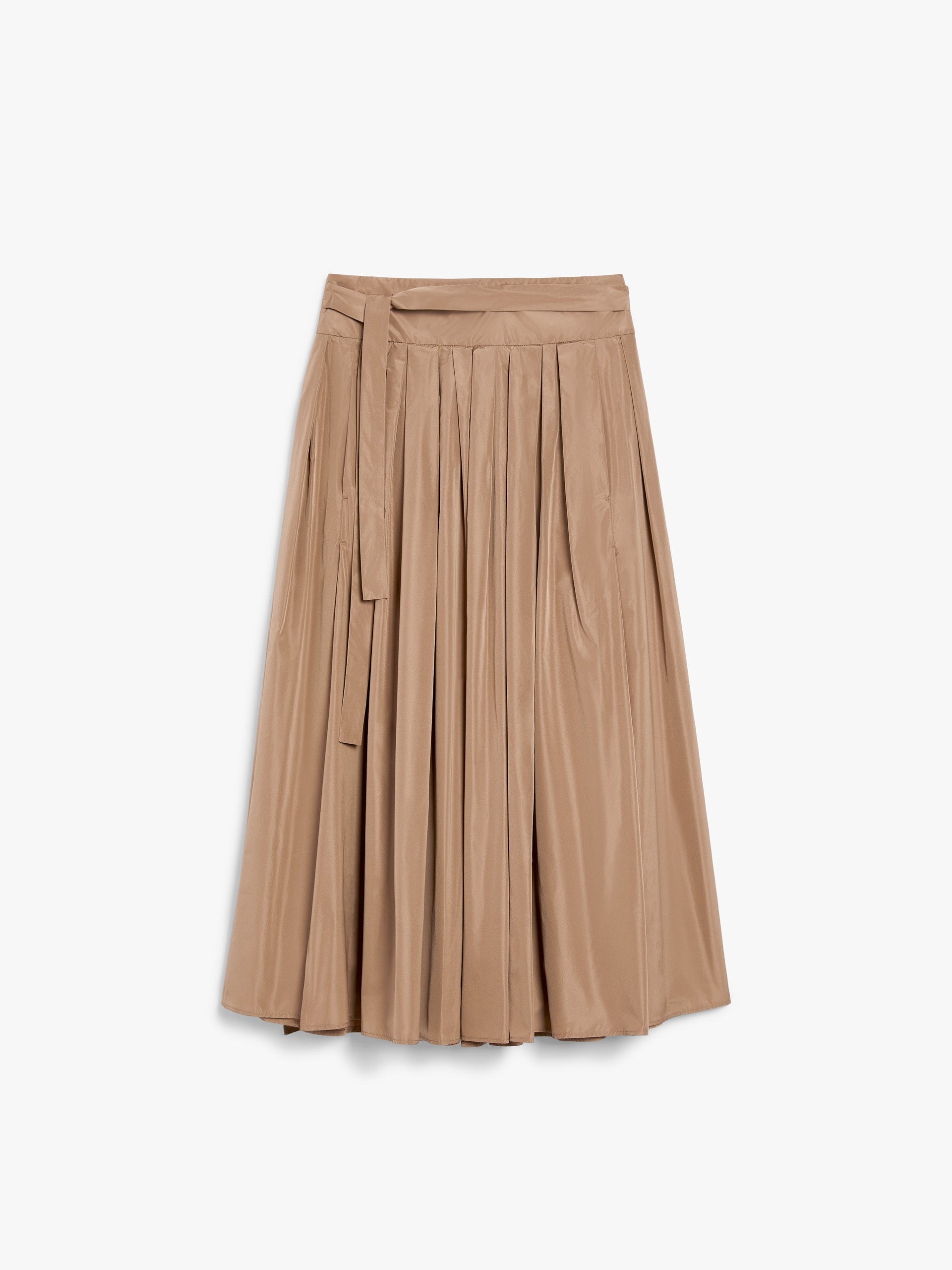 Long skirt in water-repellent taffeta fabric featuring a full pleated cut and waistline-accentuating matching belt that fastens by means of small mother-of-pearl buttons. In-seam side pockets. Concealed zip fastening at the back.