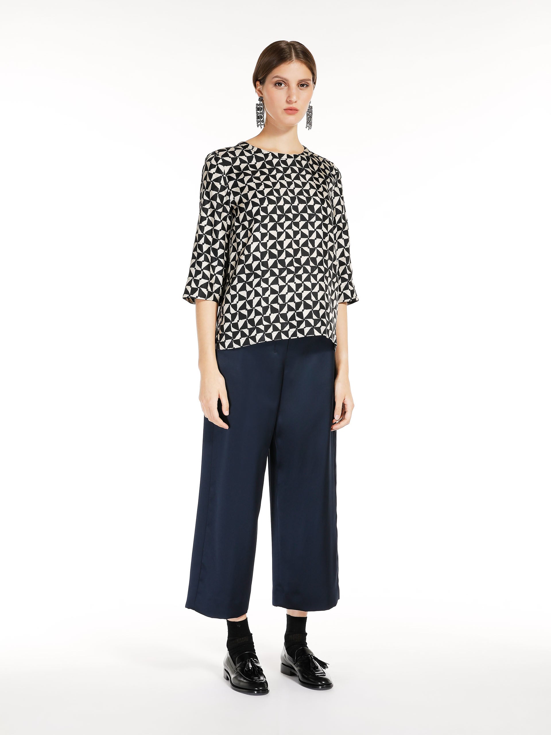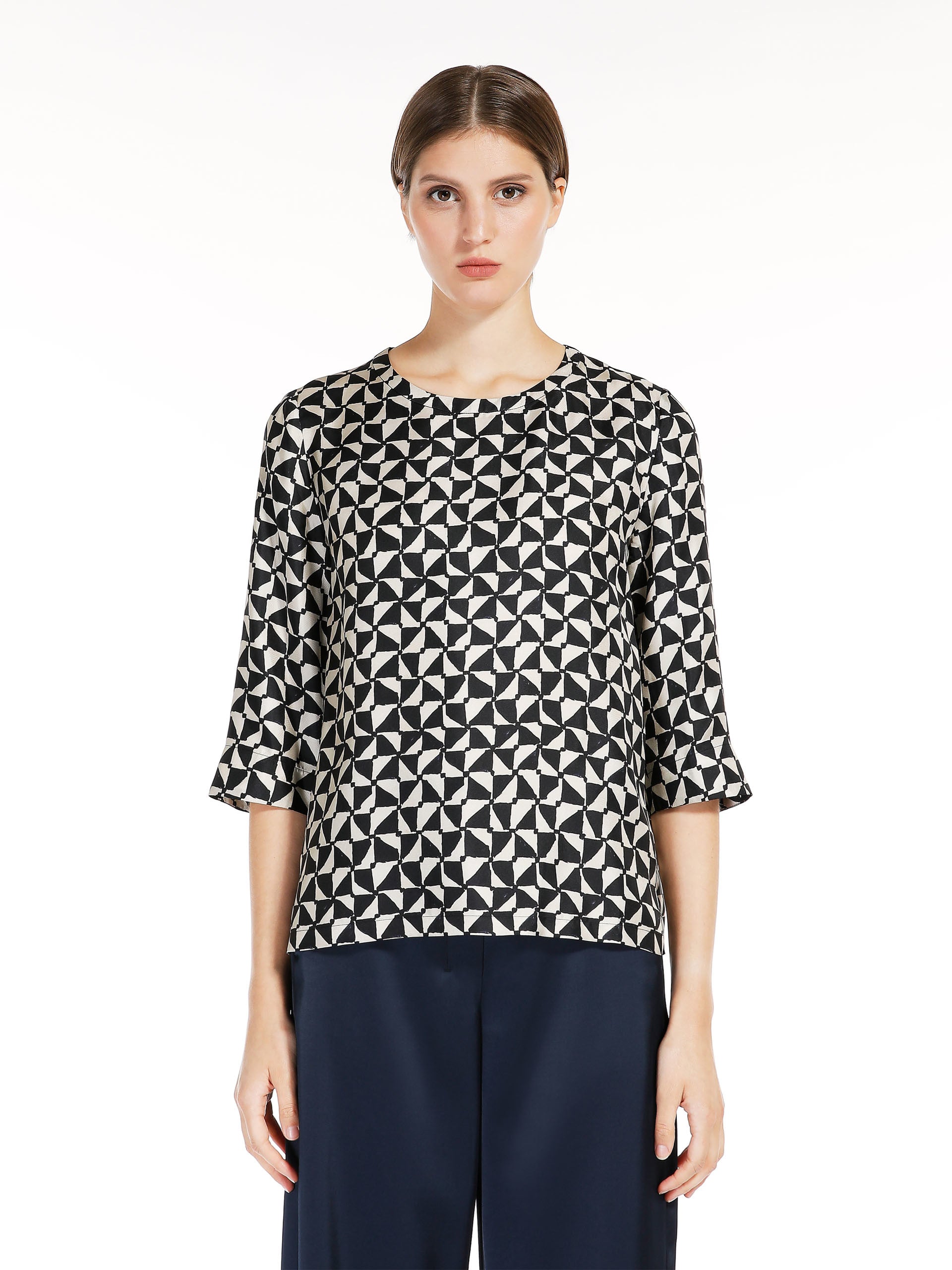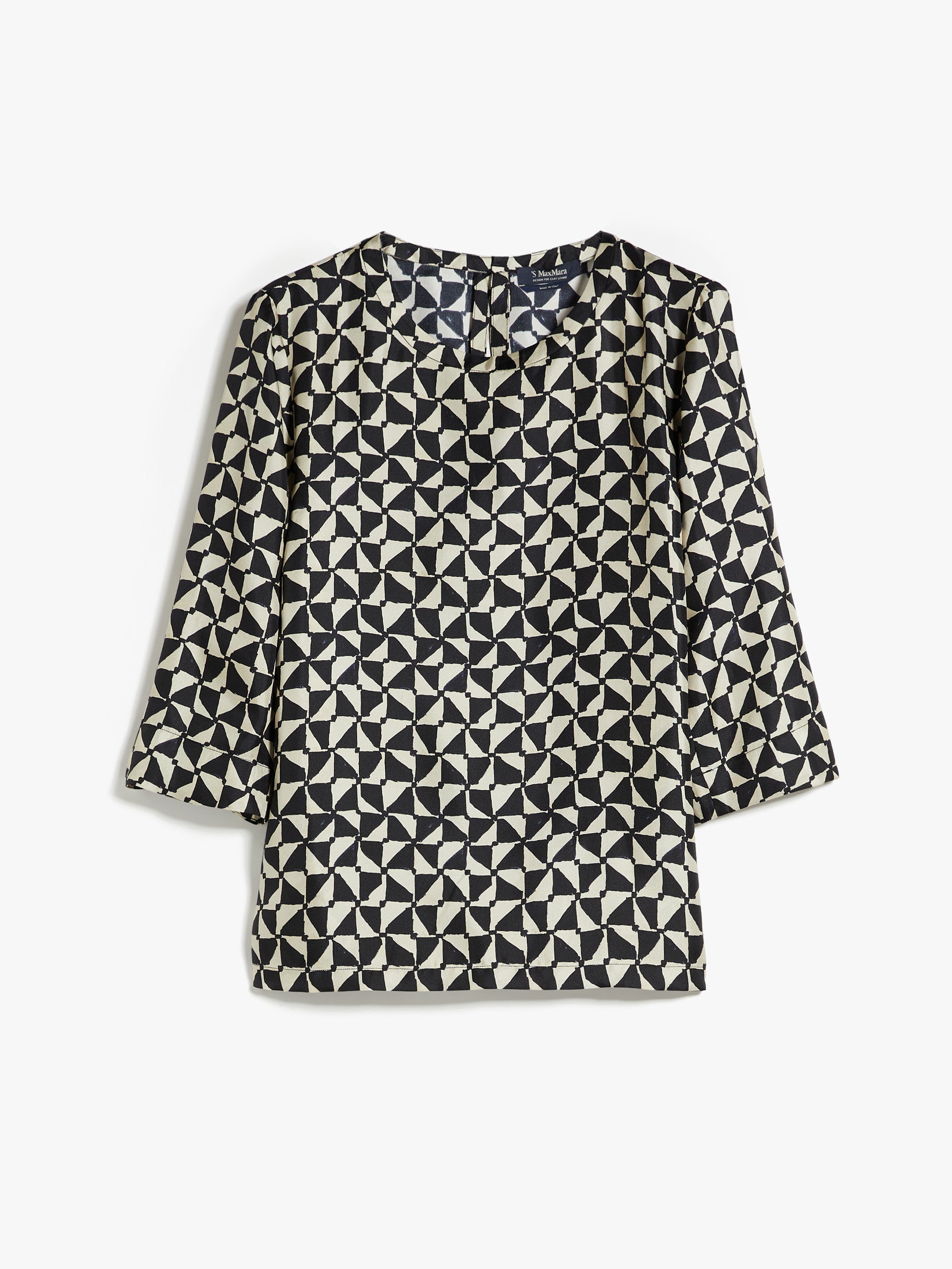 3/4-sleeve crew-neck blouse in fine printed pure silk twill fabric. Small slit-embellished hem. Length: 62 cm.