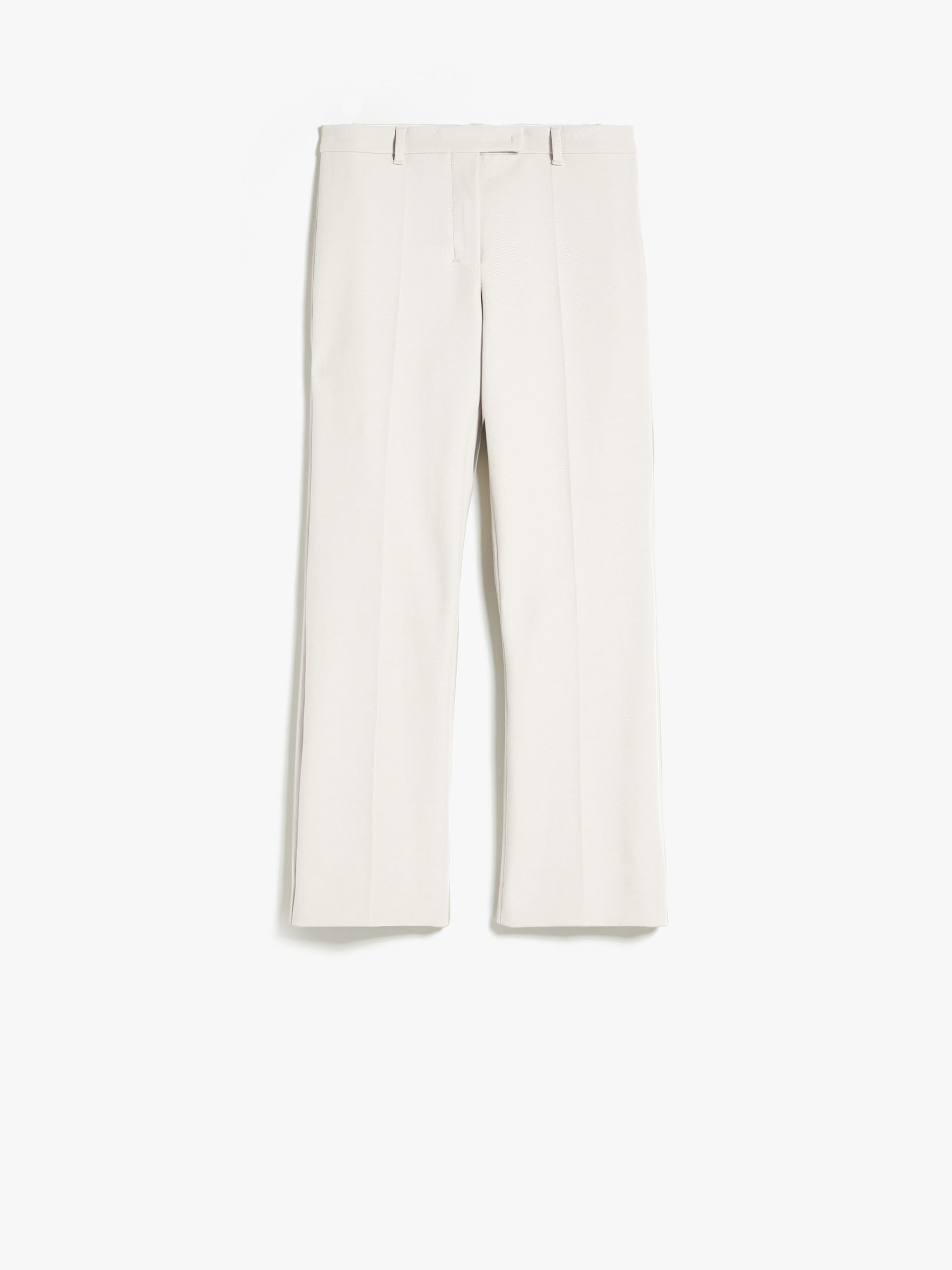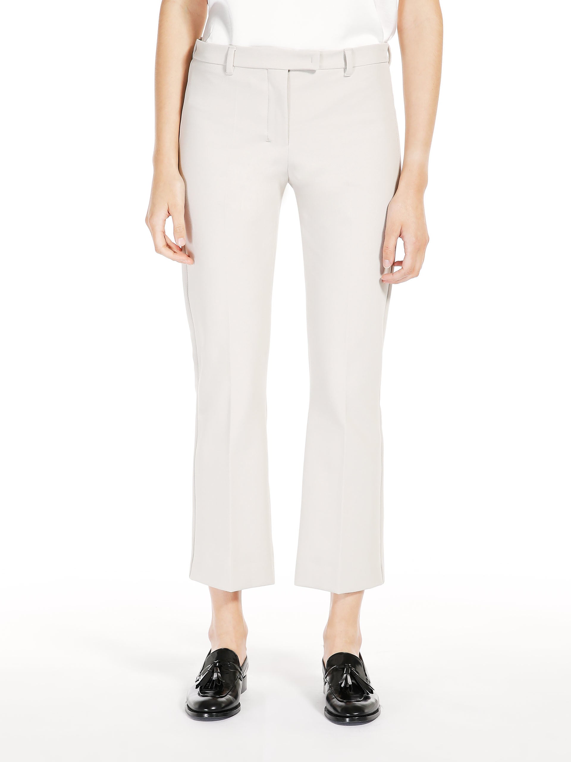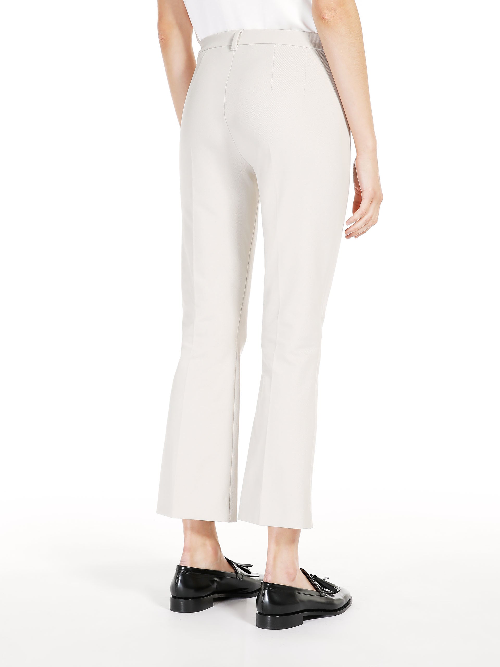 Slightly flared trousers in stretch cotton-blend fabric. Embellished with pressed pleat detail on the leg, in addition to belt loops. Extended waist tab, complete with a placket-covered zip and hook-and-bar fastening. Length: 94 cm.