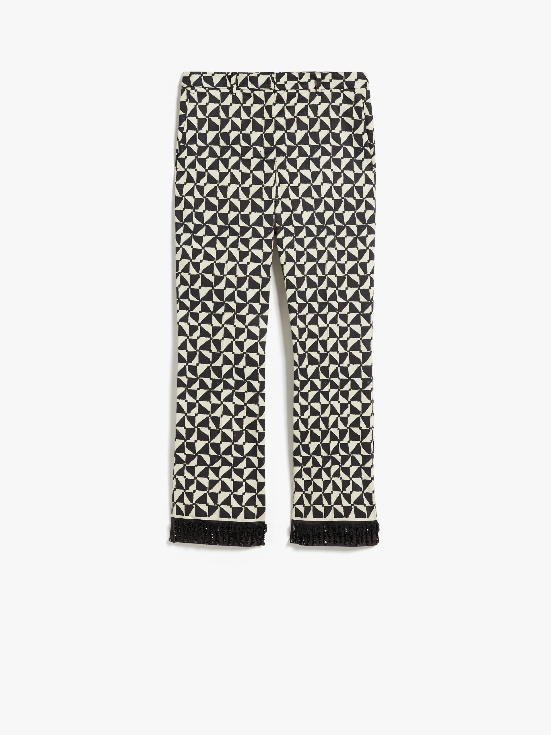 Trousers in printed stretch cotton satin fabric featuring a contrasting band at the hem, complete with removable black jet-embroidered detail. Pressed pleat on the leg, bias-cut pockets and an extended waist tab, complete with a placket-covered zip and hook-and-bar fastening. Length: 98 cm.