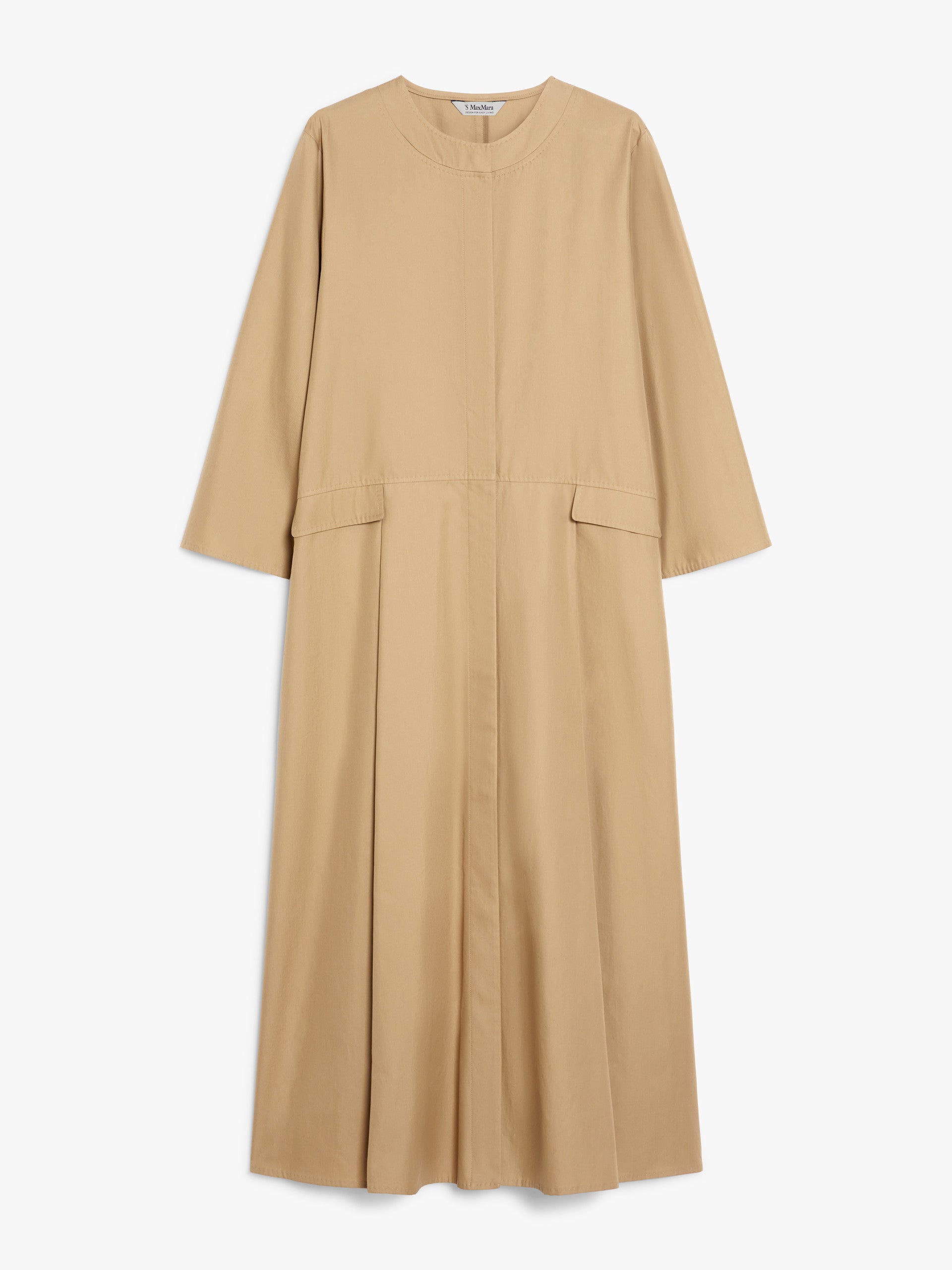 Long dress in pure-cotton twill with a washed texture, distinguished by the oversized volume of its wide, flared skirt, seam on the waist front with applied flaps, and an adjustable drawstring at the back of the waist. Crew-neck style finished with long set-in sleeves and inset side pockets. Concealed button fastening at the front.