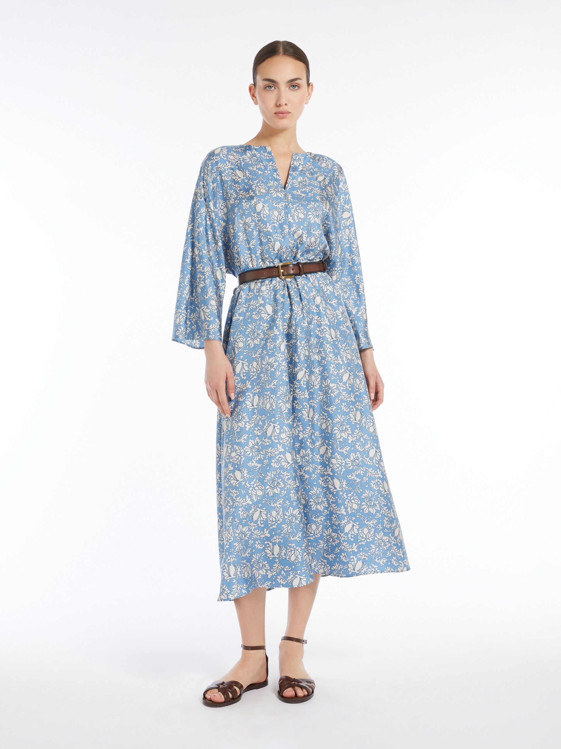 Long flared dress in fine printed pure silk twill fabric. The model boasts a small V-neck front and long kimono sleeves. The adjustable waist drawstring accentuates the silhouette, whilst creating volume and gathers at the back.