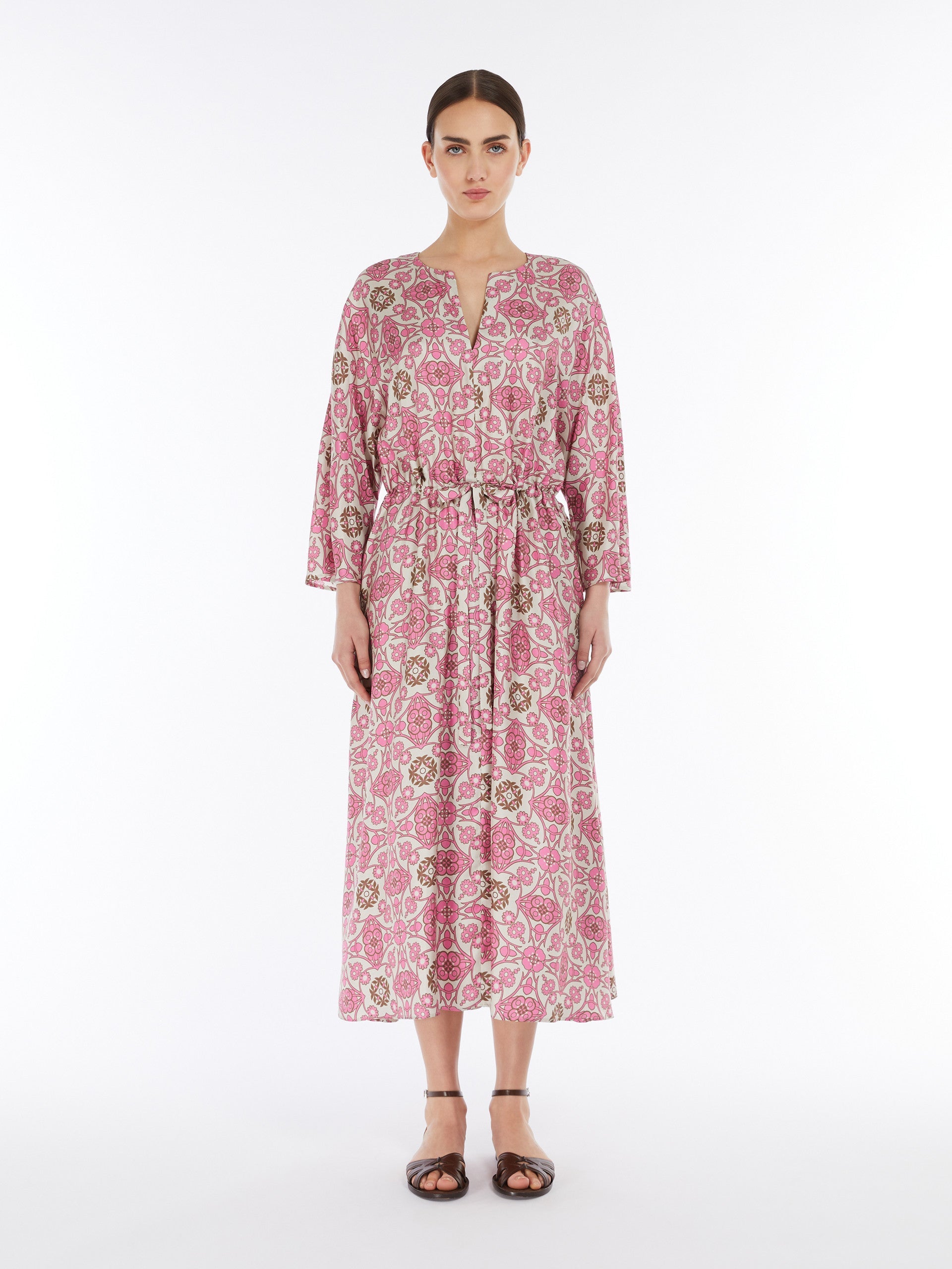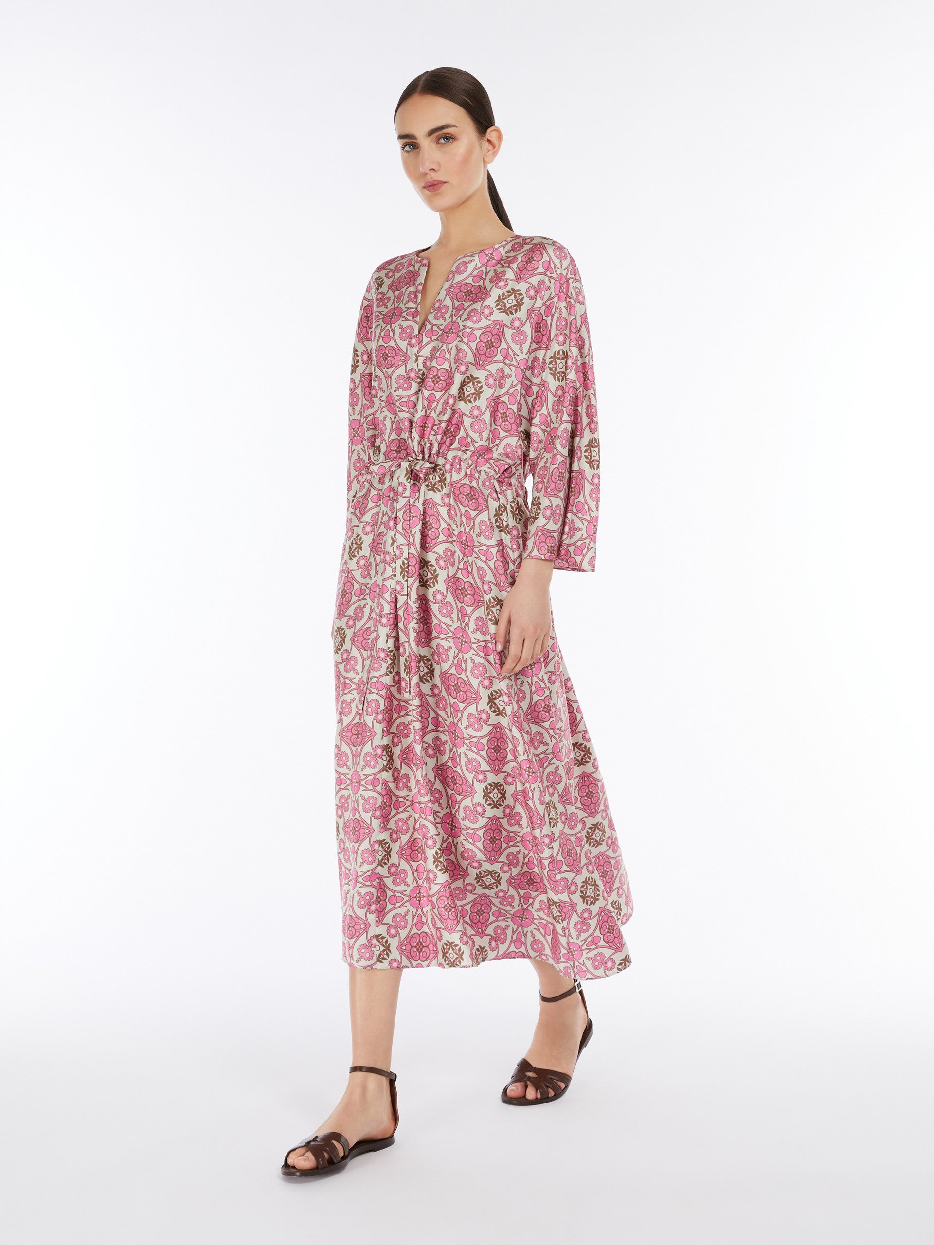 Flared long dress made of exquisite pure printed silk twill. Unlined garment featuring a small V neck on the front and three-quarter kimono sleeves. The adjustable drawstring waist, elasticated at the back, accentuates the silhouette and creates volume and gathering at the back.