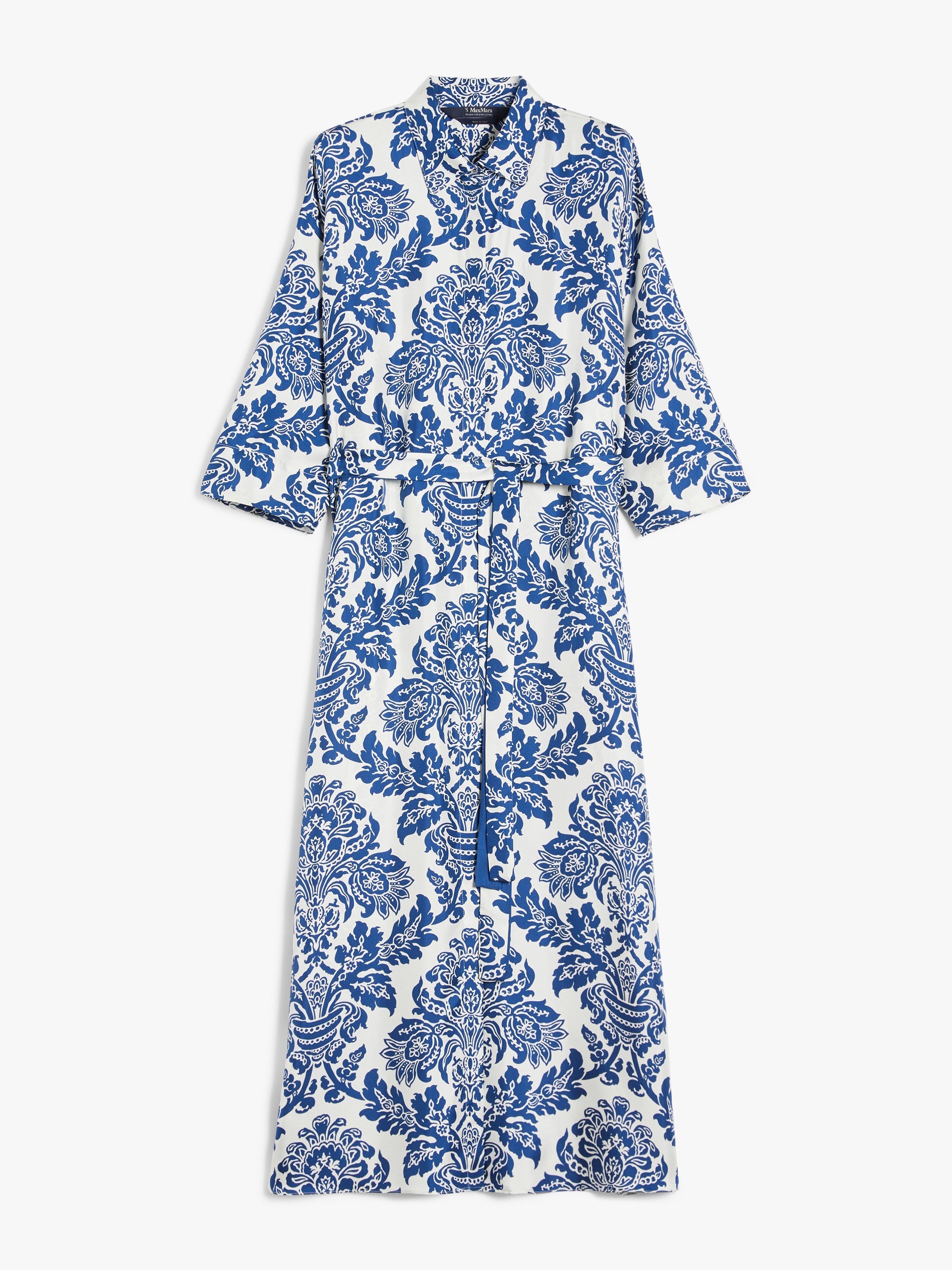 Long shirt dress made of fine exquisite pure printed silk twill. Straight, wide style, with a classic shirt collar, three-quarter sleeves with dropped shoulders and a back yoke. The two matching belts accentuate the silhouette. Features wide side slits and a front concealed button fastening.
