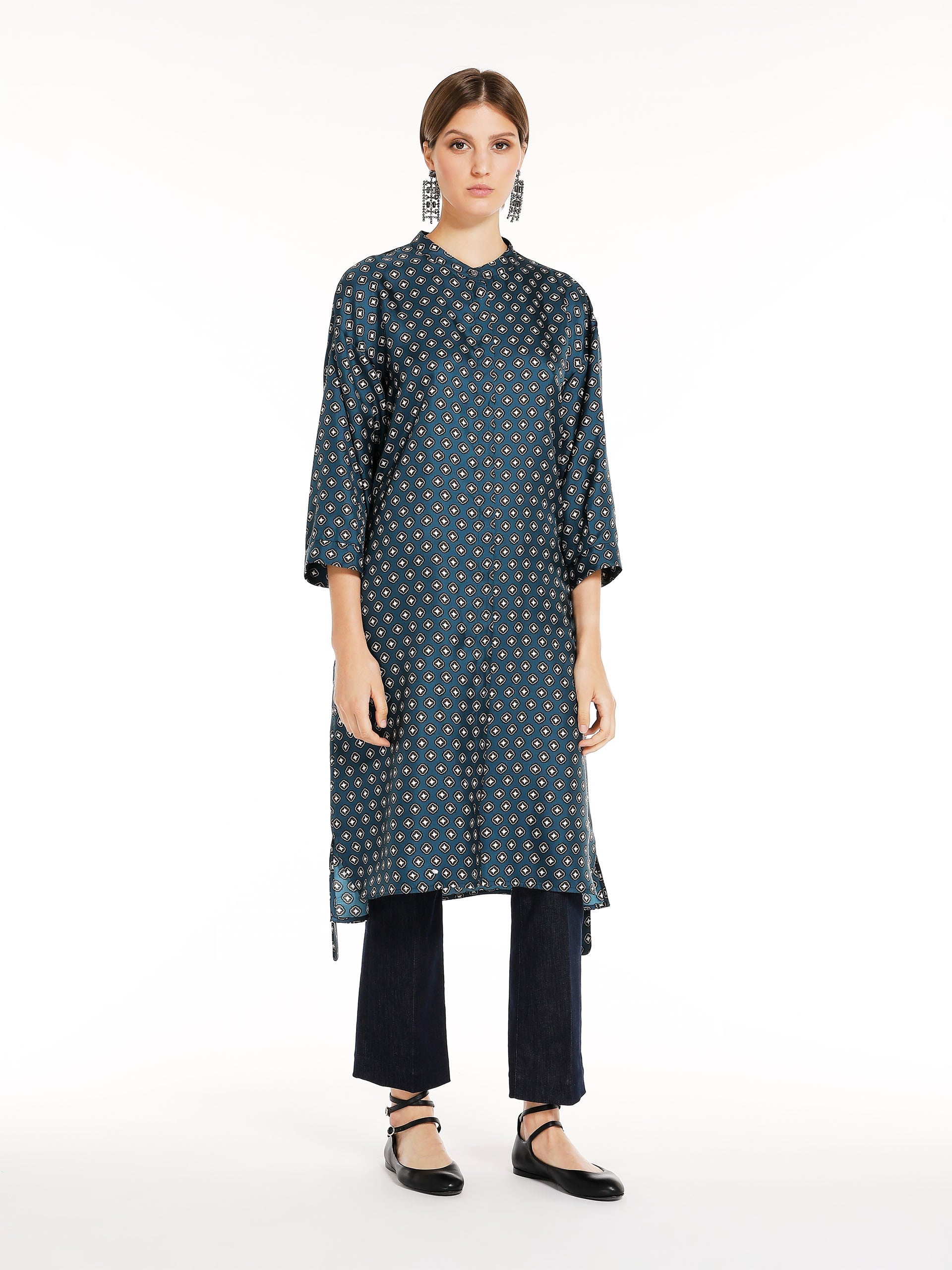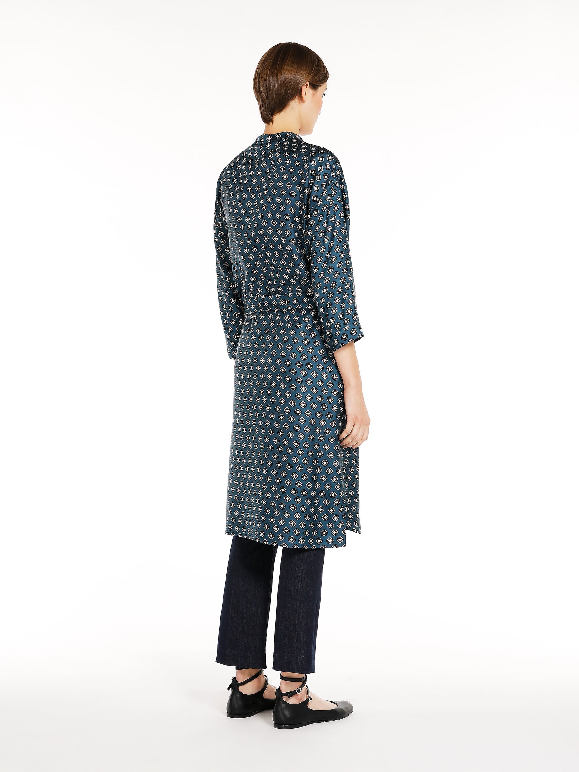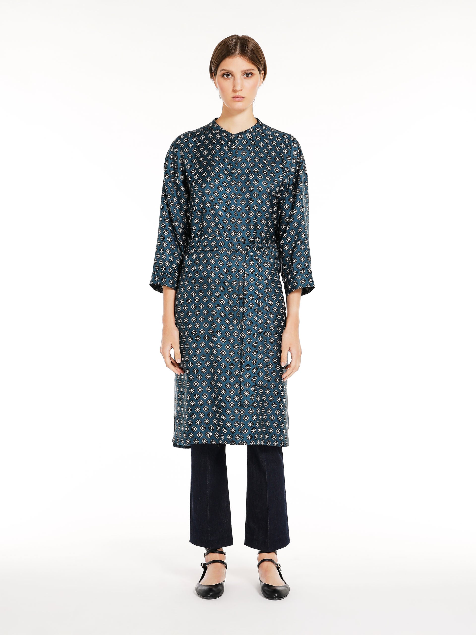 Short kaftan-style dress in fine printed pure silk twill fabric featuring a Mandarin collar and slightly low set-in 3/4 sleeves. Waistline-accentuating matching belt. Concealed button placket. Length: 107 cm.