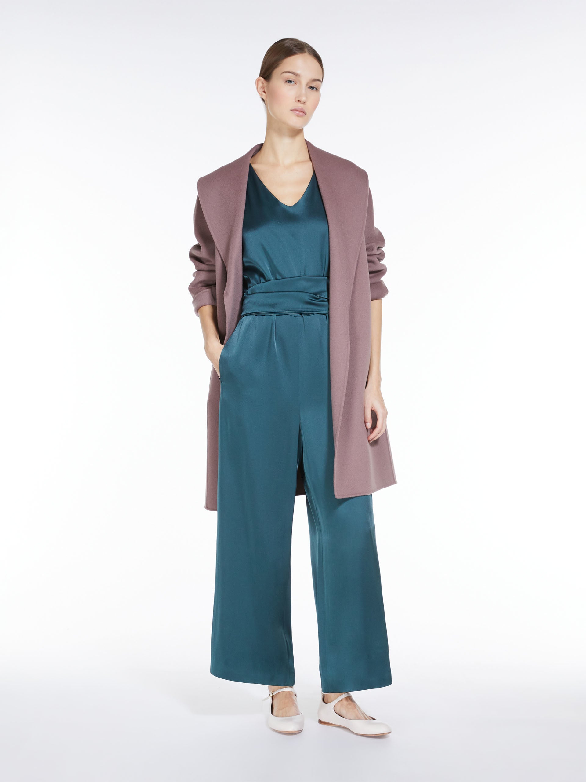 Elegant sleeveless jumpsuit in viscose-blend satin fabric featuring wide-leg bottoms and a V-neckline. Silhouette-accentuating matching belt. Length: 138 cm.