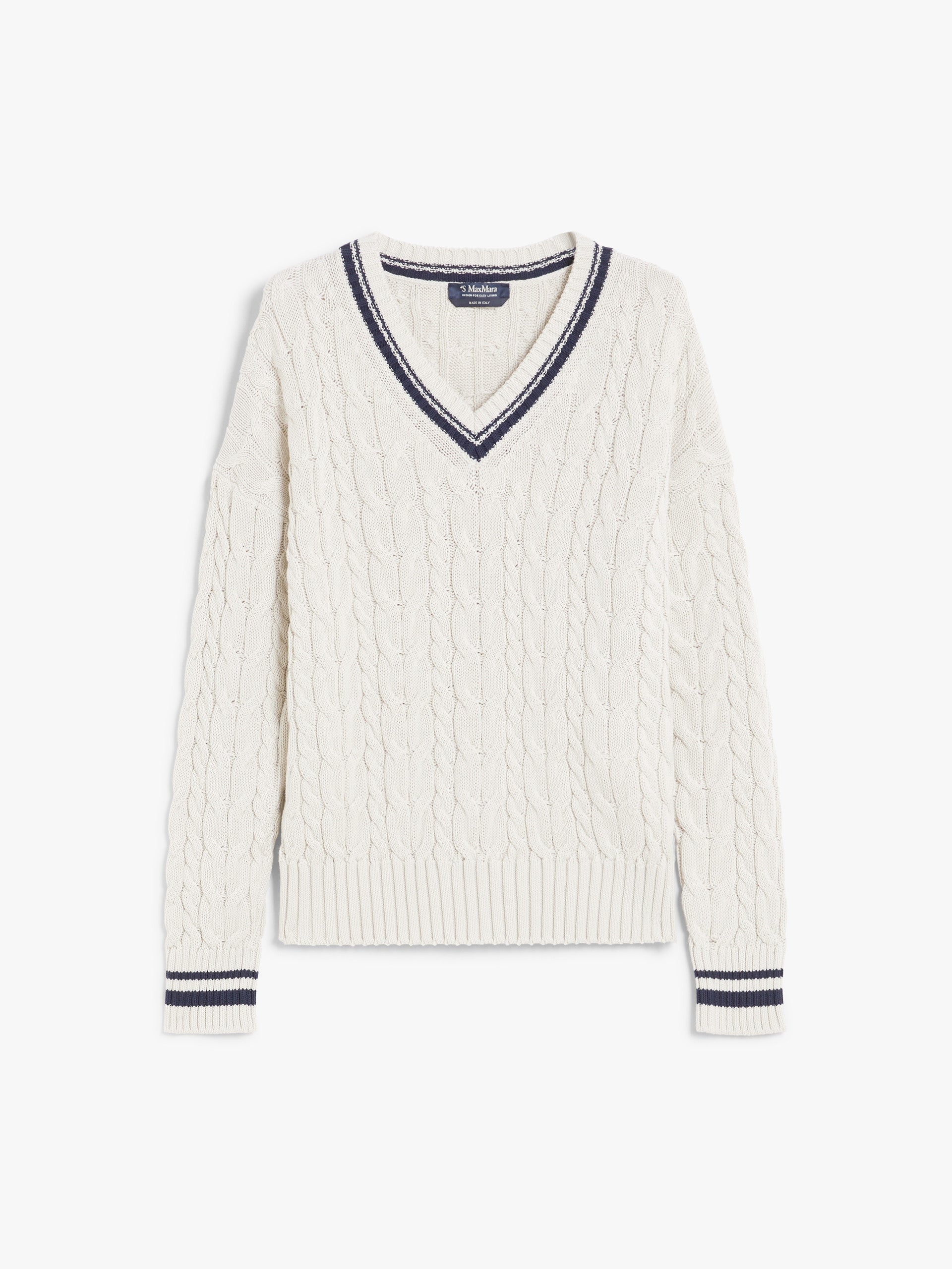 Cotton yarn V-neck sweater featuring a multi cable-knit pattern. The comfort-fit model boasts a two-tone tennis-look rib-knit neckline and cuffs, in addition to long low set-in sleeves. Rib-knit hem.
