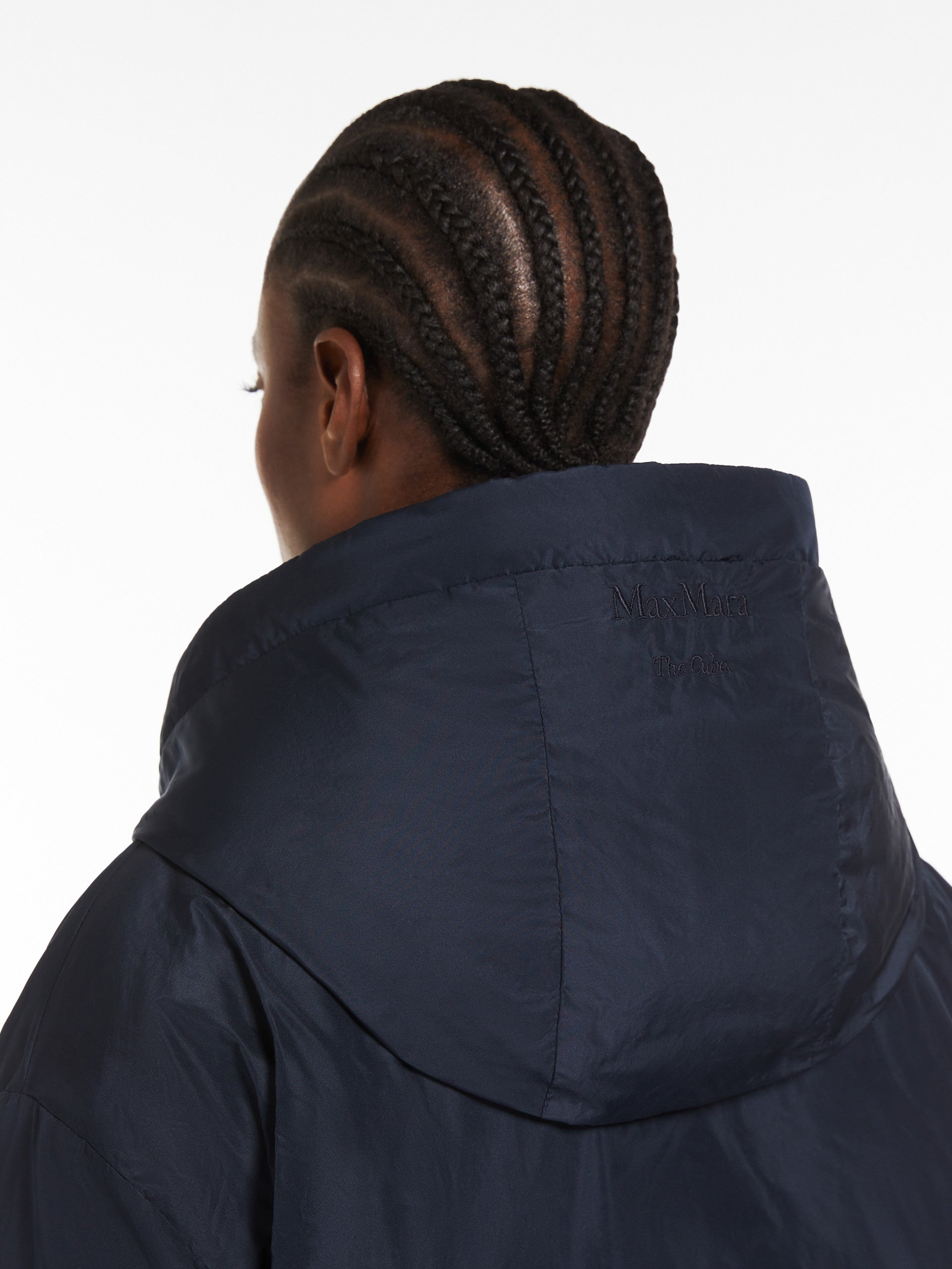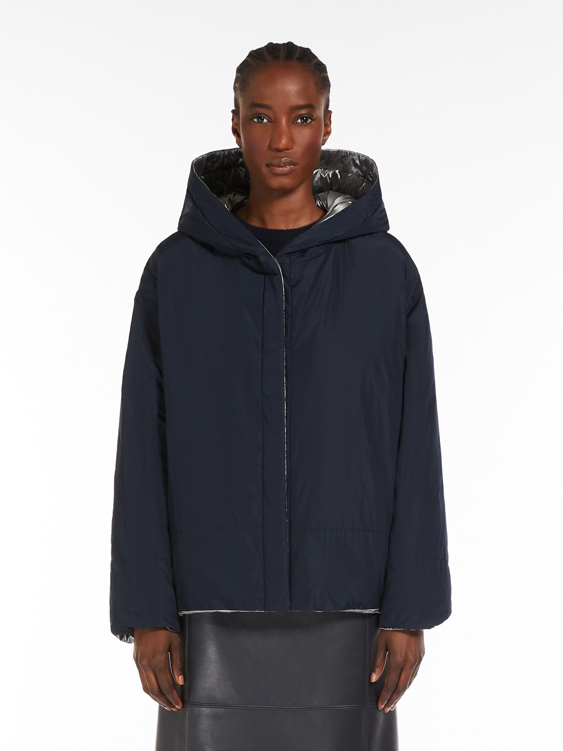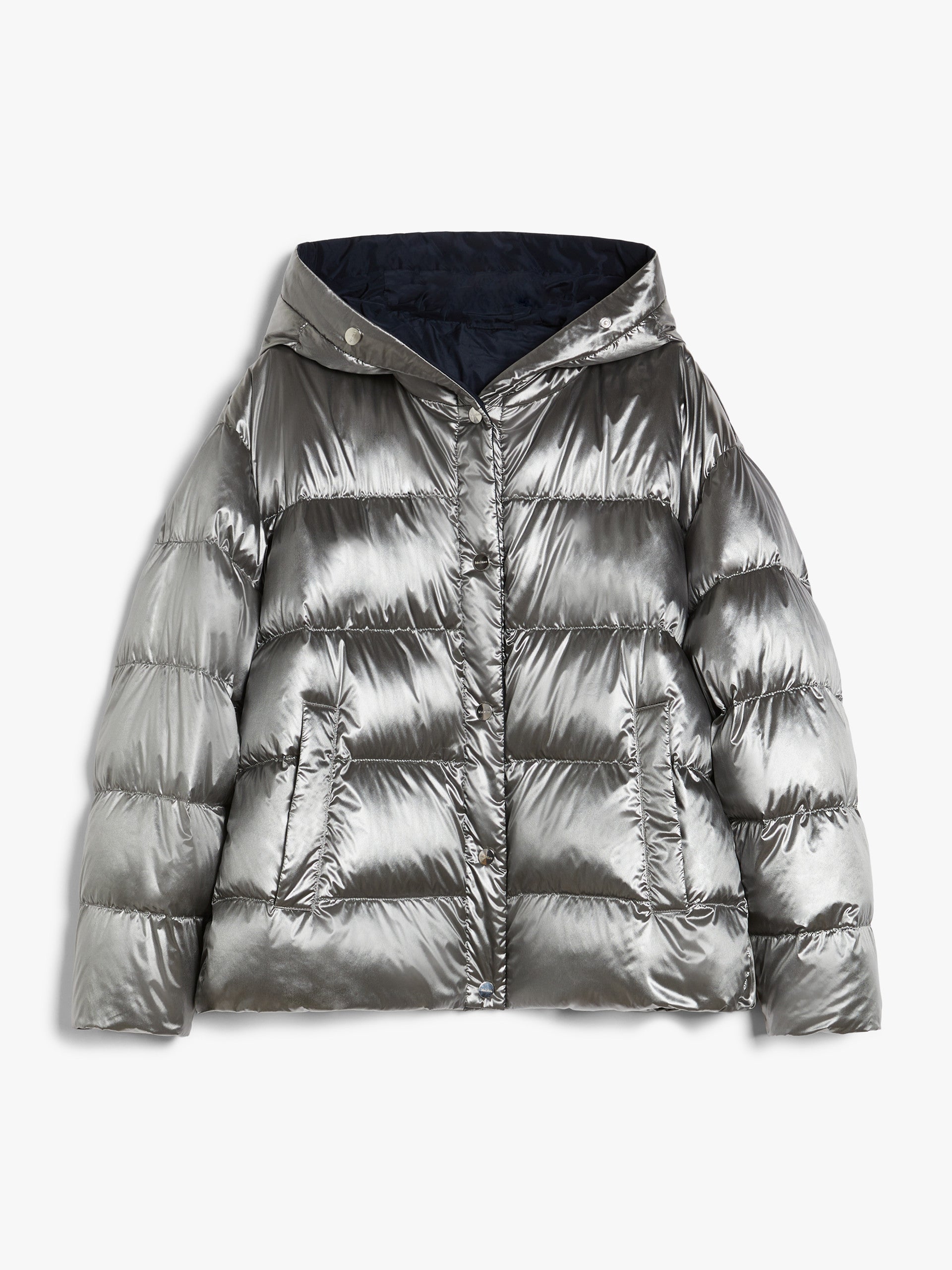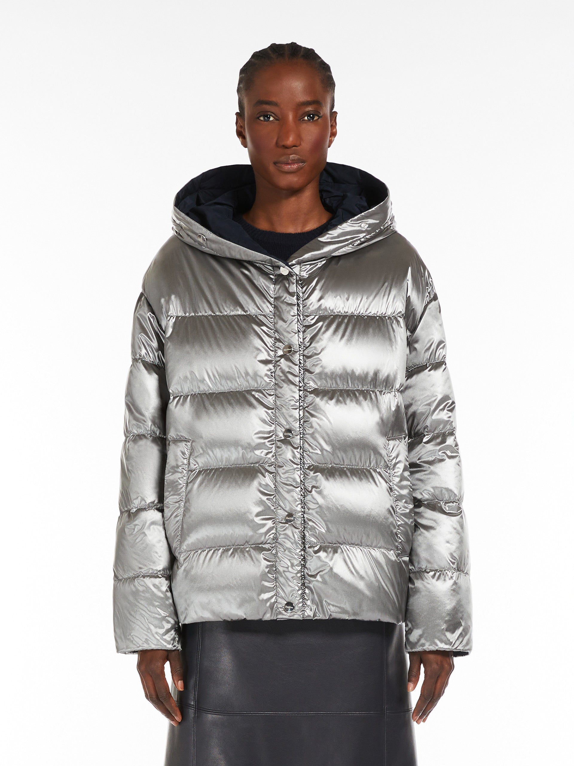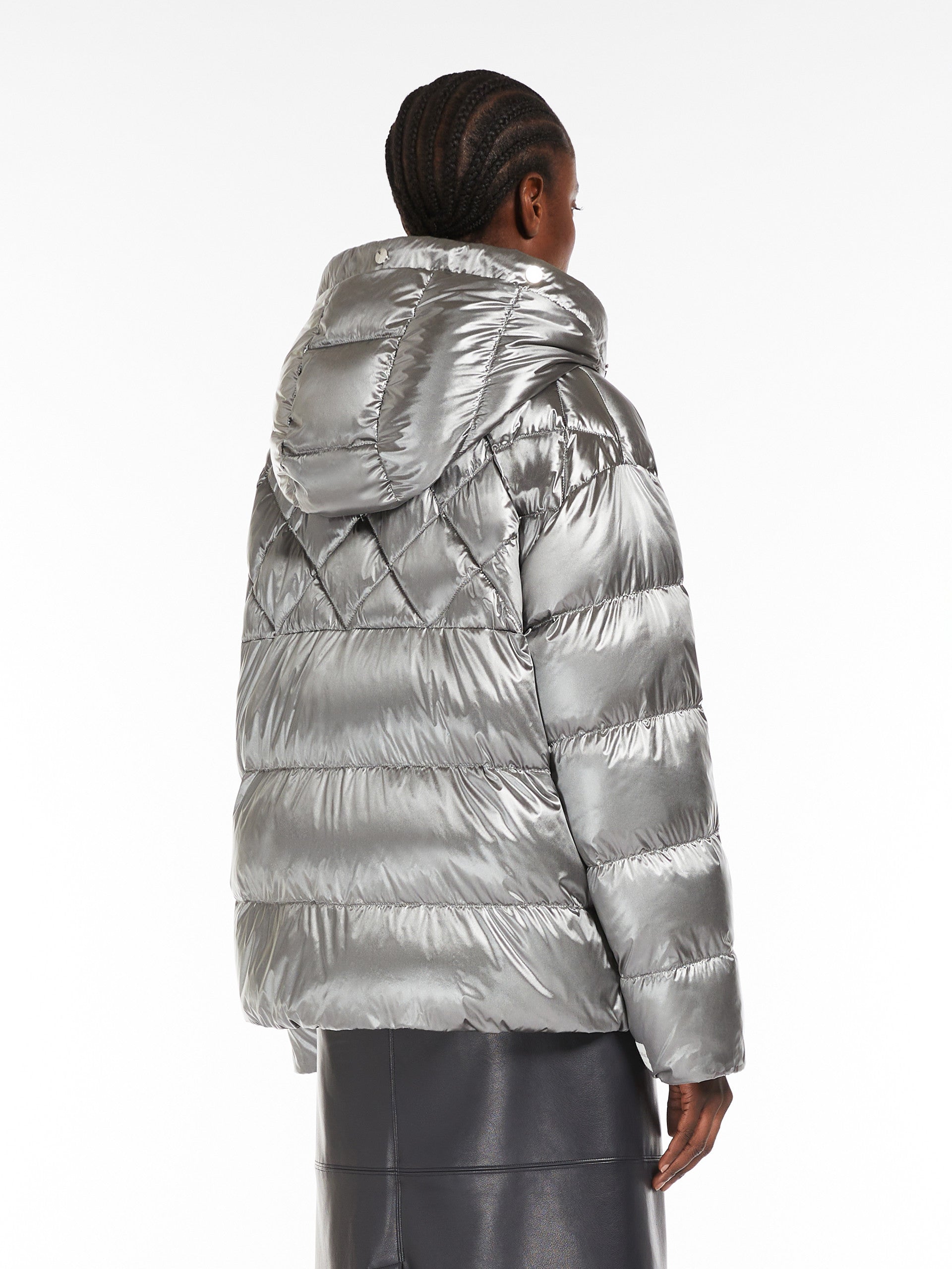 Short goose-down jacket made of iridescent water-repellent technical canvas with an all-over diamond quilted pattern. The style features a high neck with a jacquard logo tape drawstring, long sleeves with dropped shoulders and buttoned welt pockets on the sides. Front zip closure.