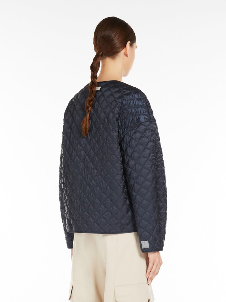 Short reversible goose-down jacket made of iridescent, water-repellent, wet-look nylon canvas, with hood and dropped-shoulder sleeves. One side features a quilted horizontal striped pattern with diamond-shaped details on the back and buttoned welt pockets, the other is in completely smooth technical micro-taffeta with inset side pockets and an embroidered logo on the hood. Fastened with snap buttons top-to-bottom, including on the hood on the quilted side.