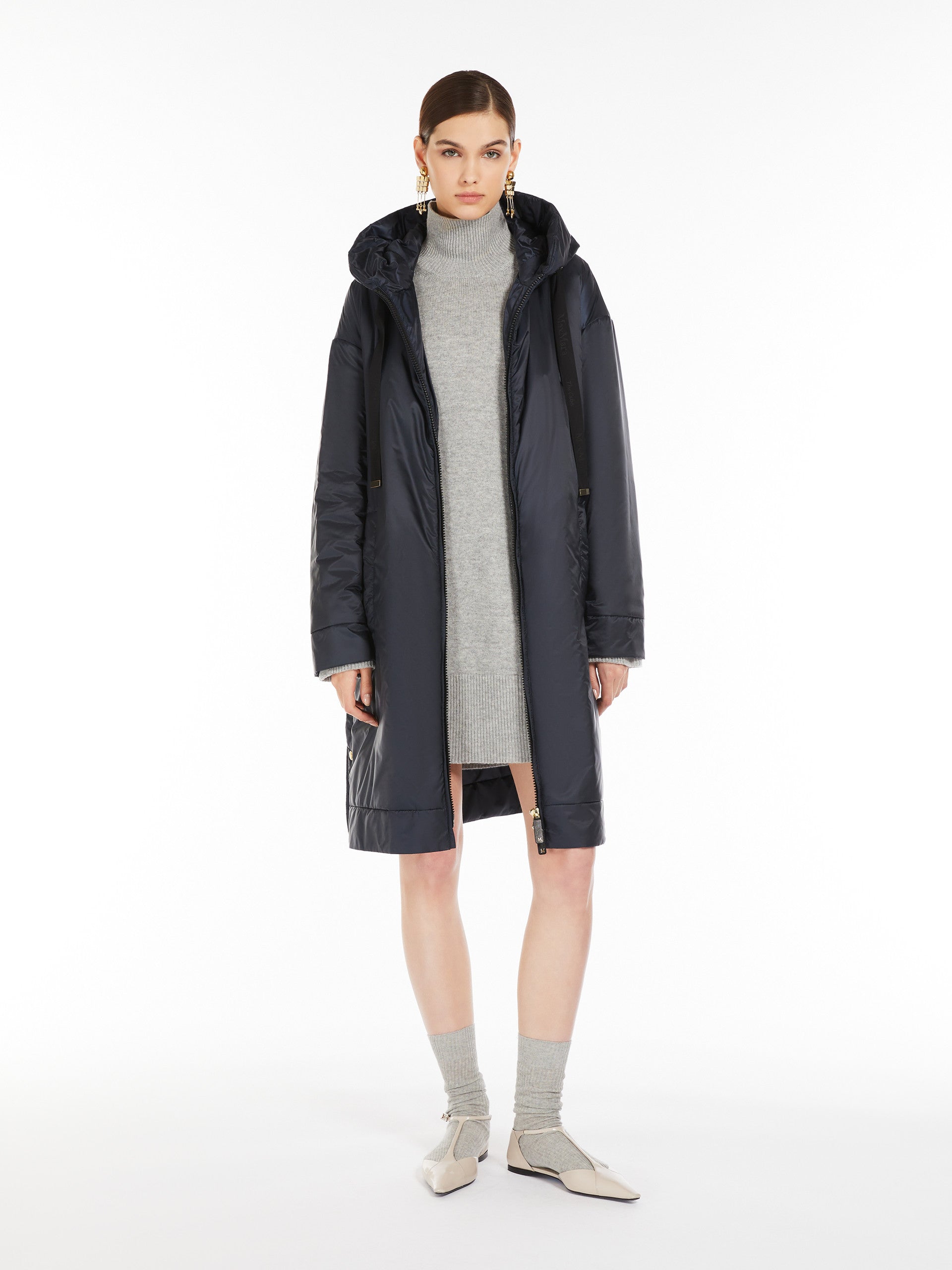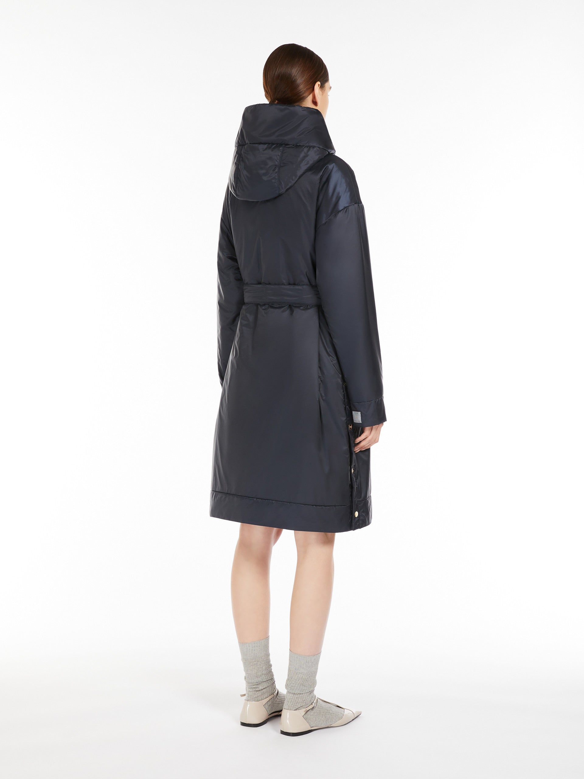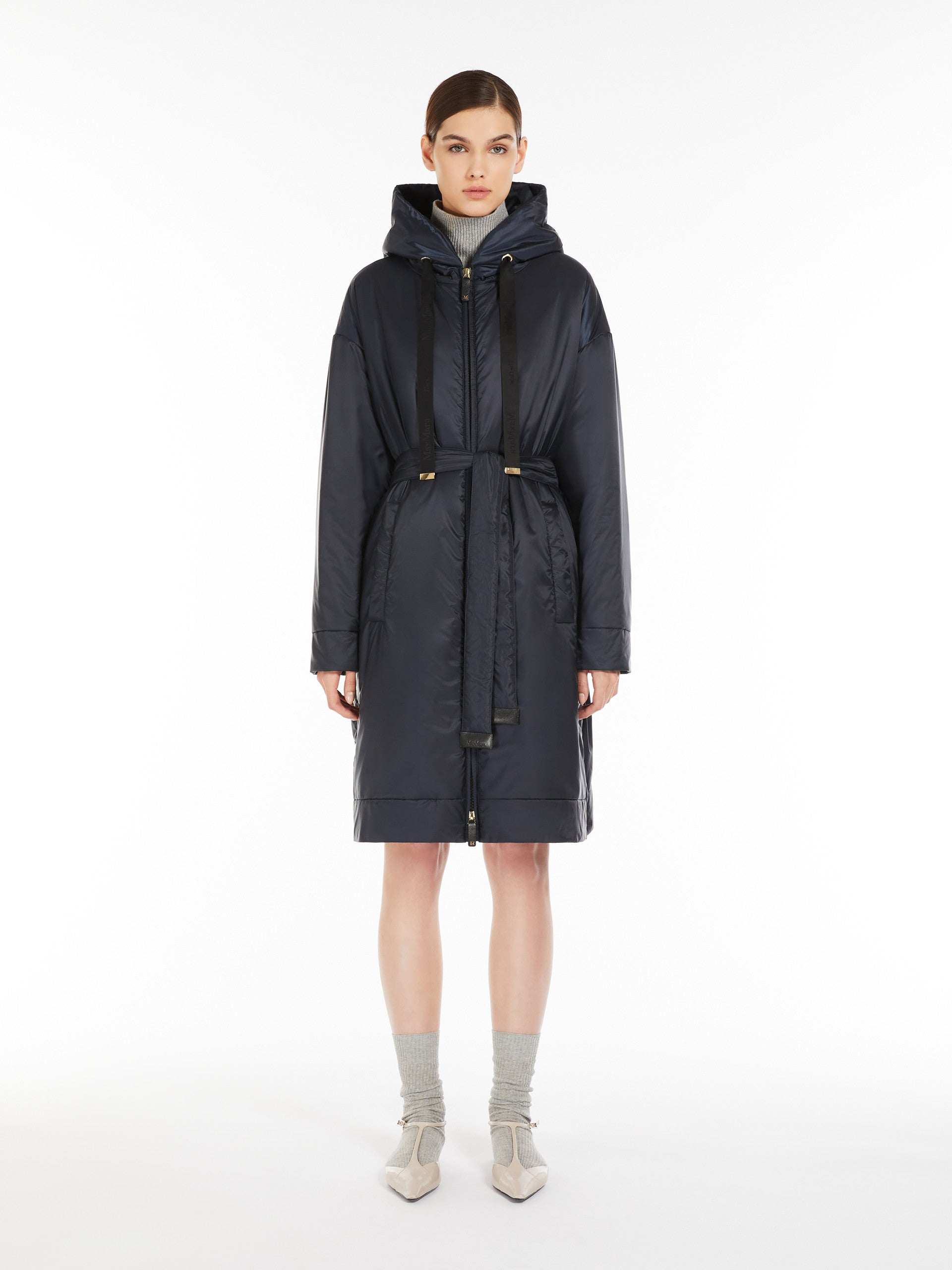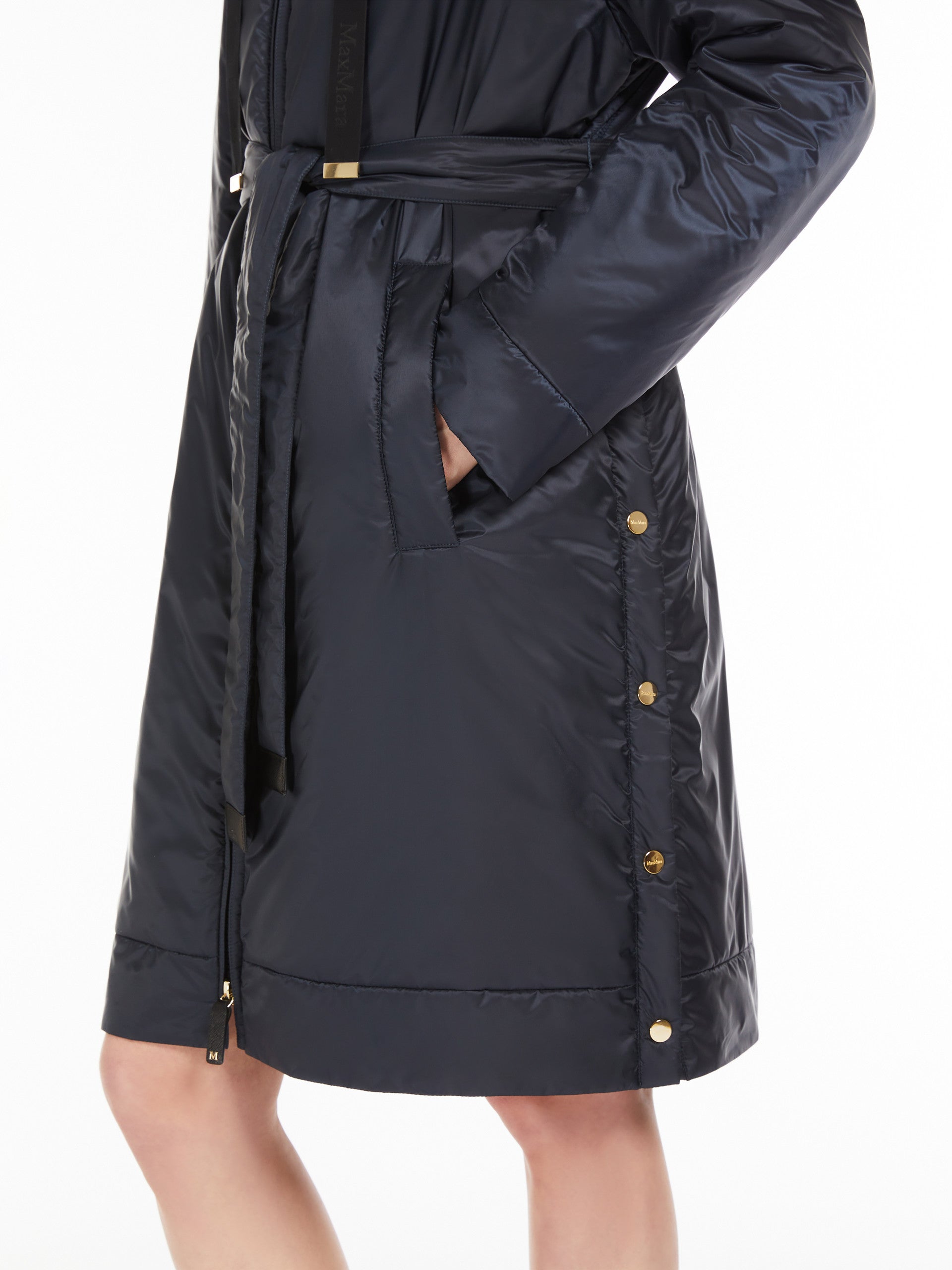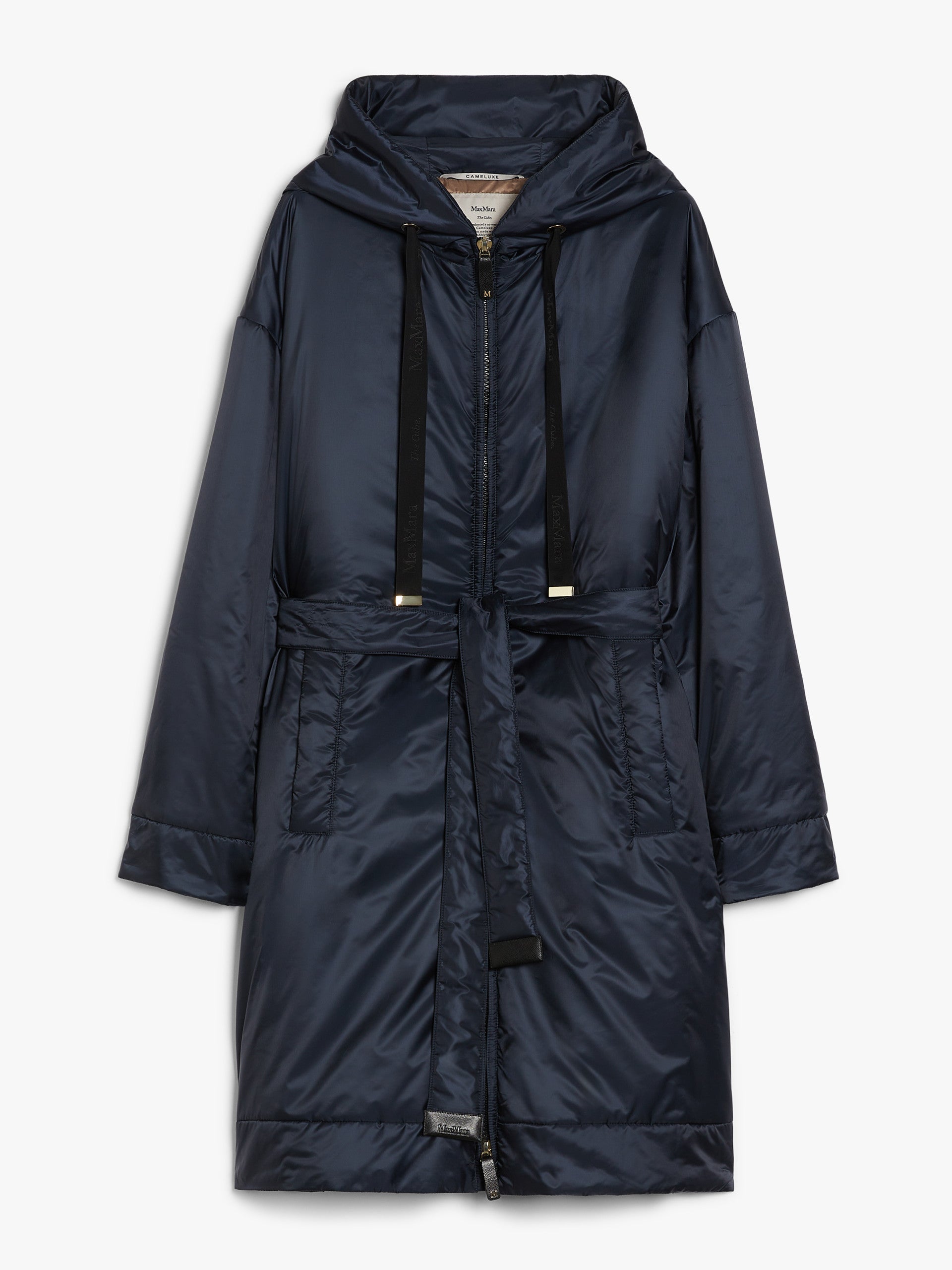 Midi padded parka in water-repellent technical canvas featuring a drawstring hood, complete with branded jacquard ribbons. The model boasts drop-shoulder long sleeves, welt side pockets and an adjustable internal drawstring at the back of the waist. The matching belt accentuates the figure, whilst the press stud-fastening side slits adjust the fit. Zip fastening with a leather pull-tab. Comes with a travel-perfect matching shopping bag. The CameLuxe padding sets the model apart: a new frontier as far as upcycling processes are concerned, since any surplus material leftover from cutting the pure camel fabrics for our legendary coats is recovered. The fibres are then reused to create a special padding that boasts the same insulating properties as virgin materials.