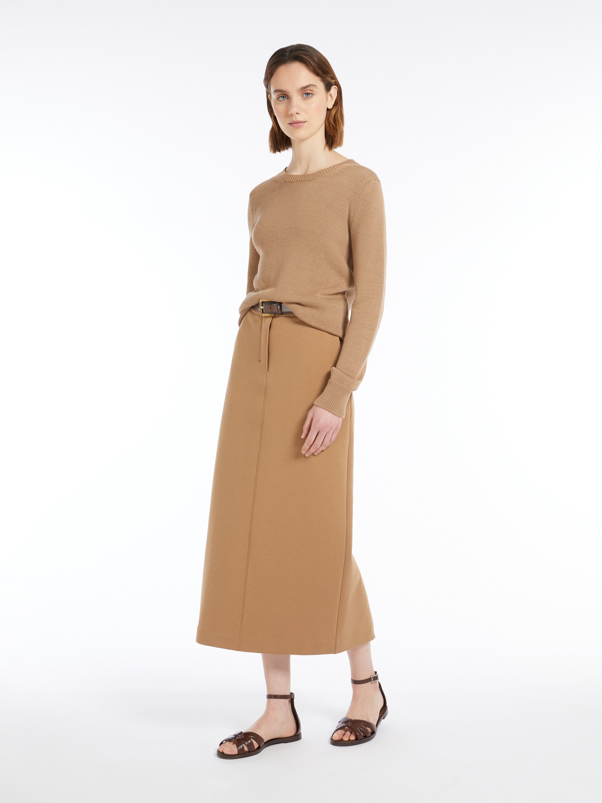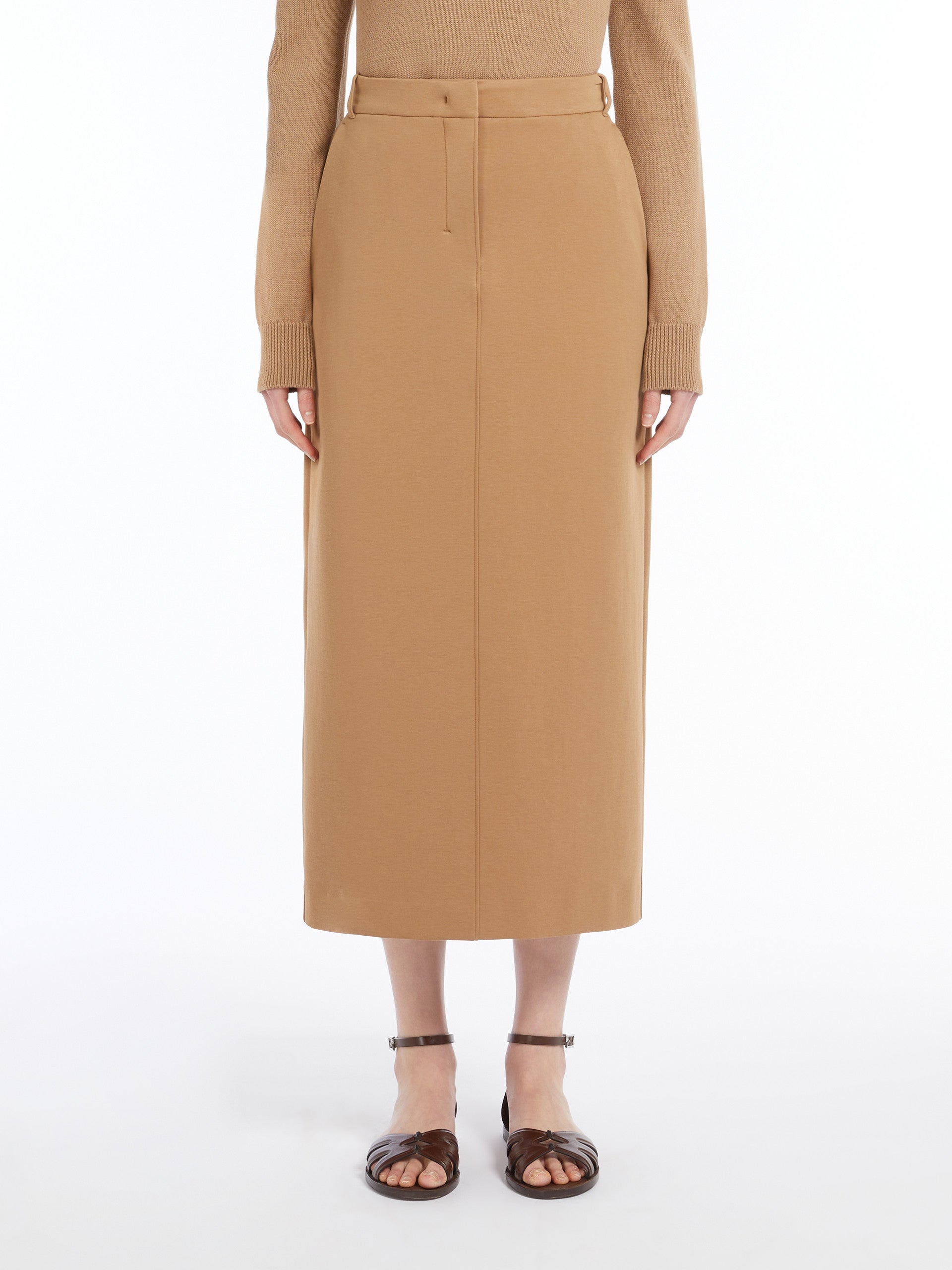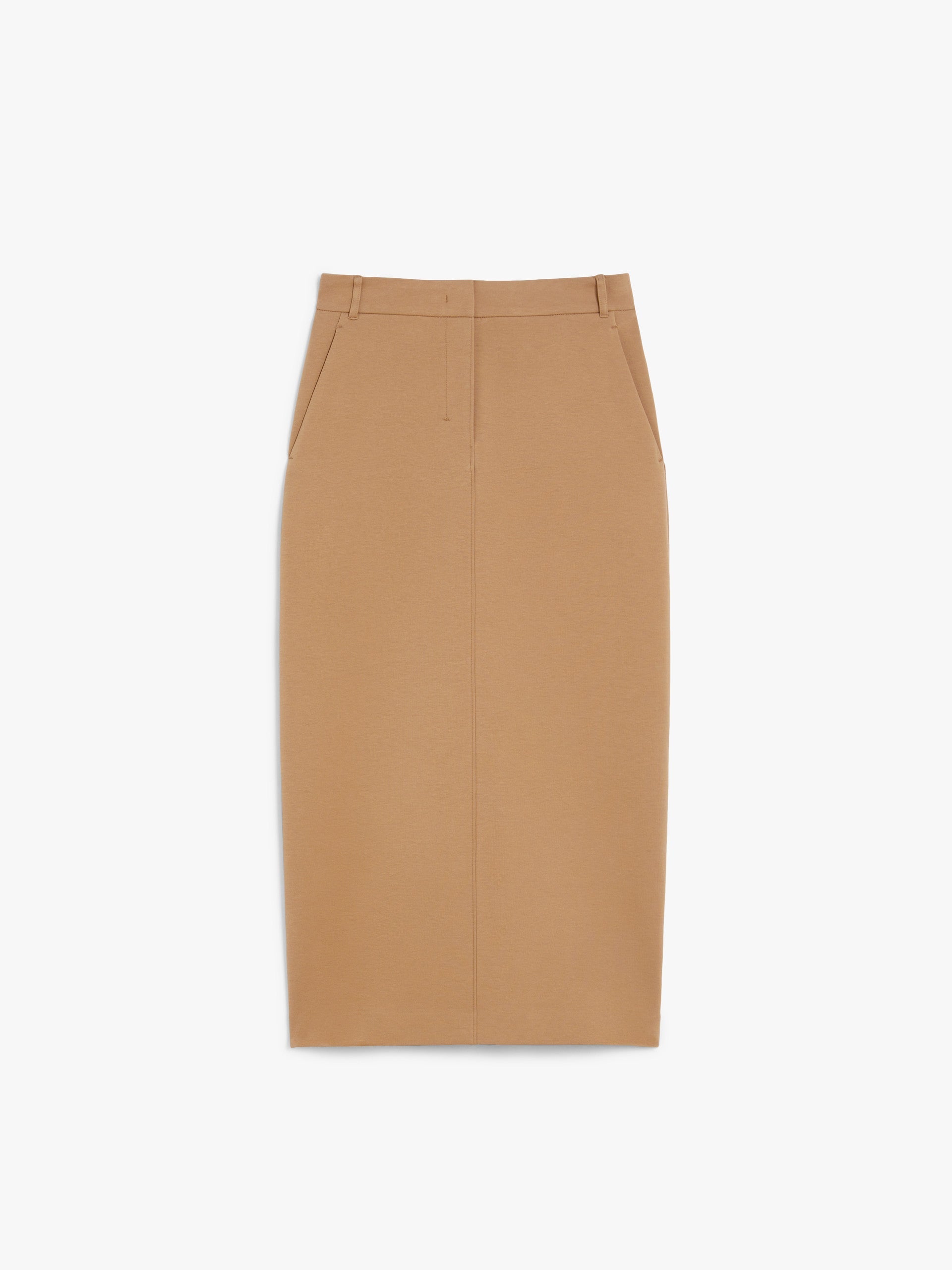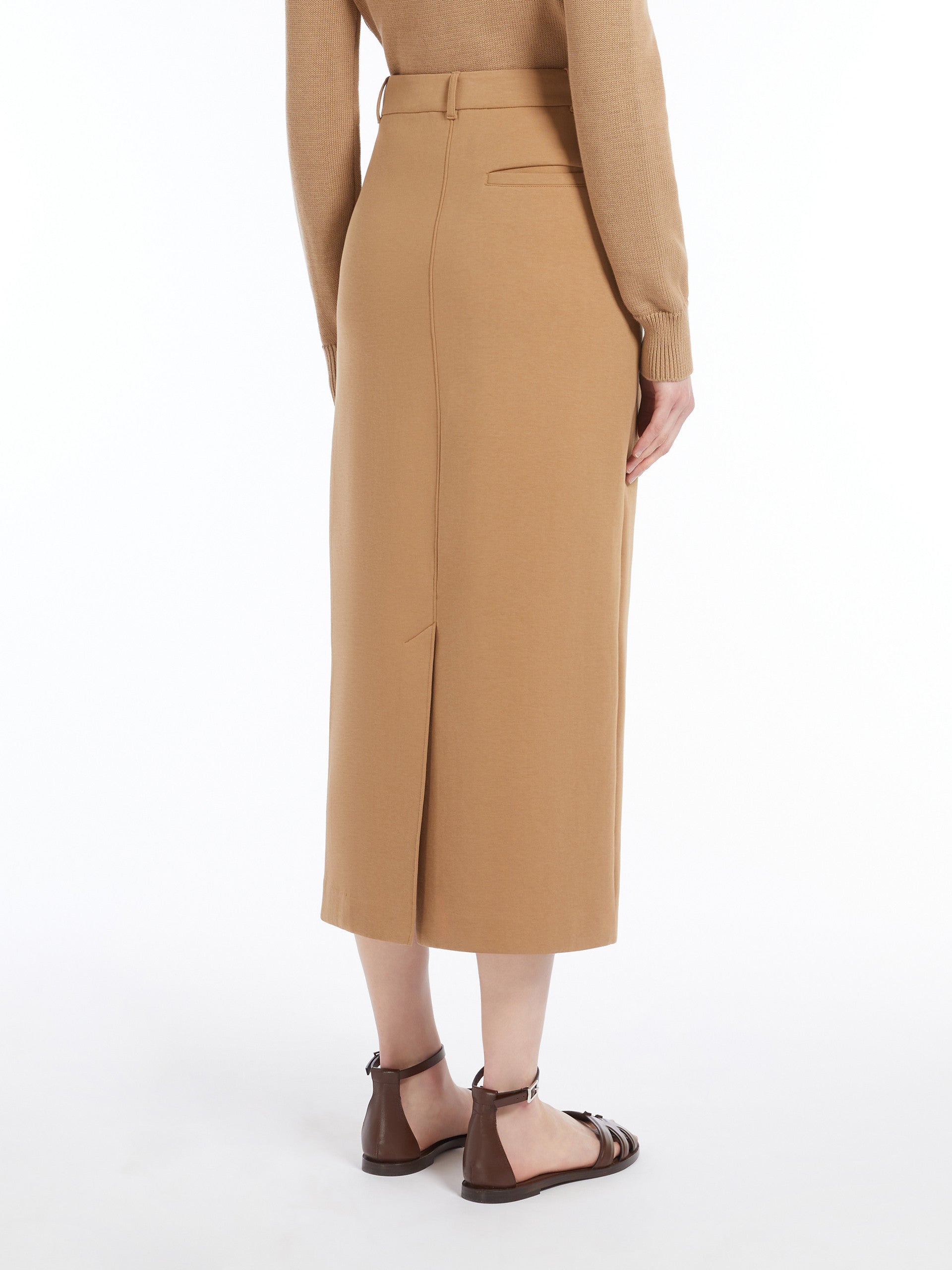 Midi pencil skirt in scuba jersey fabric featuring a central rear slit. Embellished with in-seam side pockets and a welt rear pocket. Front fastening with a high-cut waistband and fly-covered zip and hook-and-bar fastening.