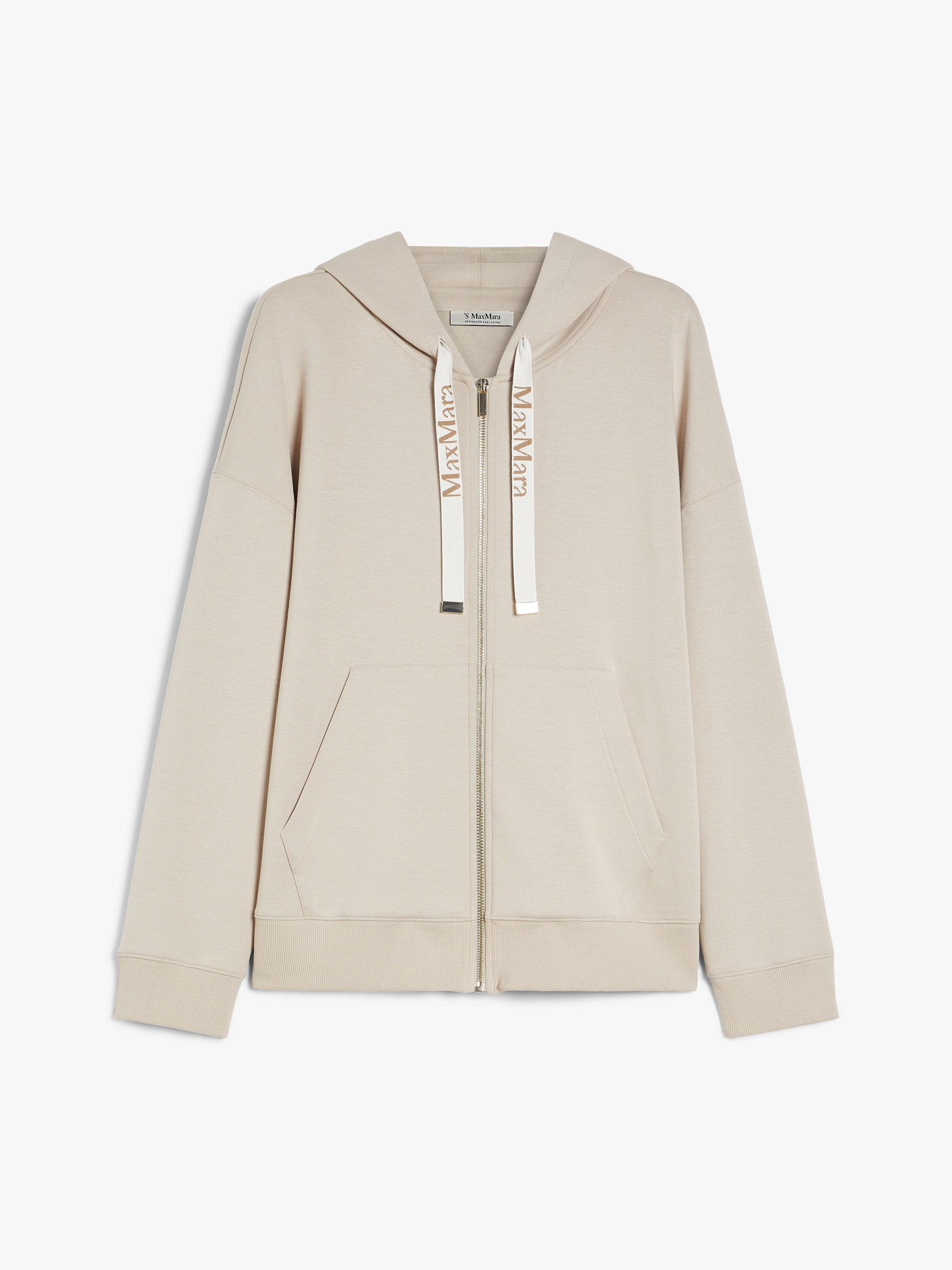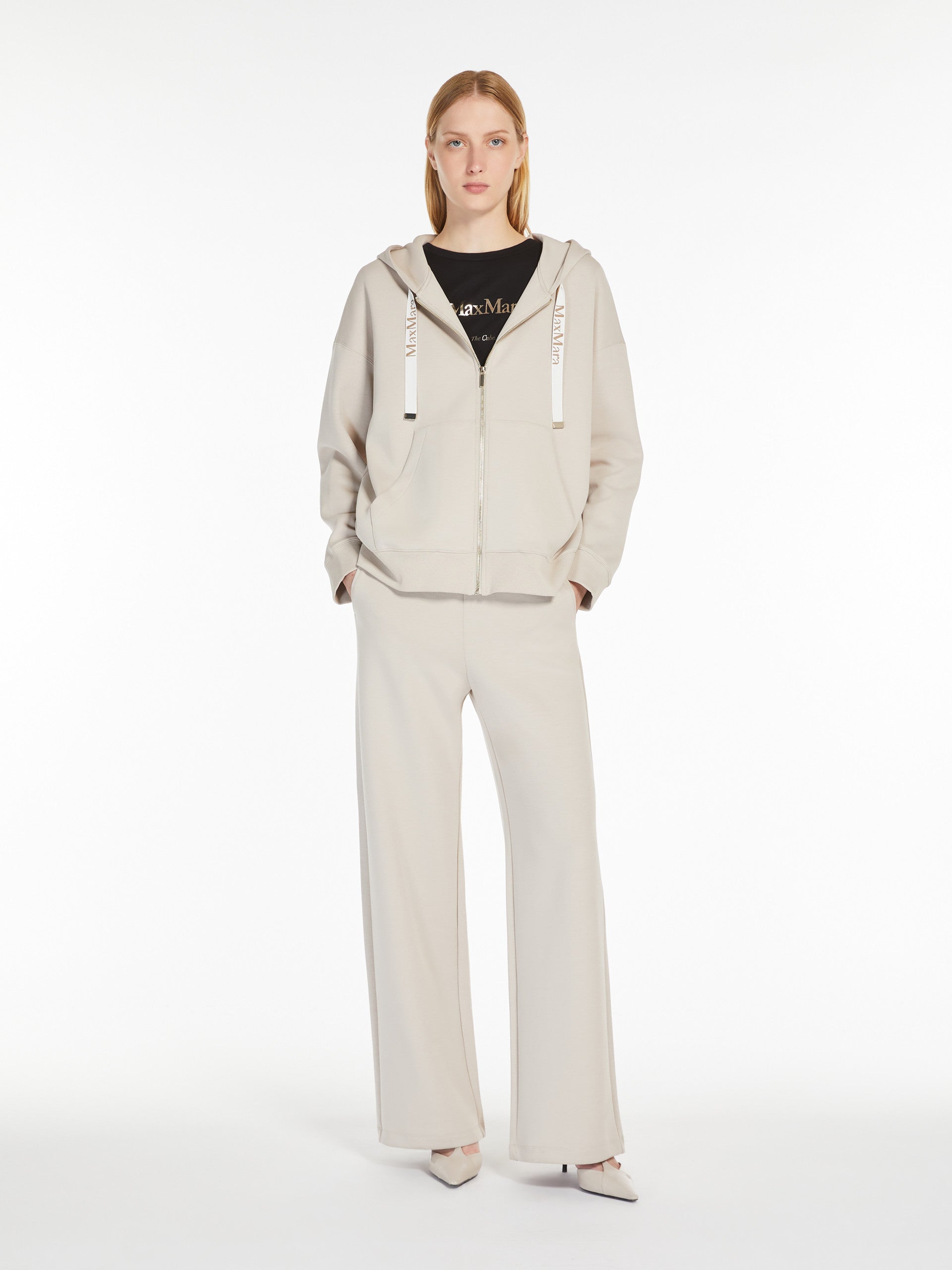 Sweatshirt in soft technical cotton jersey fabric featuring a drawstring hood with branded jacquard ribbon detail. The model boasts long low set-in sleeves and a kangaroo front pocket. Front zip fastening.