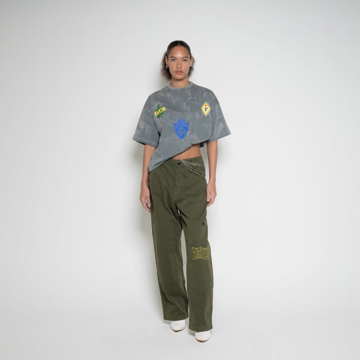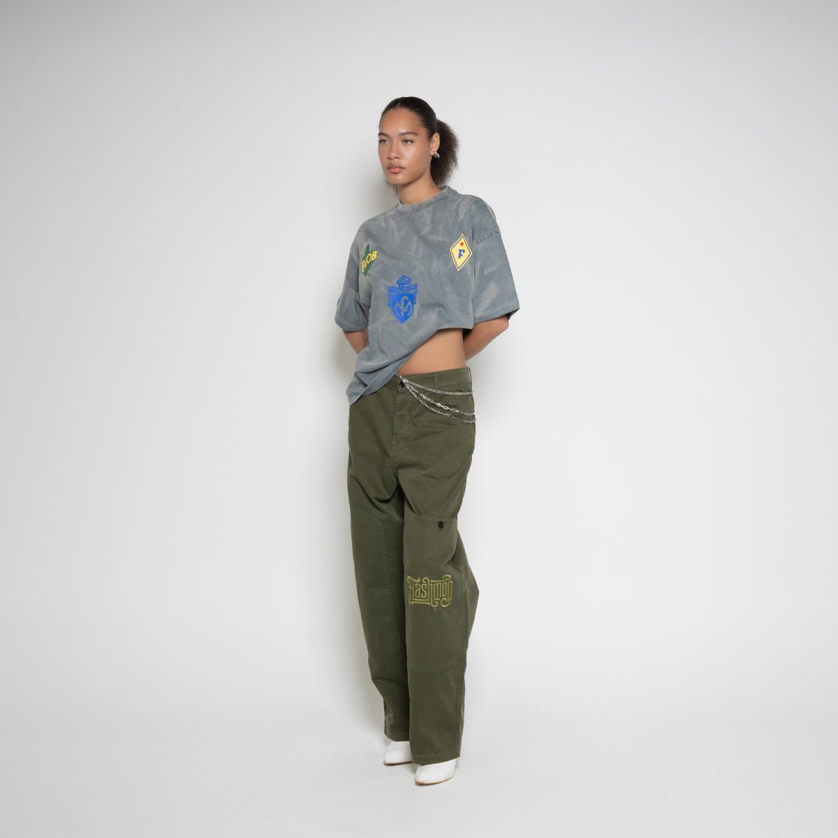 Embroidered leg graphic and detachable metal chain at the waist.