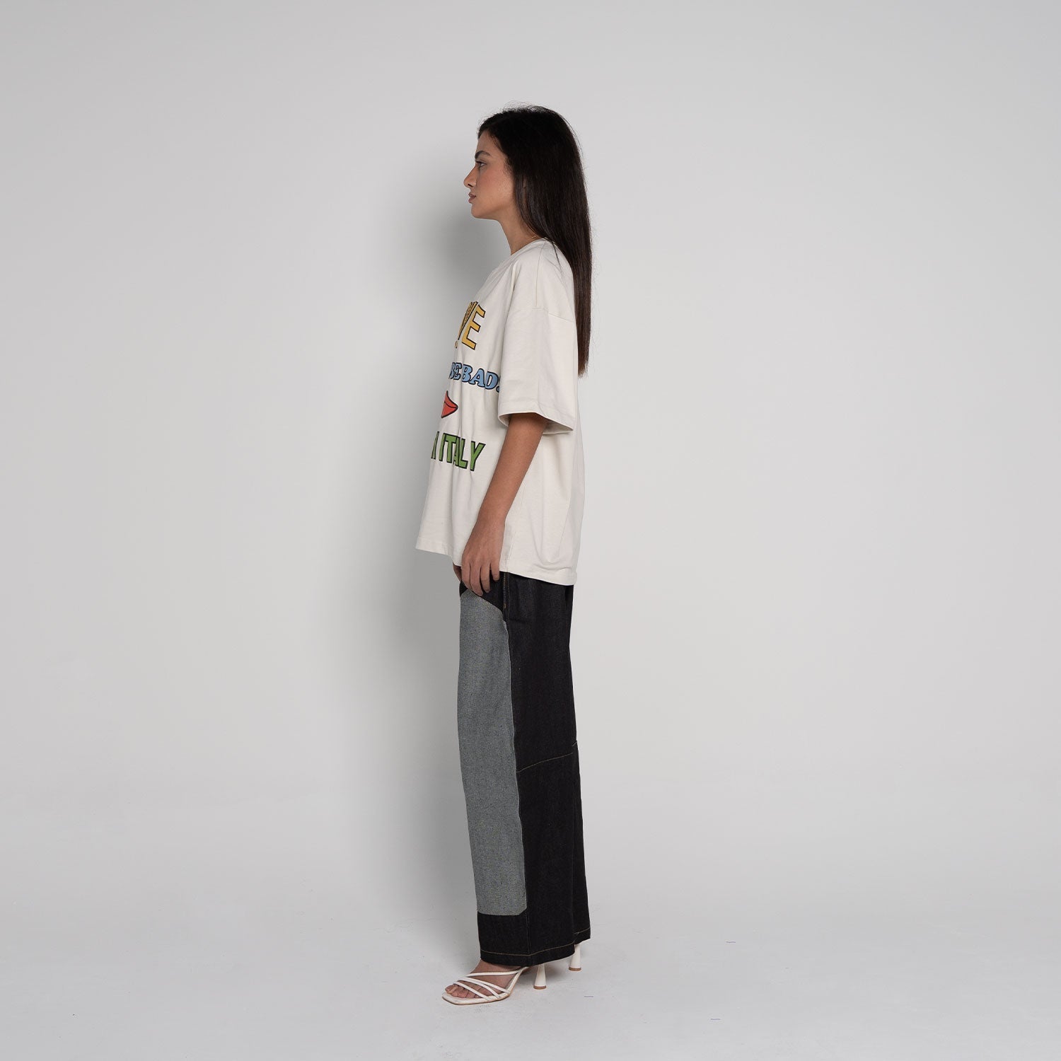This graphic T-shirt features a screen-printed “Love” text for a worn-in, expressive look.