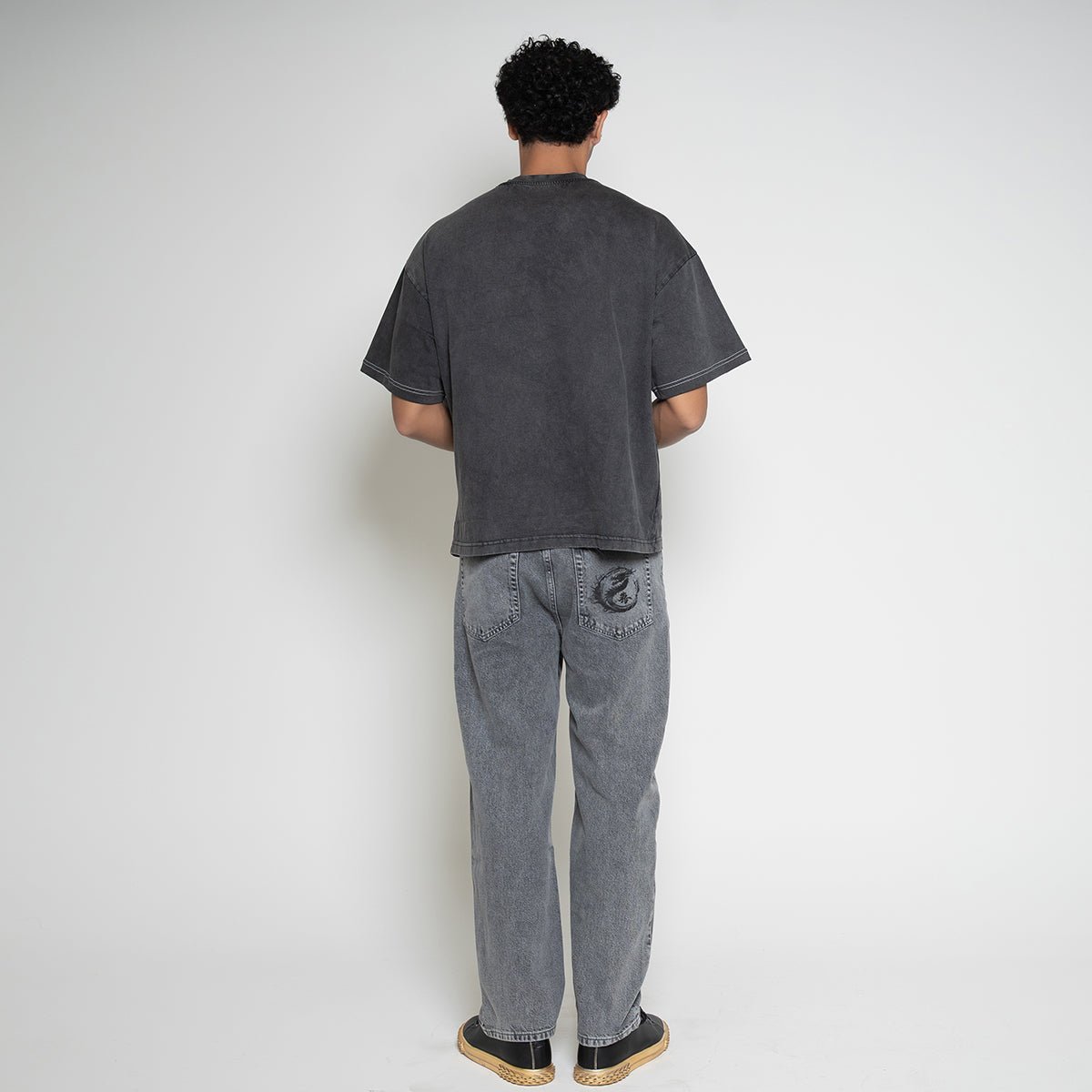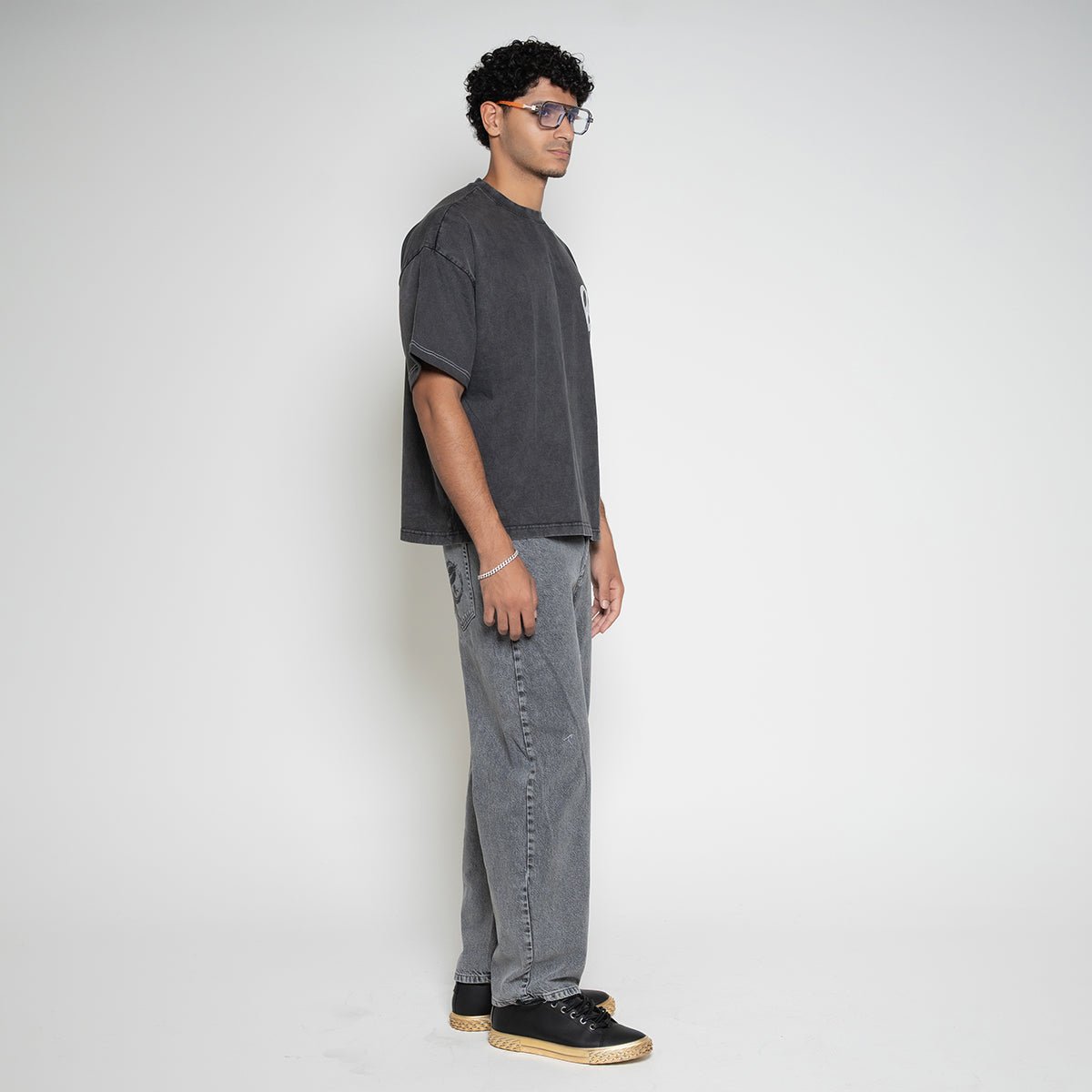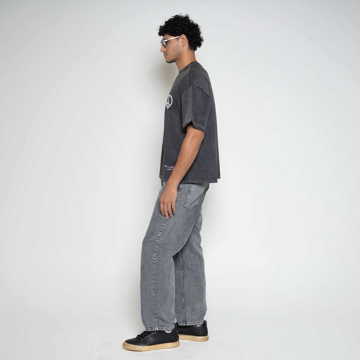 Oversized short-sleeve T-shirt in heavyweight cotton with a vintage black wash. Designed with a foil “Peace & Love” graphic at the chest.